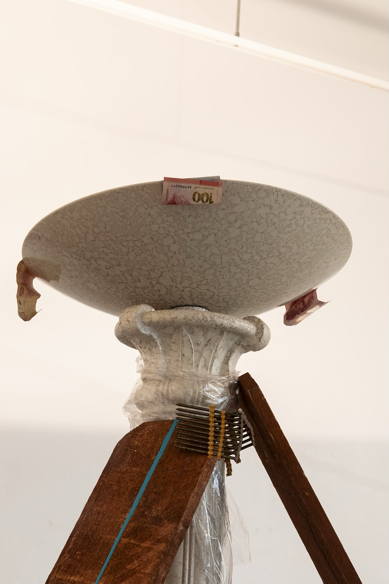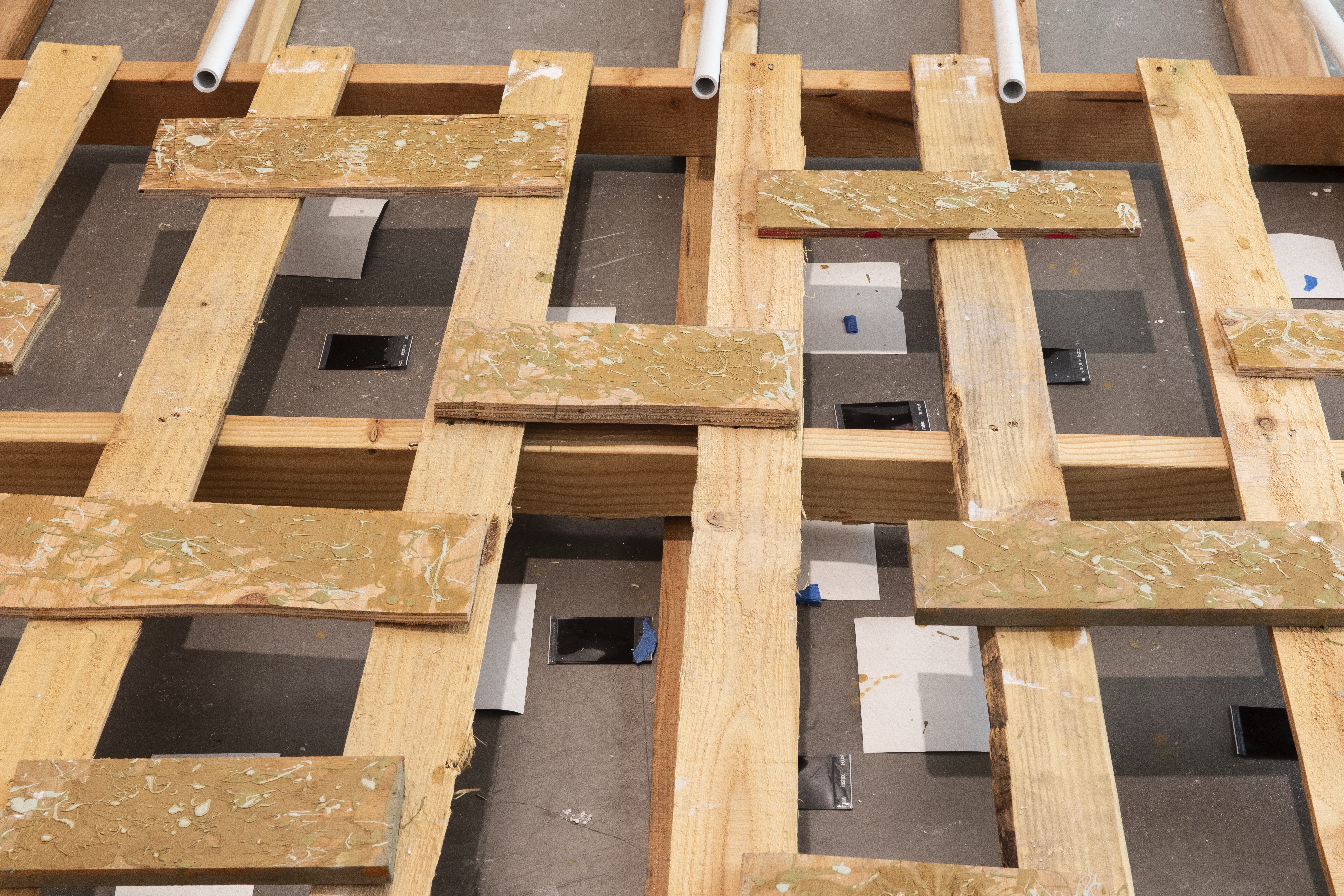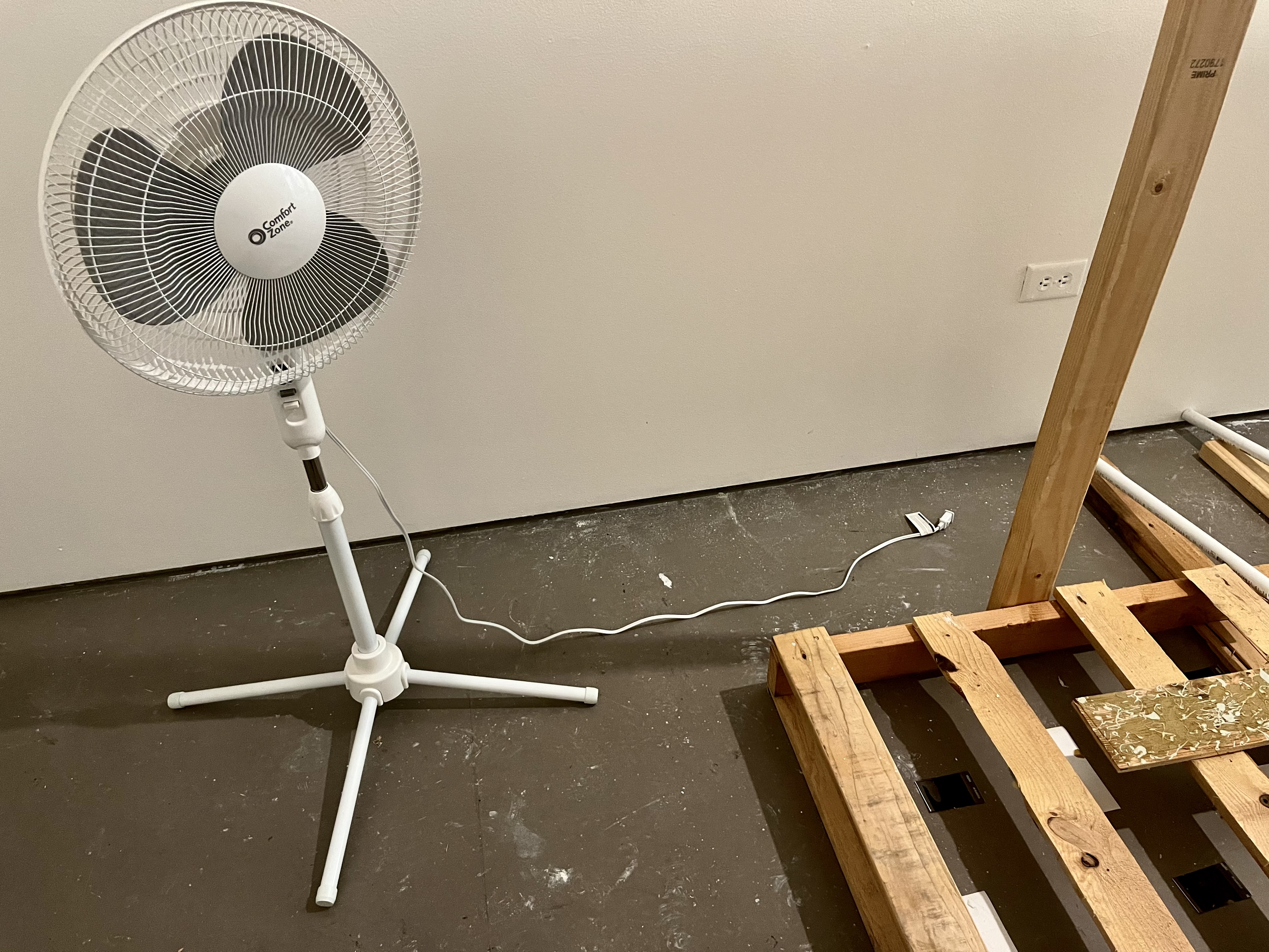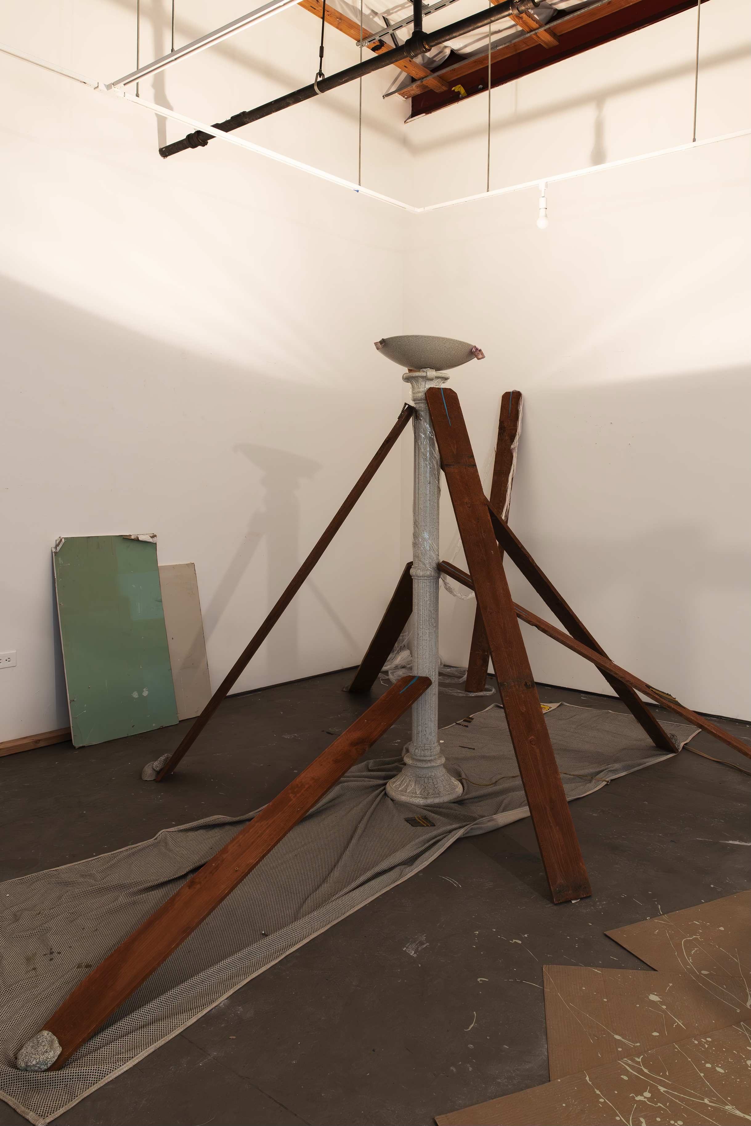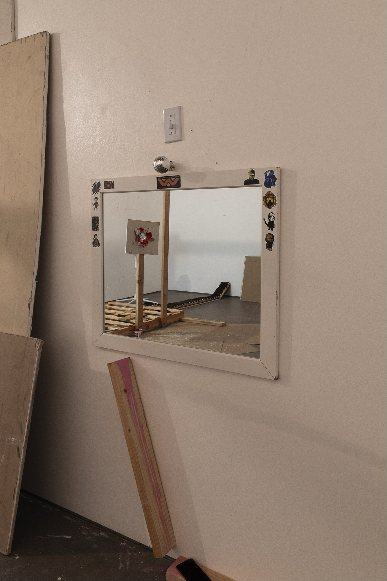 When the Lies Sound Truthful, 2024 Construction materials, wood pallets, air dry clay, house paint, vintage lamp, mirror, fan, light bulb, light switch, PVC pipes, Installation view, ArtCenter Spotlight Gallery, South Pasadena Photo: Aylee Rhodes and Lizeth Gonzalez