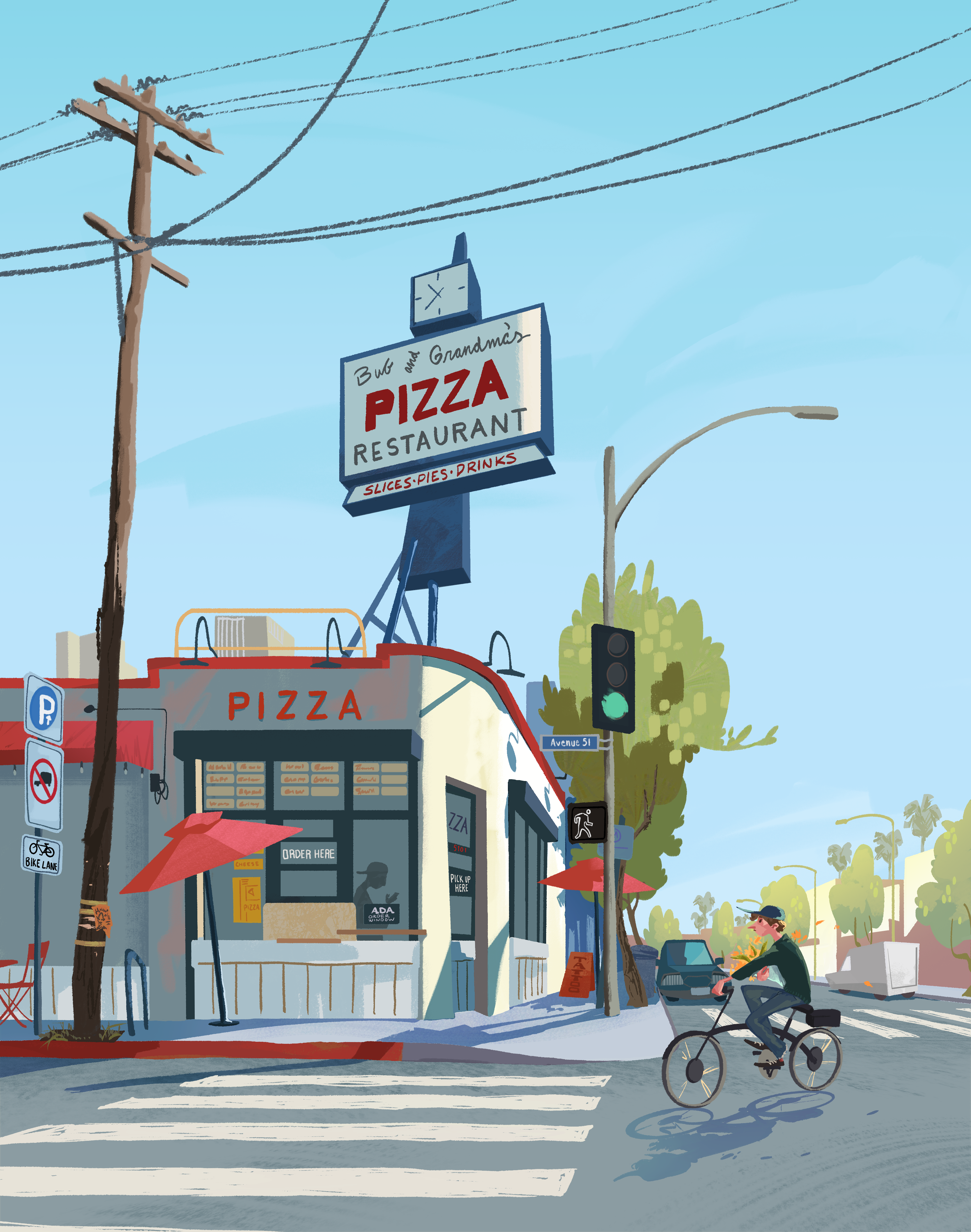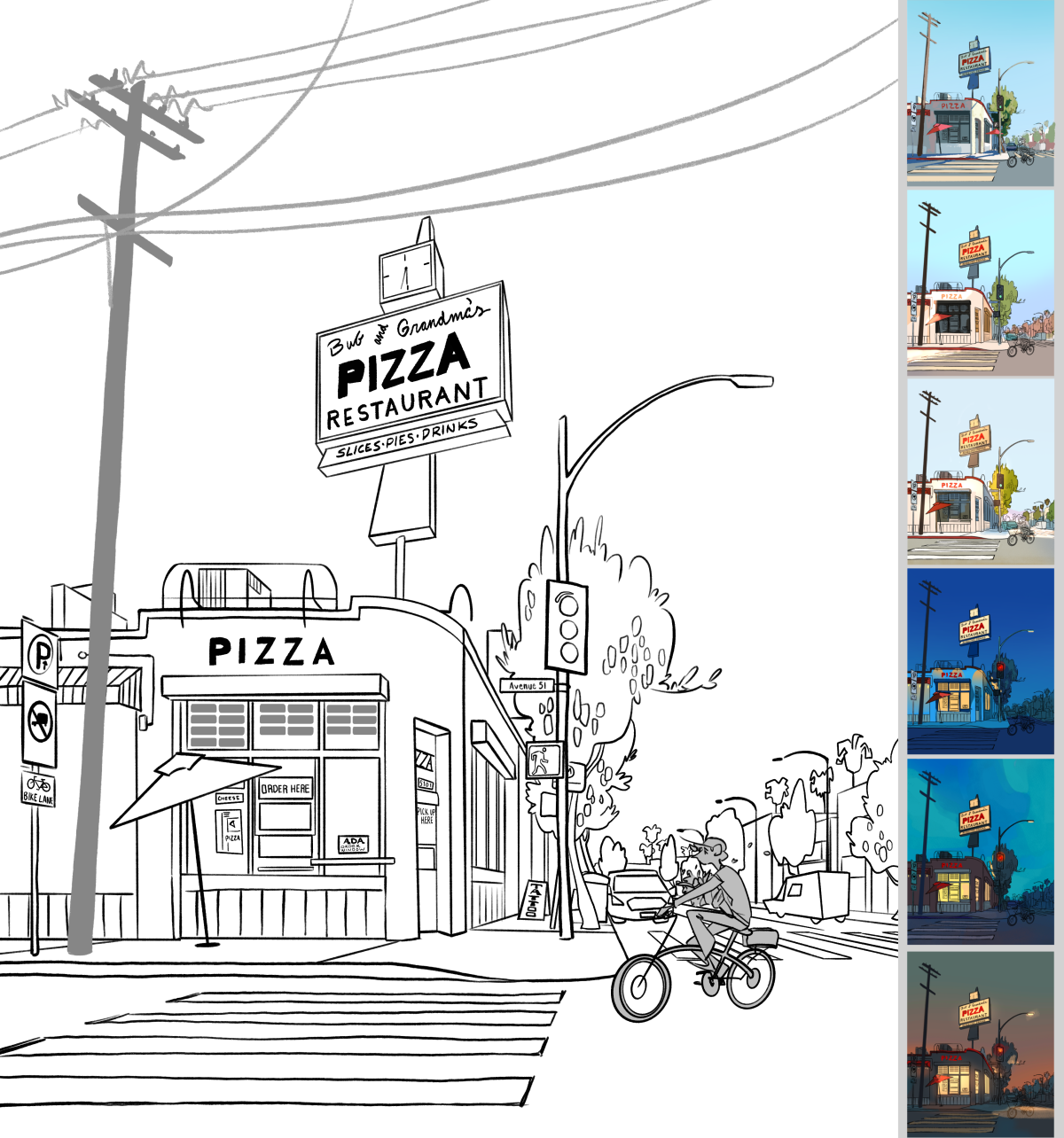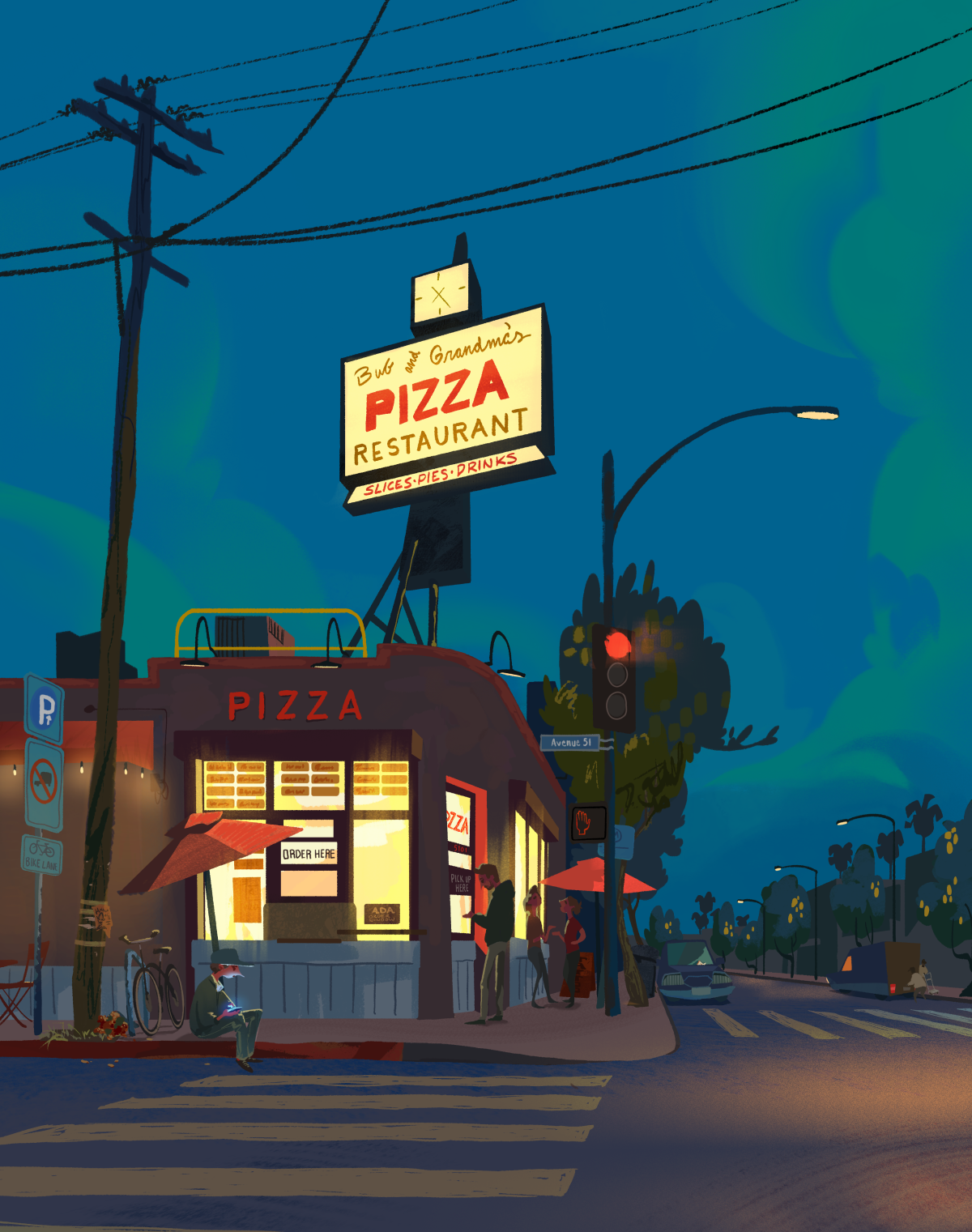 Illustrations depicting Bub and Grandma's Pizza Restaurant in day and night scenes.