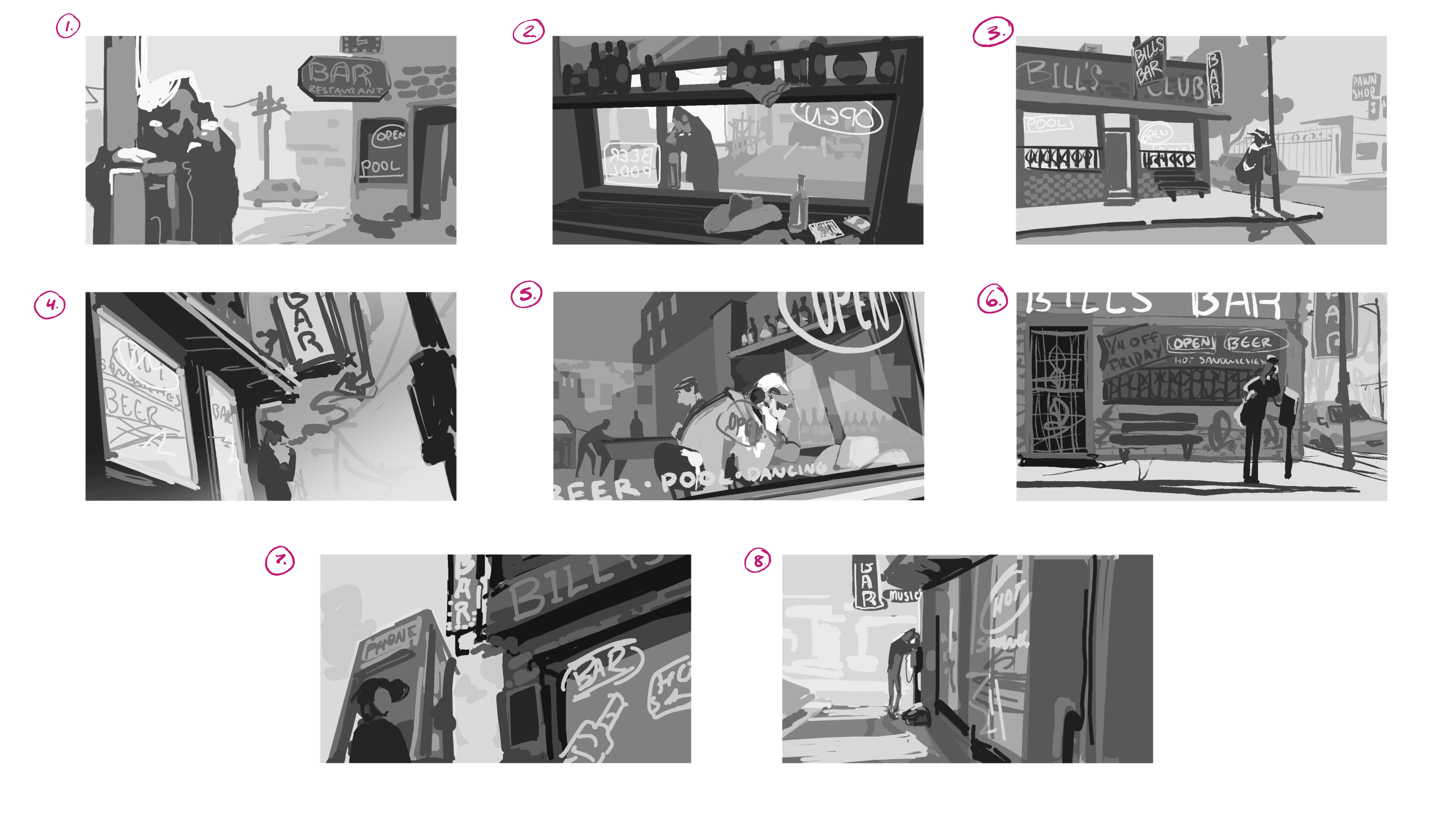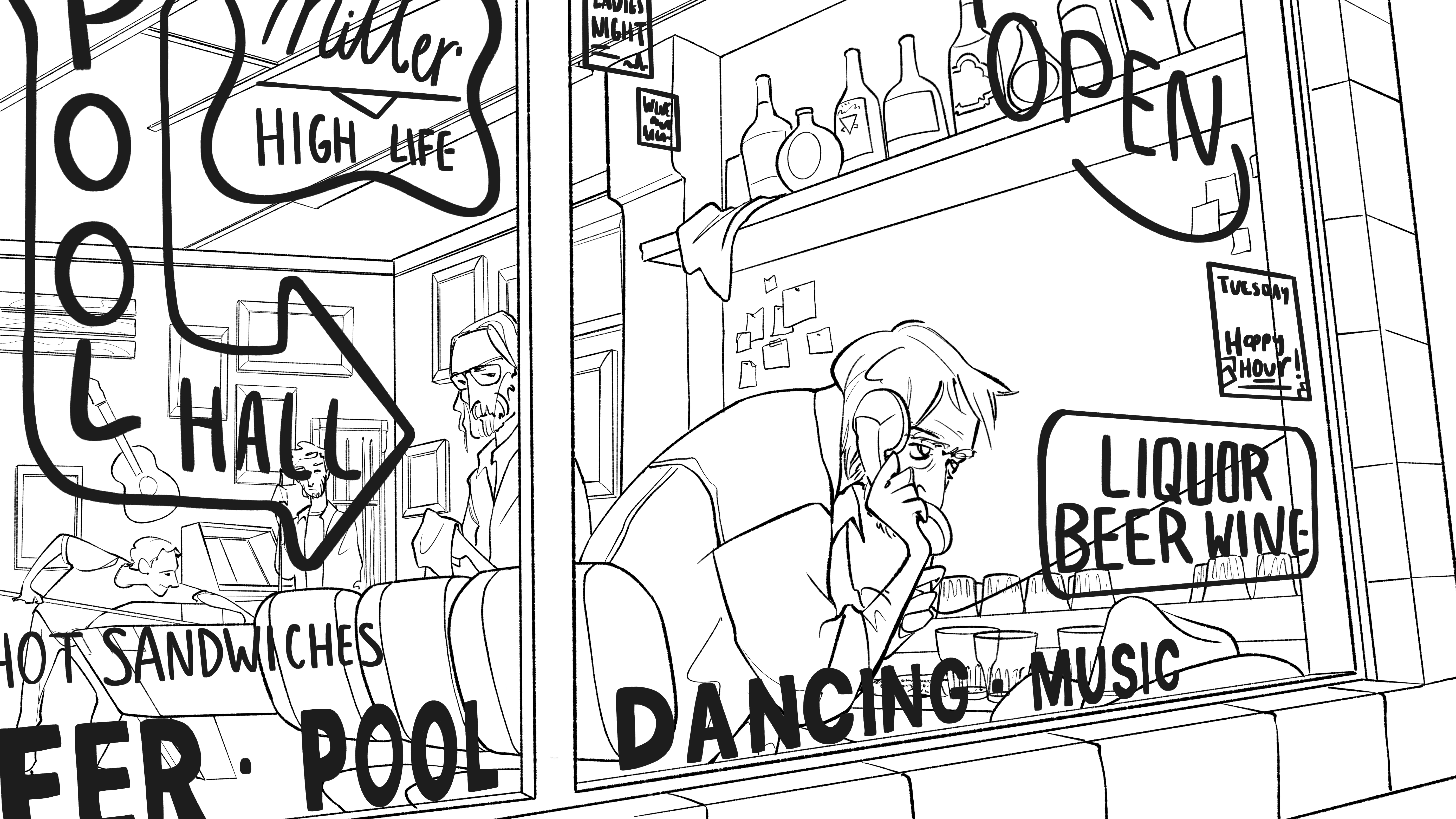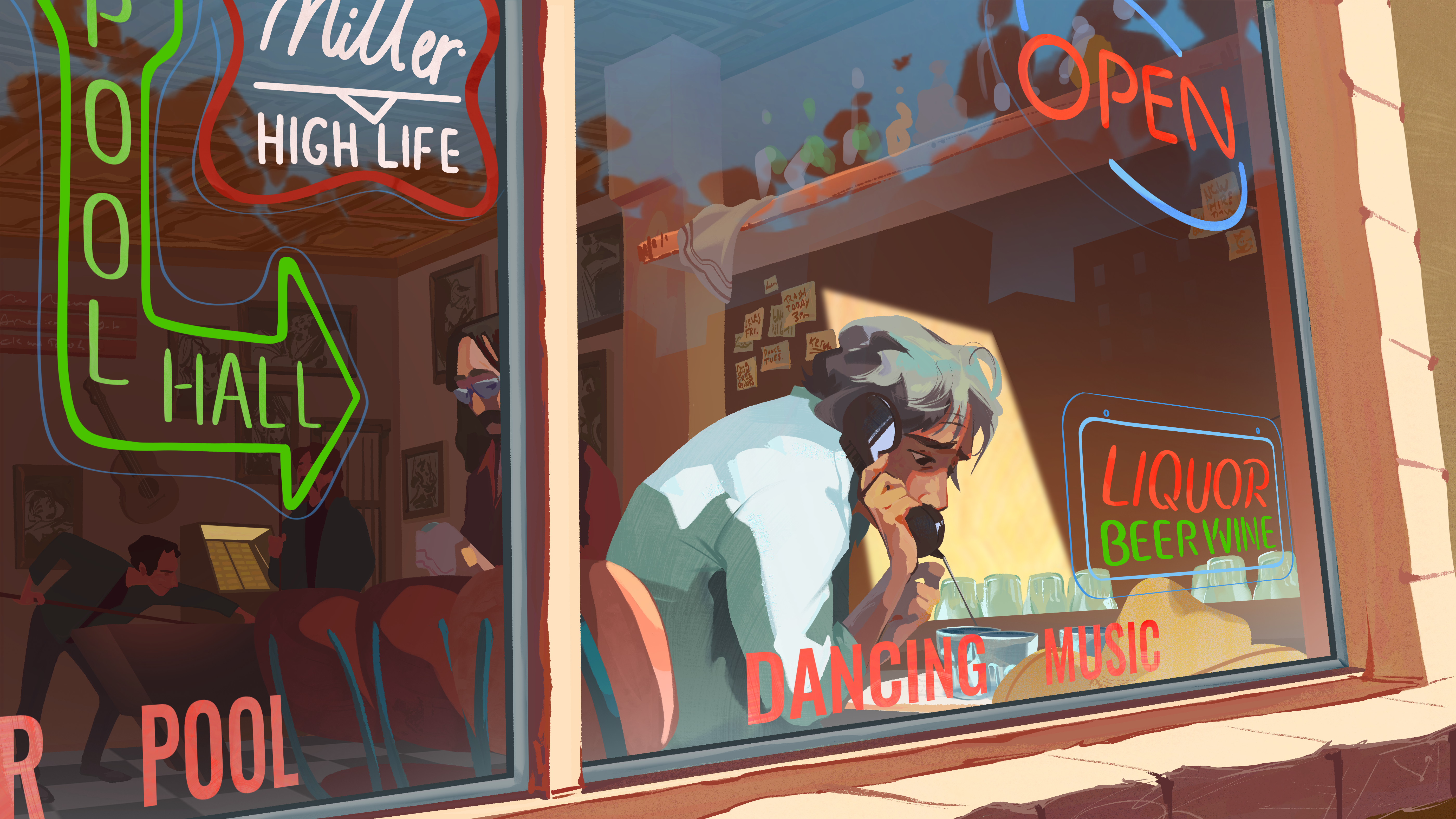 Narrative Illustration inspired by the song "Swinging Doors" by Merle Haggard. With a focus on signage and lighting, my goal was to create a mood of self-isolation in a loud and modernizing world.