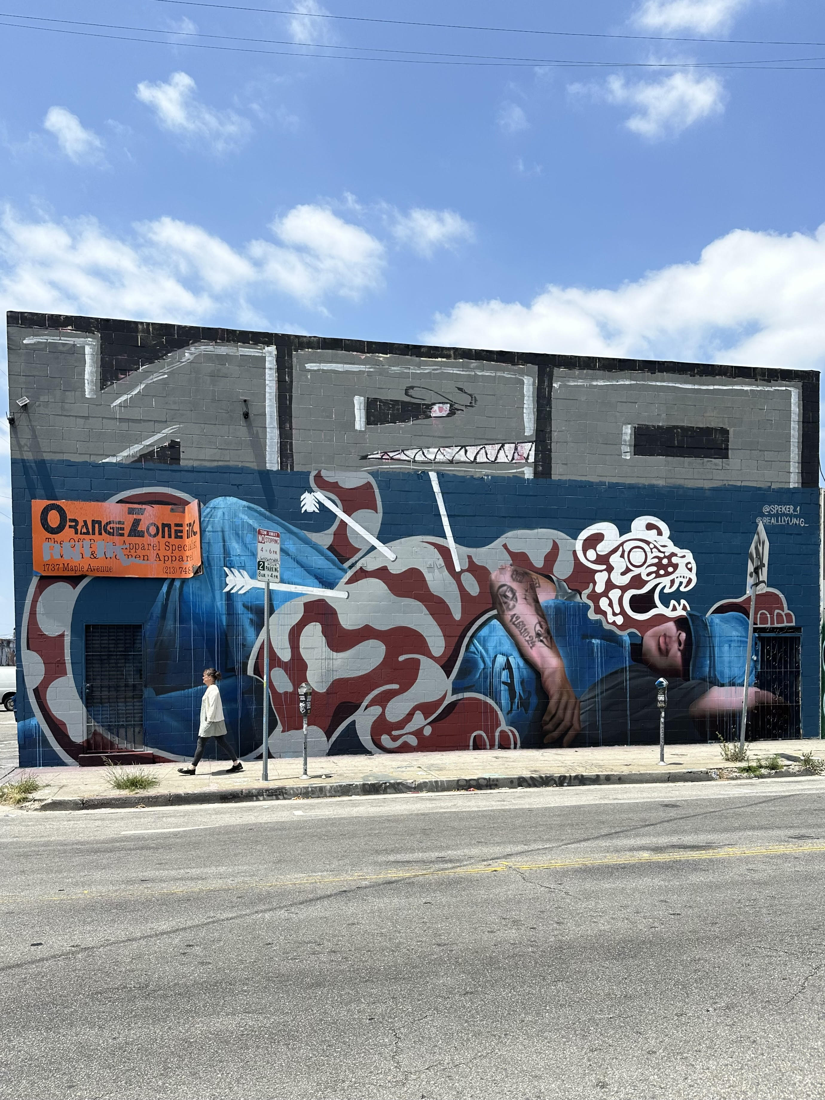 The mural was painted in collaboration with Chris Lee. The idea for the mural started from what the tiger represent in Korean symbology, protection. In the mural we have a representation of the tiger protecting the man's sleep.