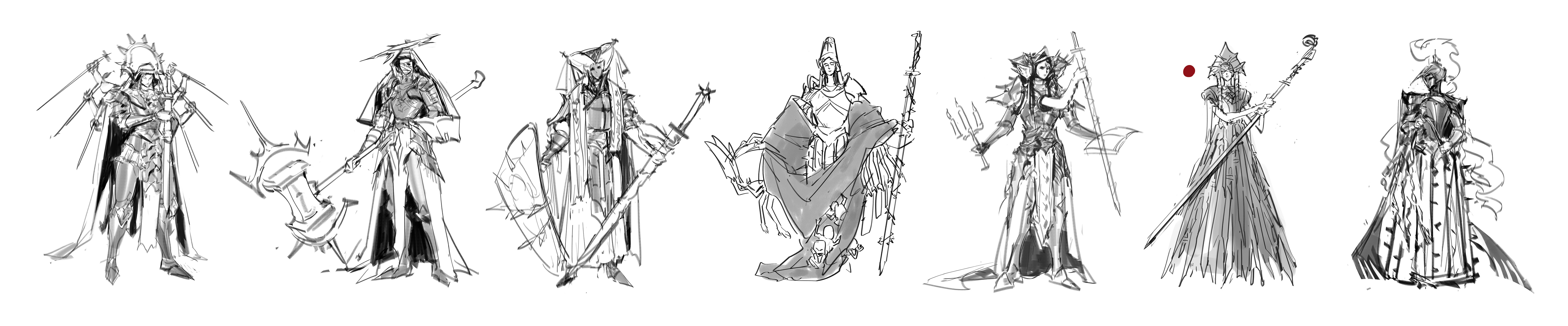 For this project I designed a gothic world with two factions. I designed six characters from both factions, exploring fun possibilities in potential game play and enemy fights if it were a video game.