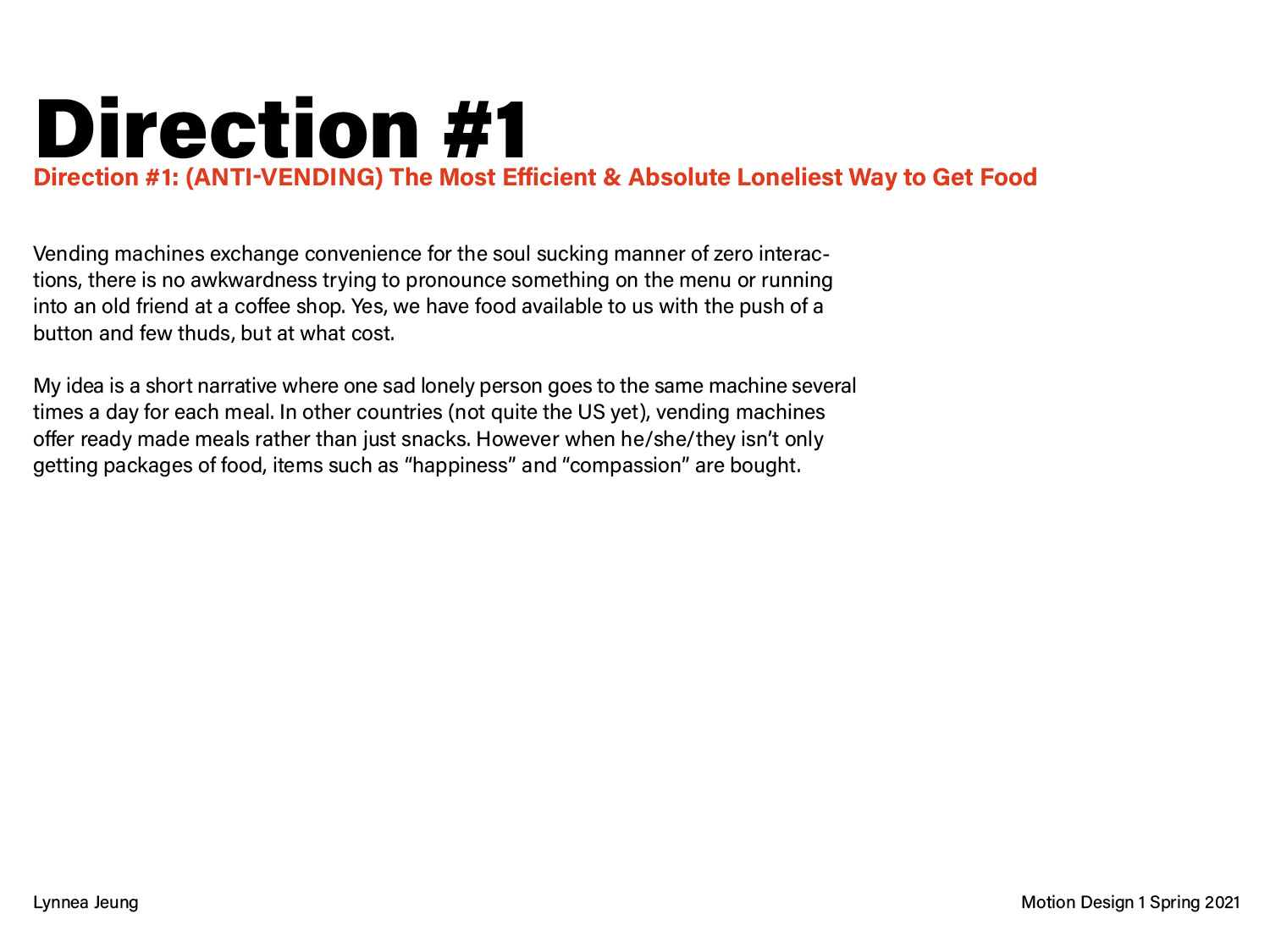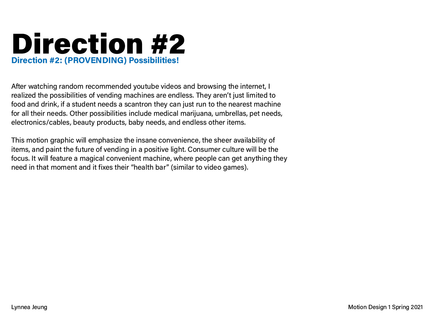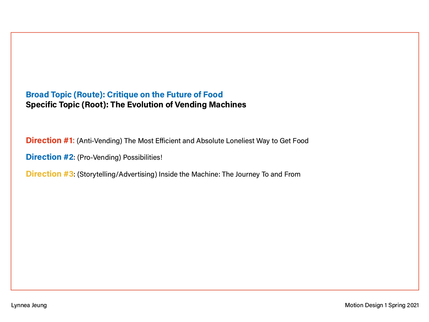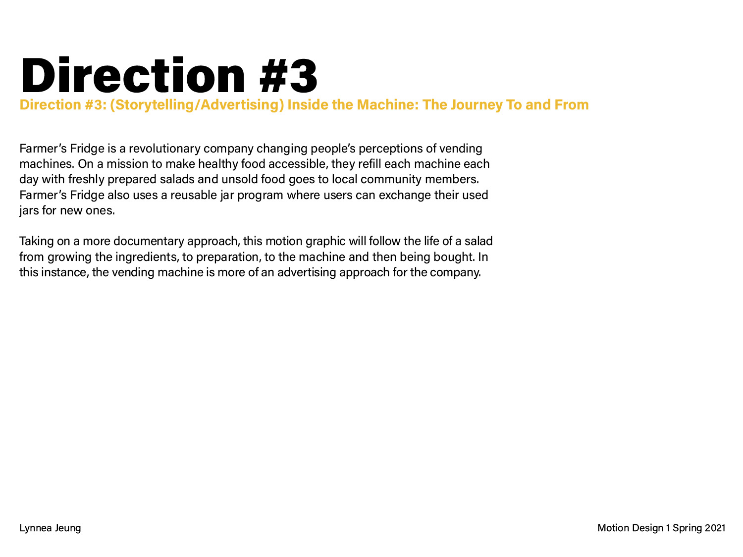 This pitch deck is for a 25-30 second motion graphic, getting to the “root” of a problem. I chose vending machines because I am interested in the food industry and how the pandemic is changing our eating habits. The three different directions are opposite perspectives on critiquing the future of food when vending machines evolve past just chips and snacks to offering all sorts of meals/items.