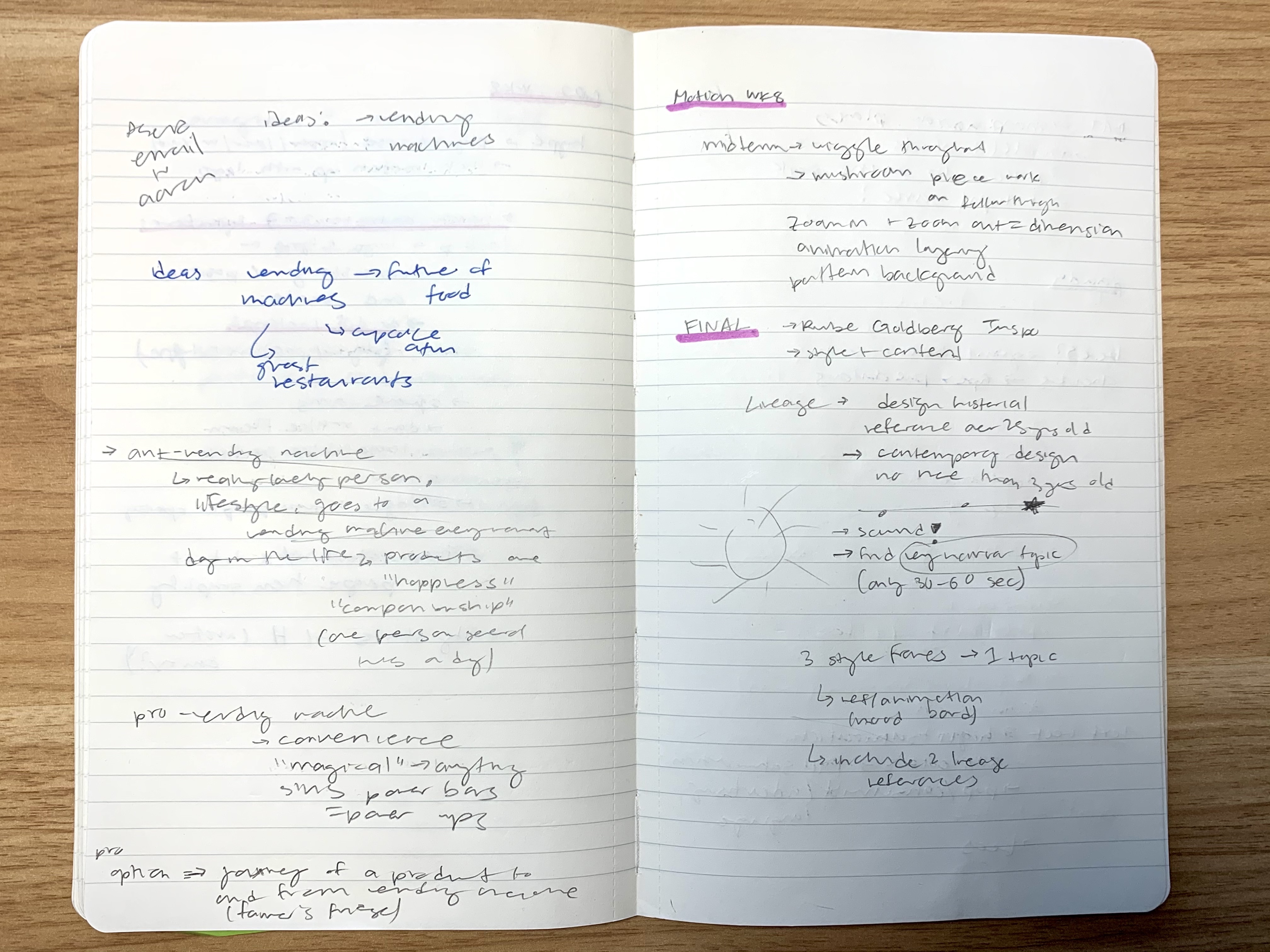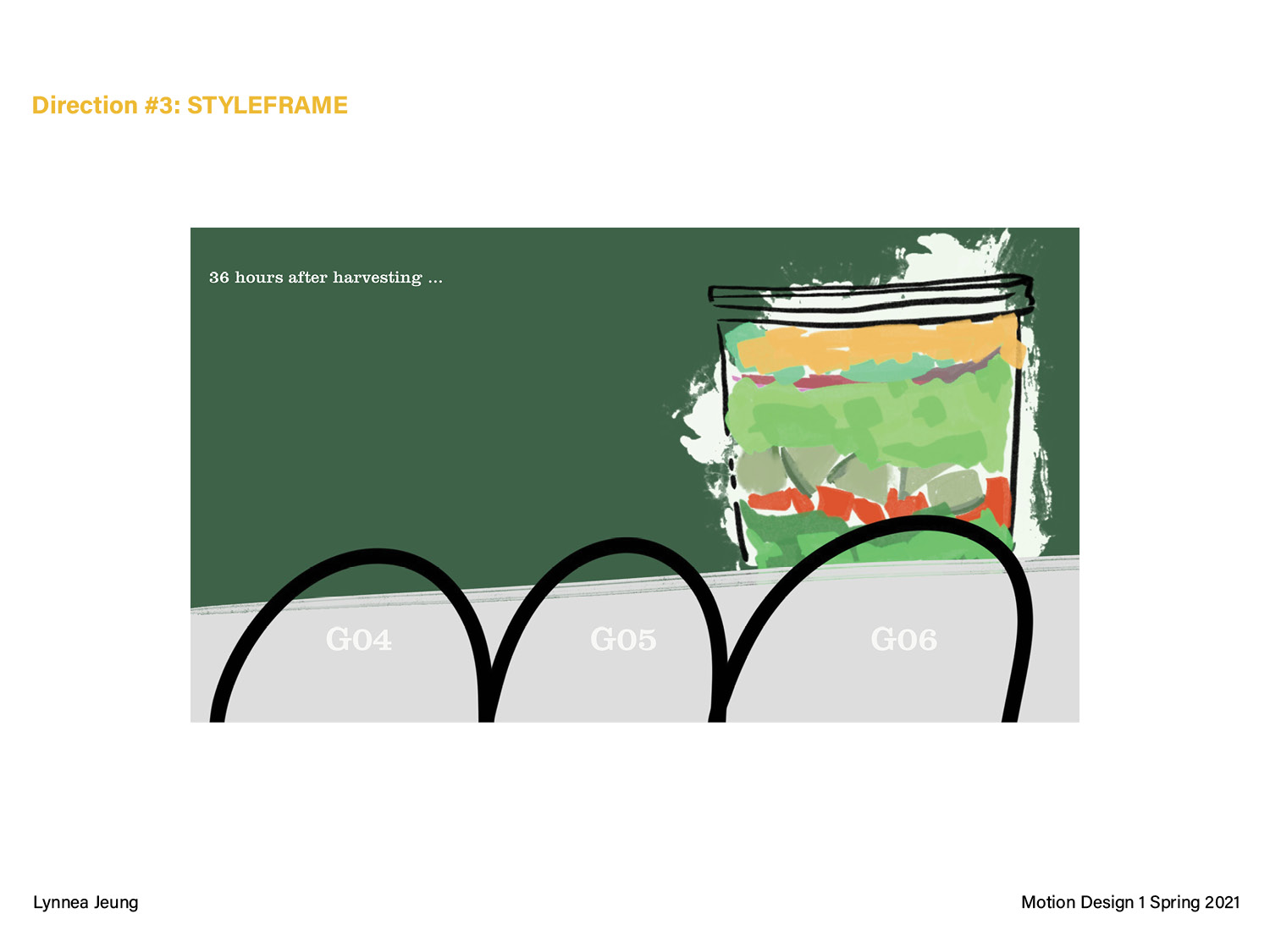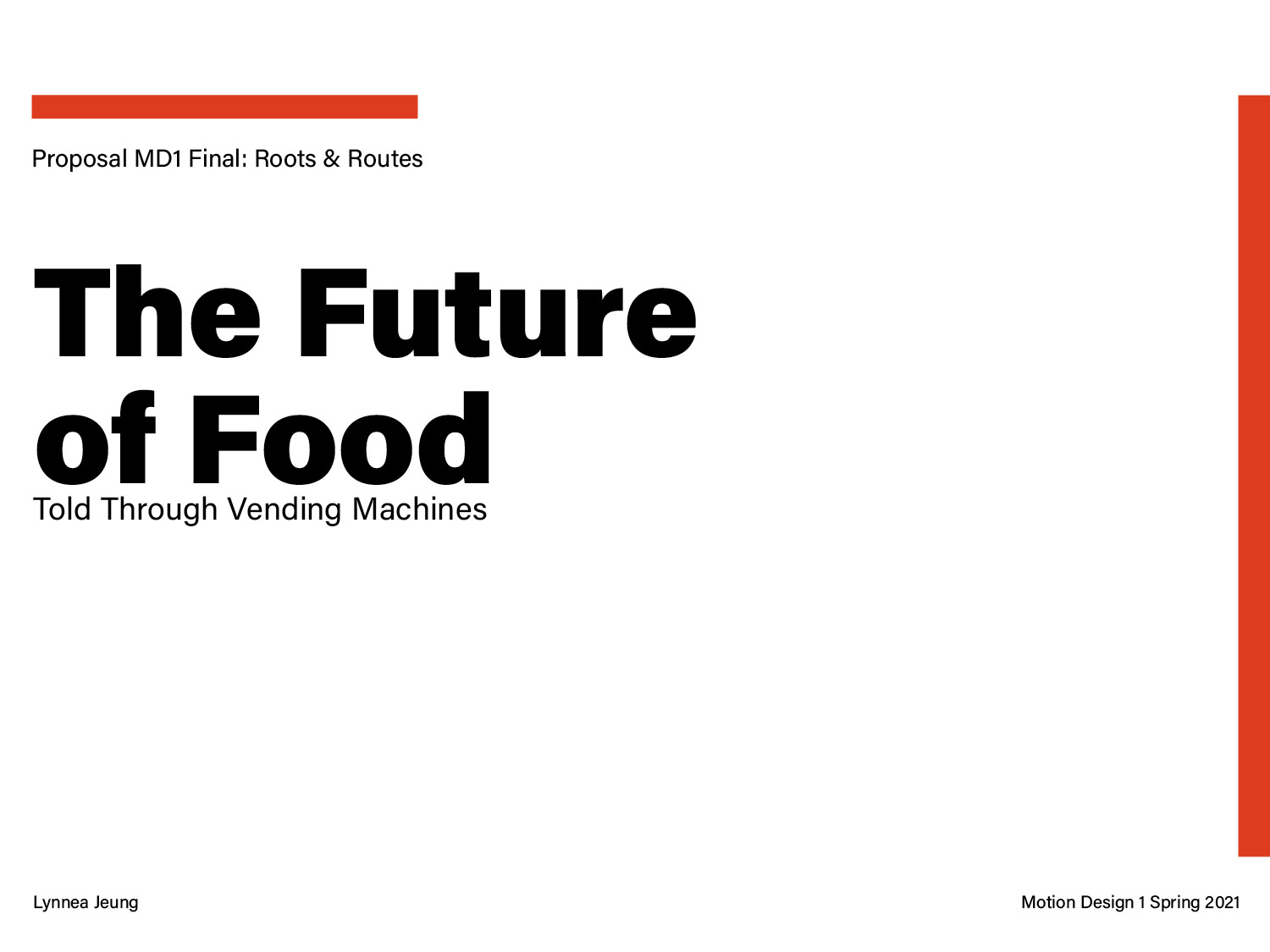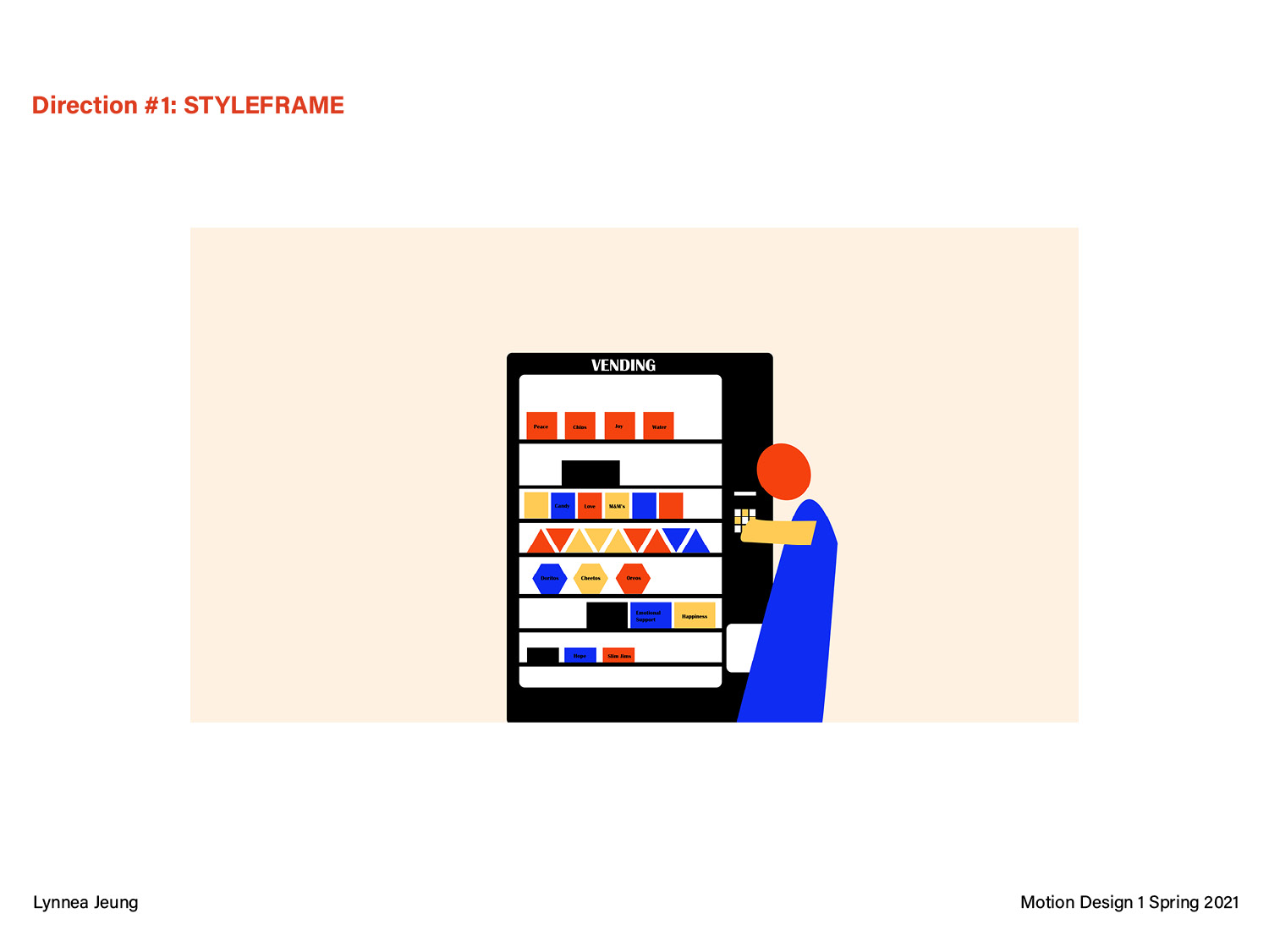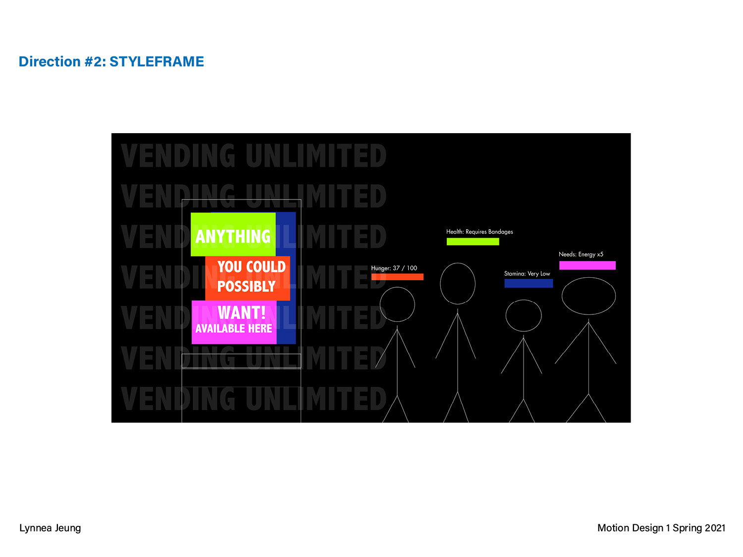This pitch deck is for a 25-30 second motion graphic, getting to the “root” of a problem. I chose vending machines because I am interested in the food industry and how the pandemic is changing our eating habits. The three different directions are opposite perspectives on critiquing the future of food when vending machines evolve past just chips and snacks to offering all sorts of meals/items.