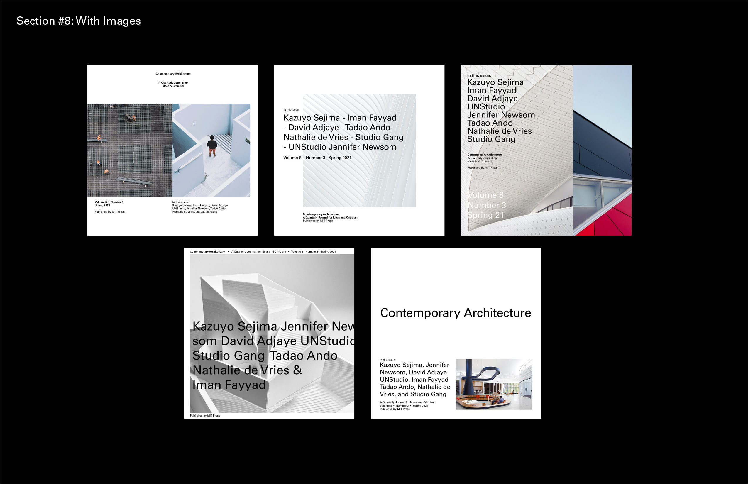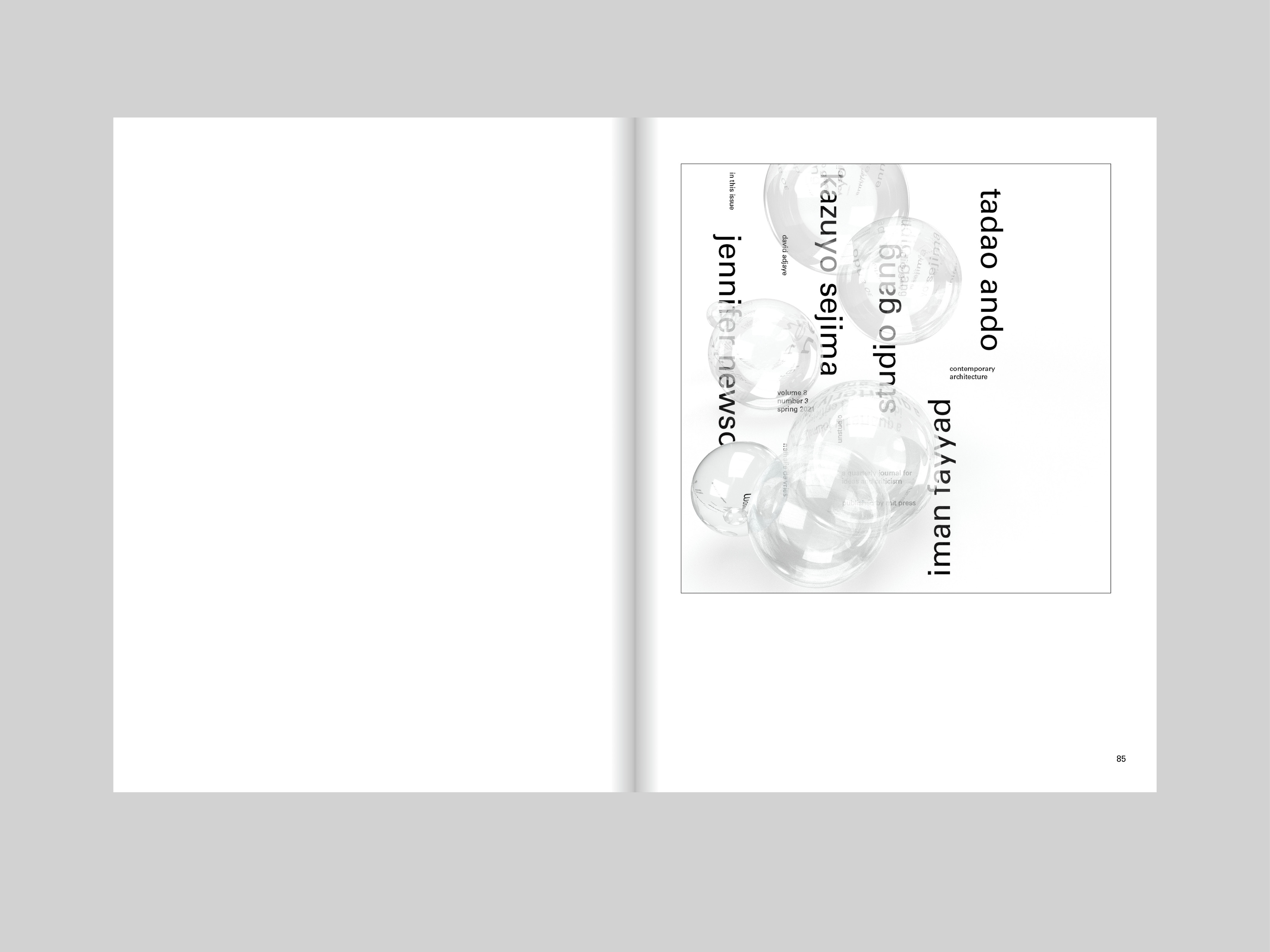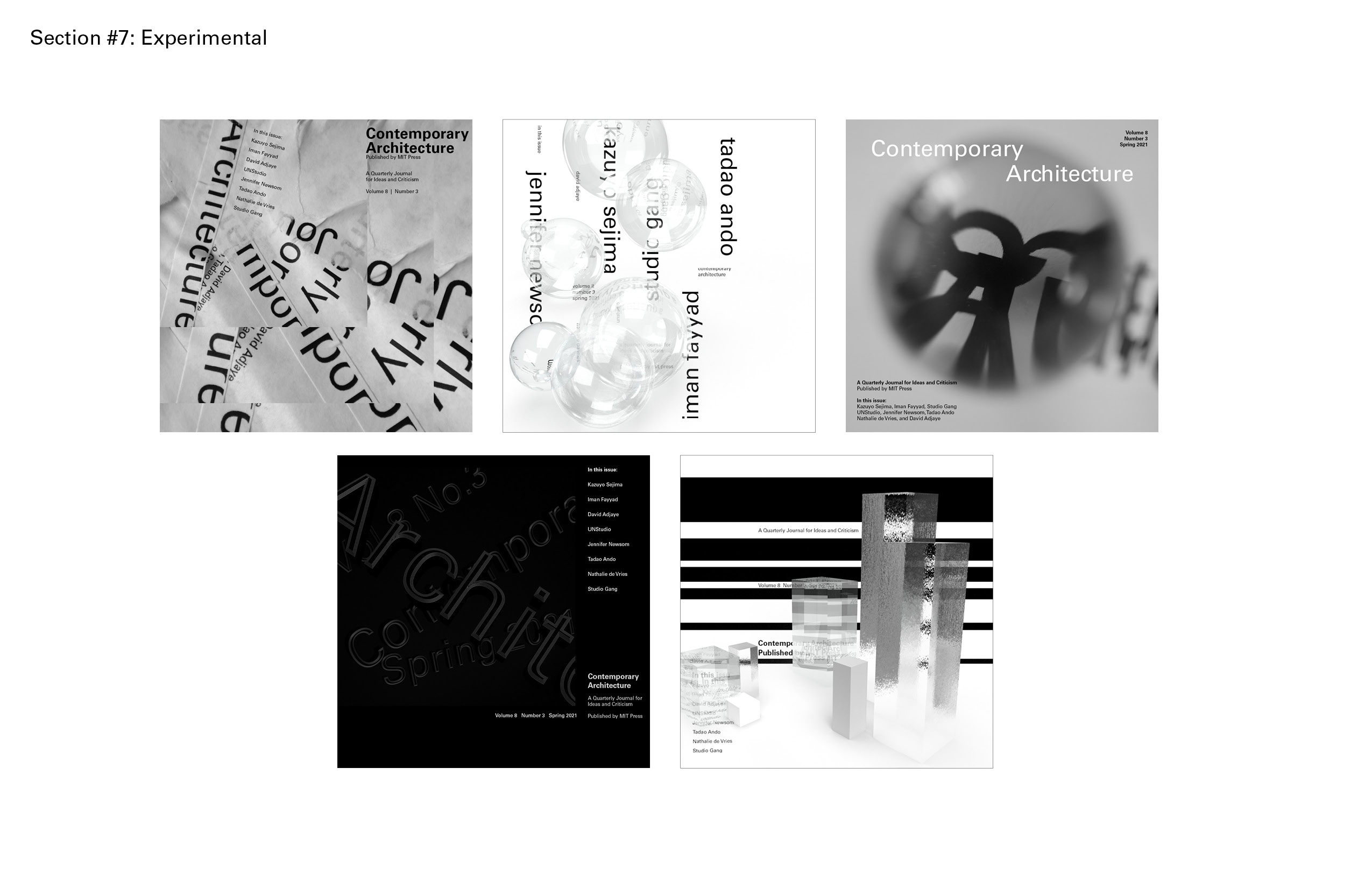 Each week, students were given a specific set of instructions and parameters to create magazine covers for Contemporary Architecture. I’ve selected arrangements from a few of the sections that are the most successful. The dividers of the book are based off of zoom’s interface in the way they light up and fade out since this term was spent on zoom ironically.