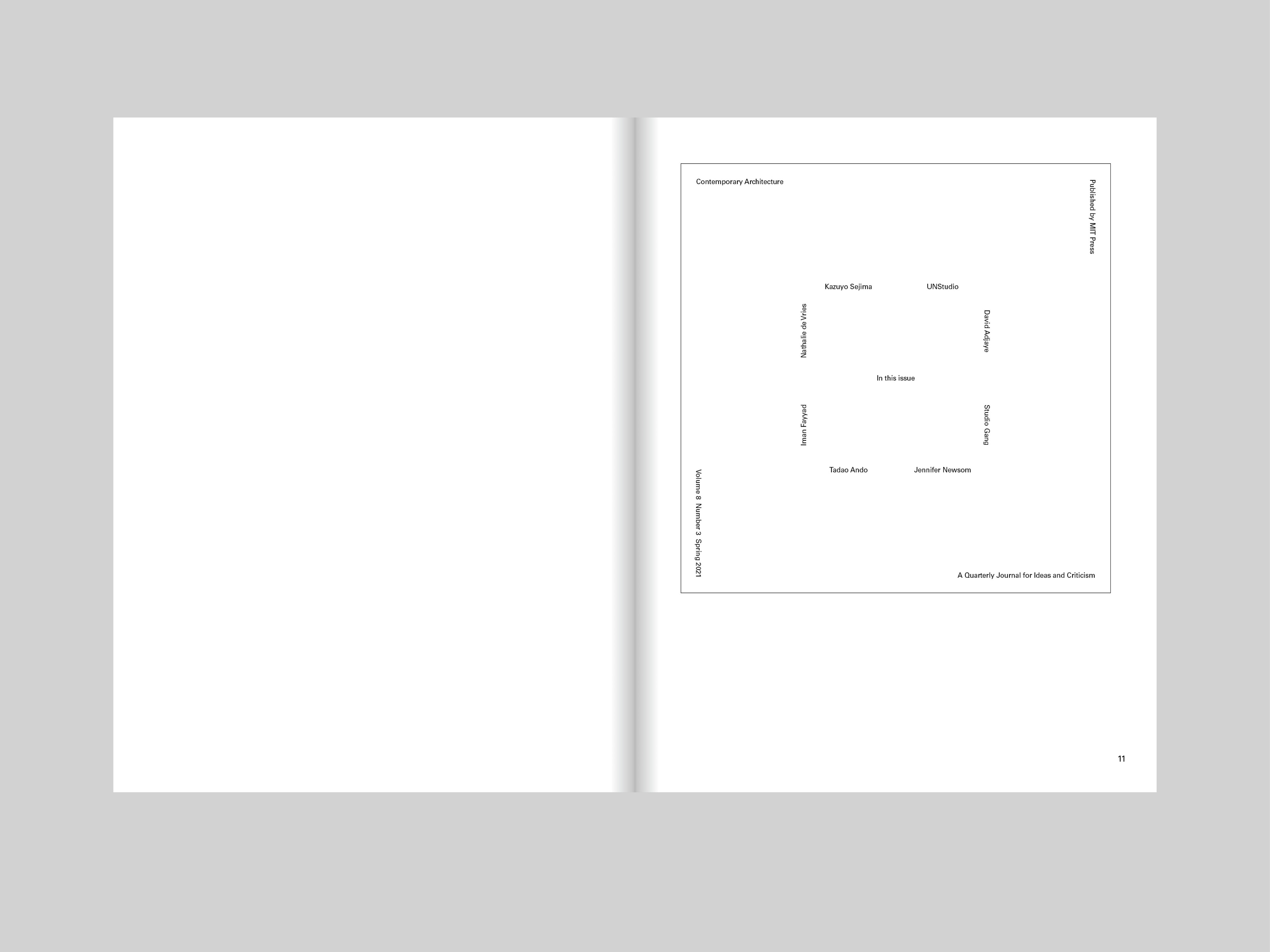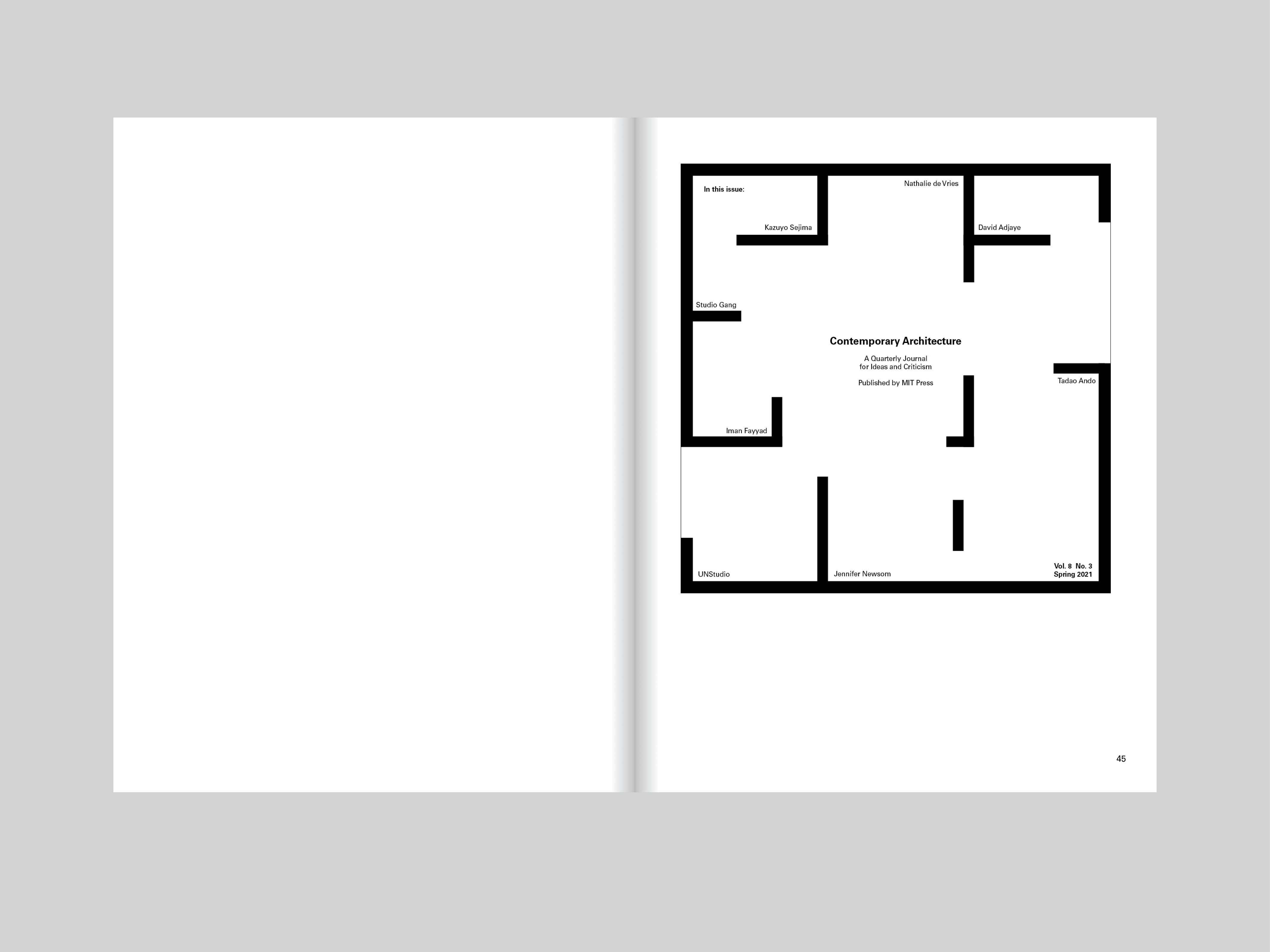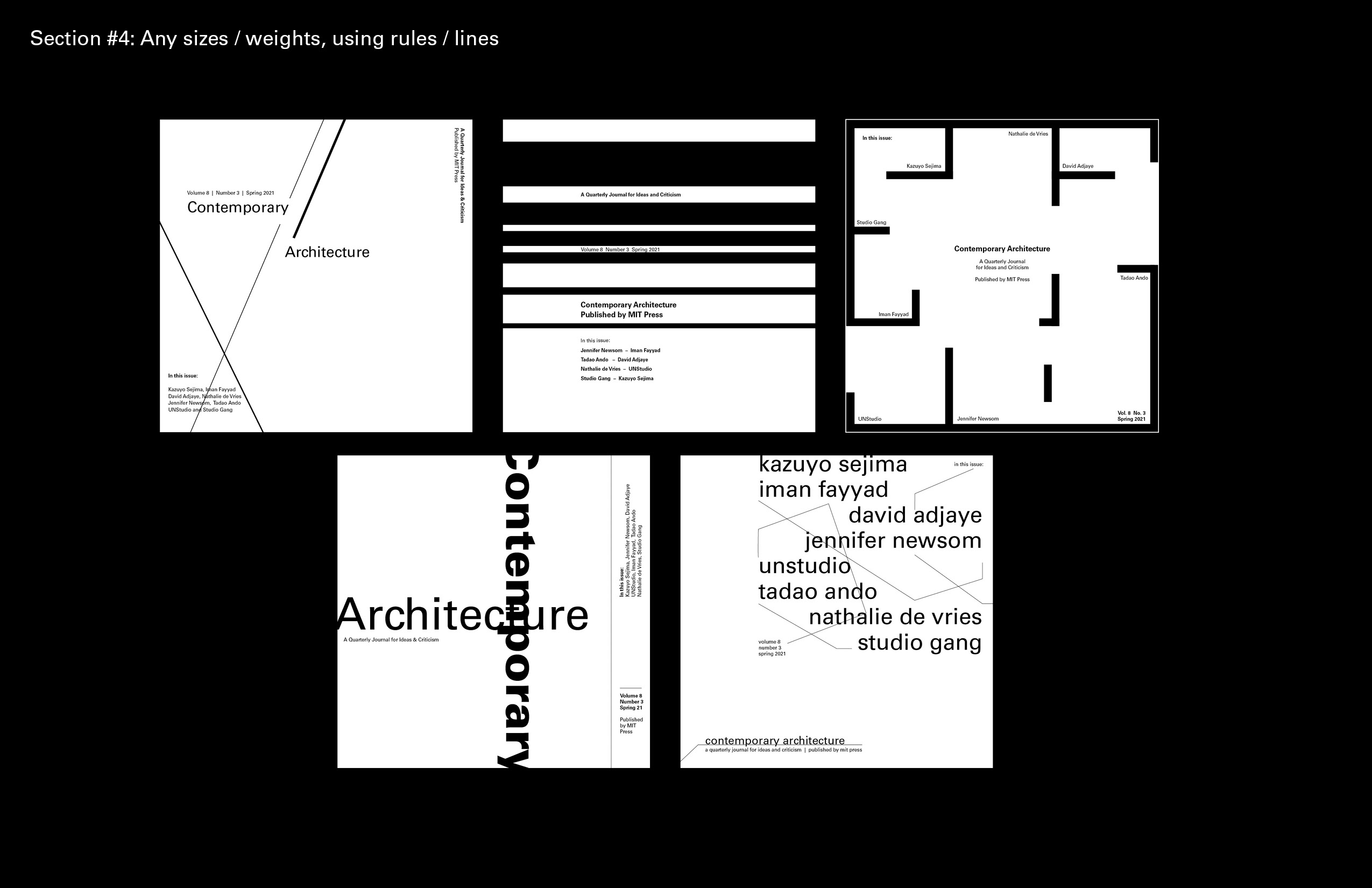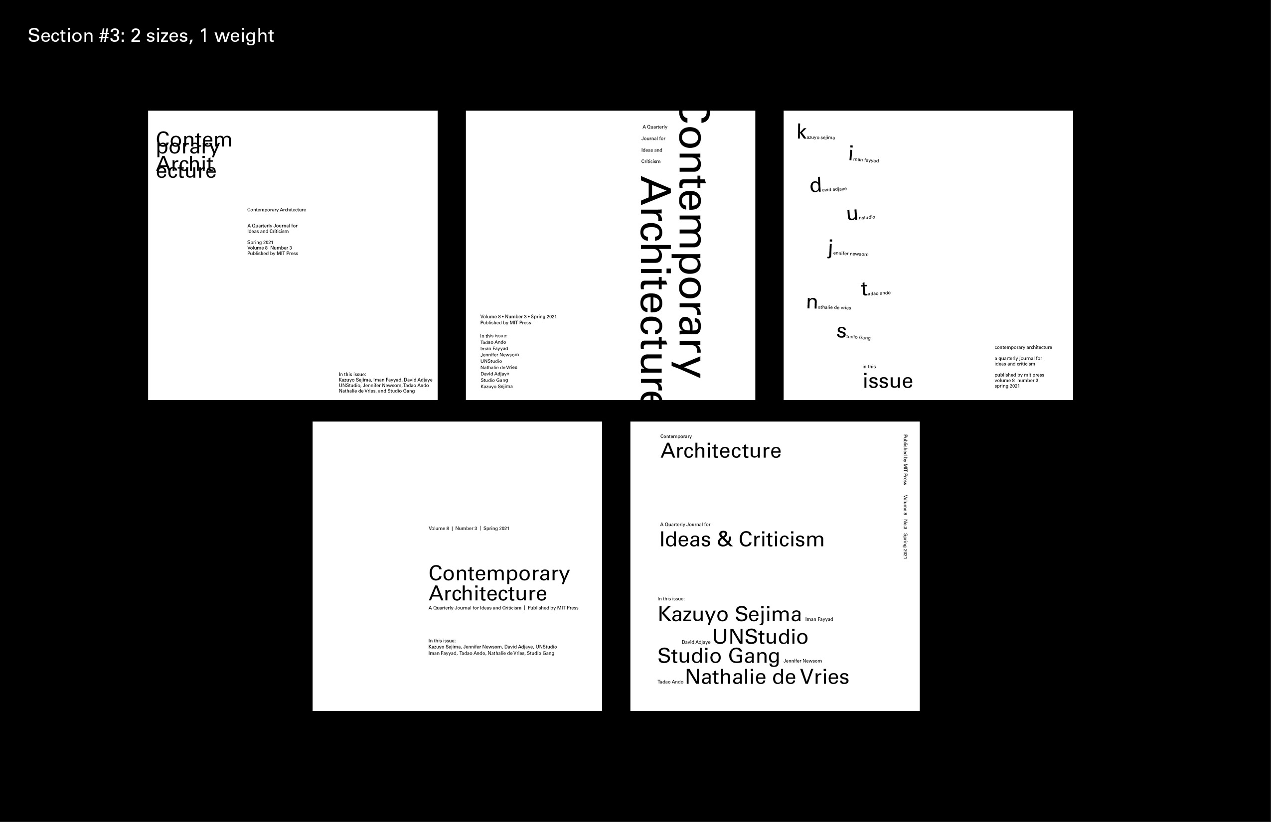 Each week, students were given a specific set of instructions and parameters to create magazine covers for Contemporary Architecture. I’ve selected arrangements from a few of the sections that are the most successful. The dividers of the book are based off of zoom’s interface in the way they light up and fade out since this term was spent on zoom ironically.
