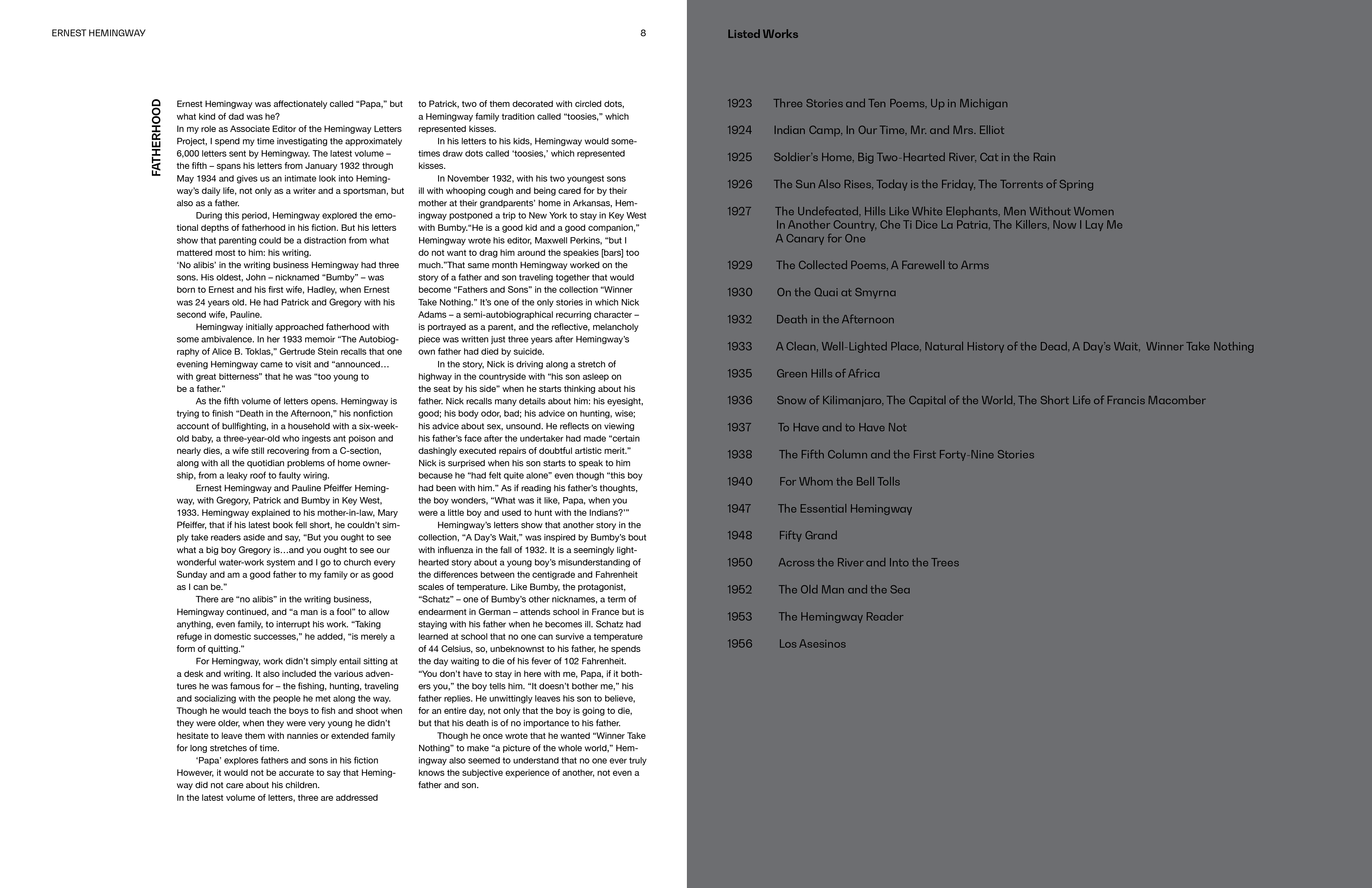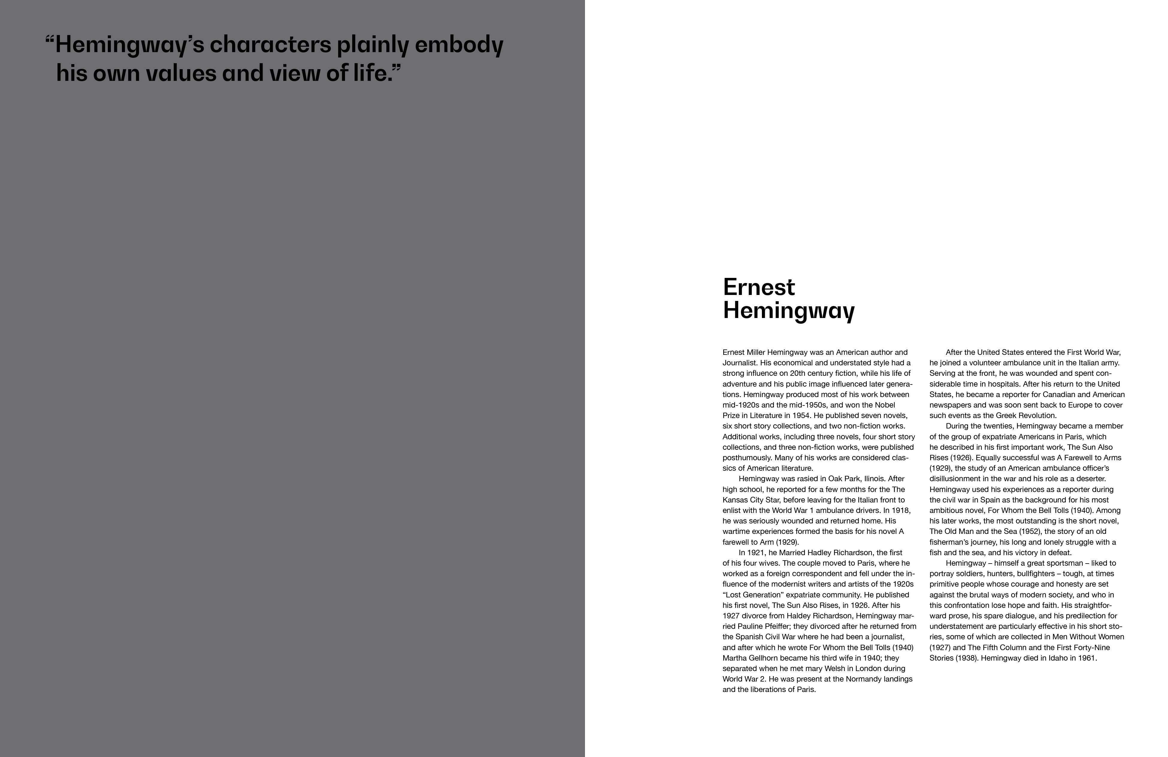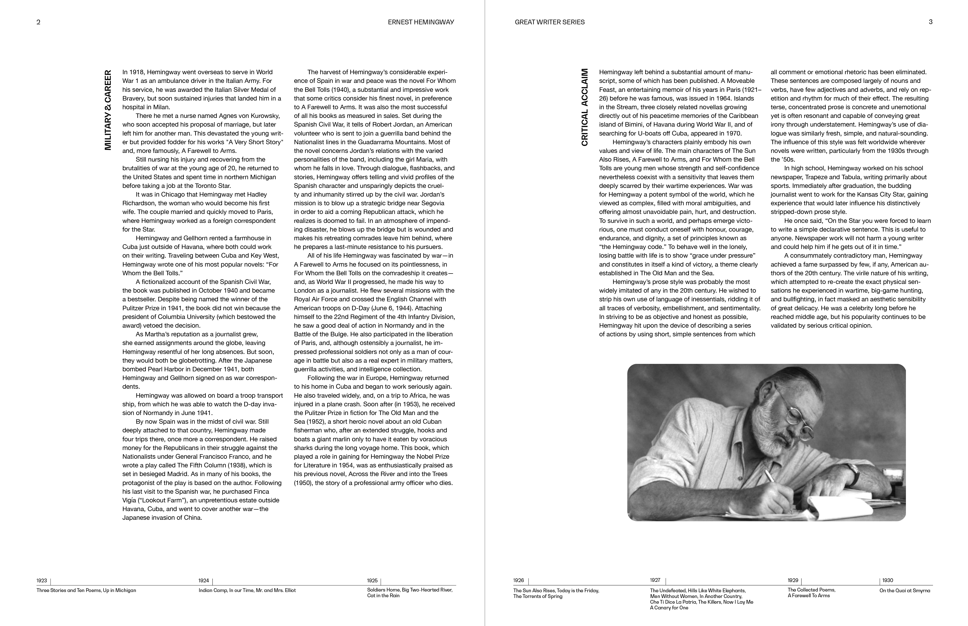 Our first project for type 3 was to do an 8 page book layout about an author of our choosing. The author I chose was Ernest Hemingway. I wanted to keep it contemporary while paying homage to Hemingway's adventurist and outdoors lifestyle. I chose to use large type on the front and back cover to showcase the unique typeface. The timeline running through the book of Hemingway's listed works is used for a graphic element.