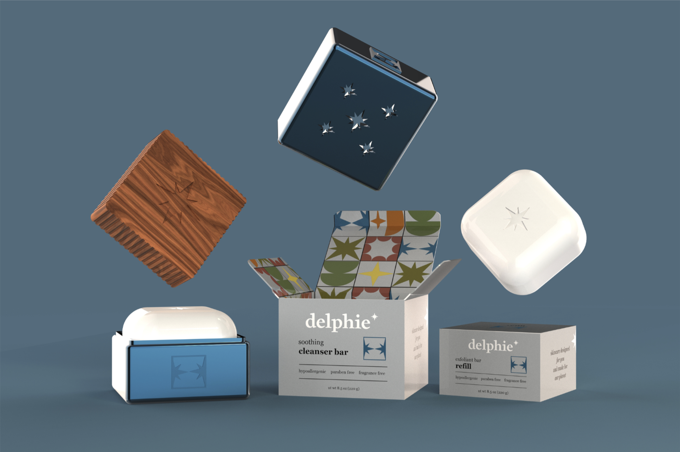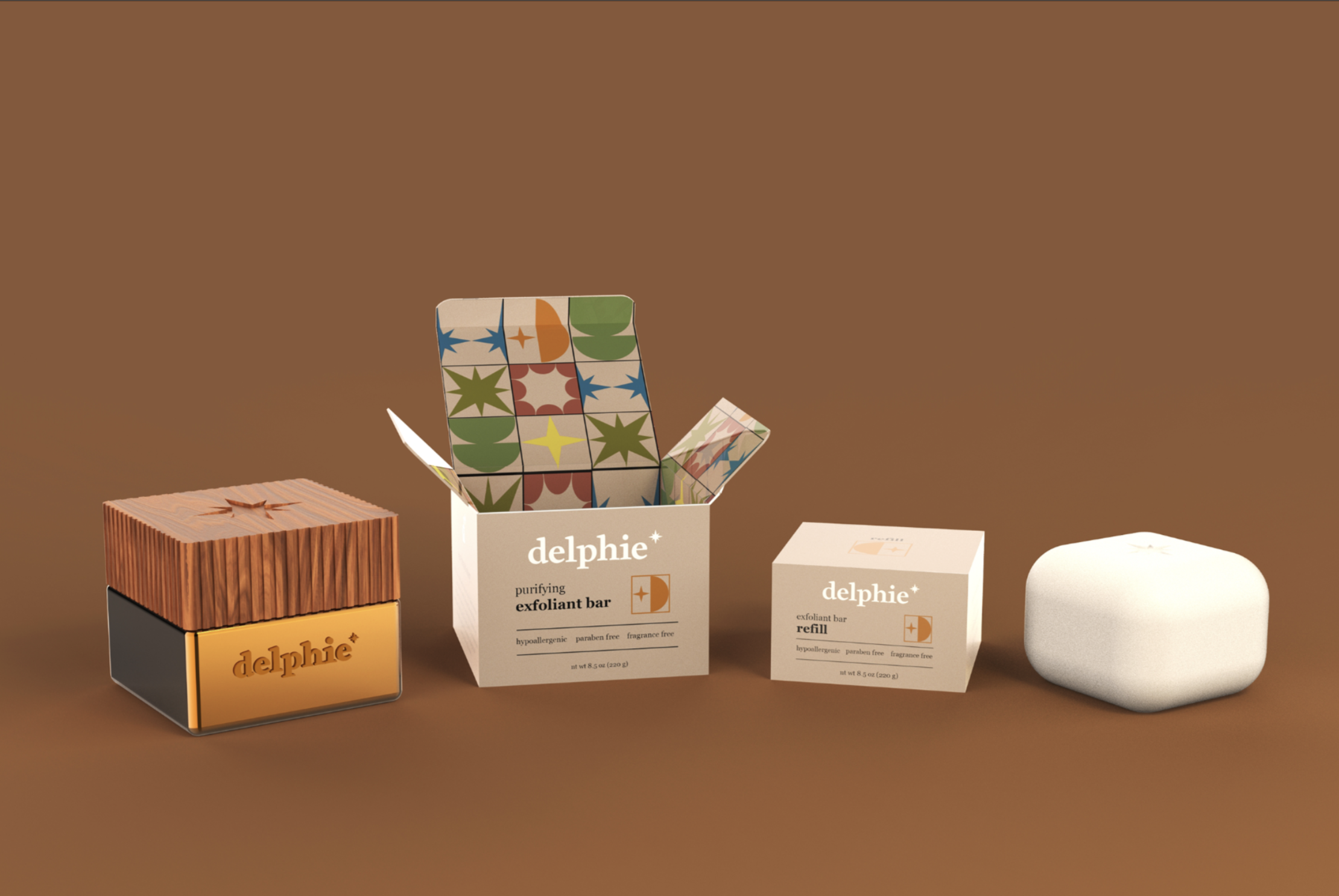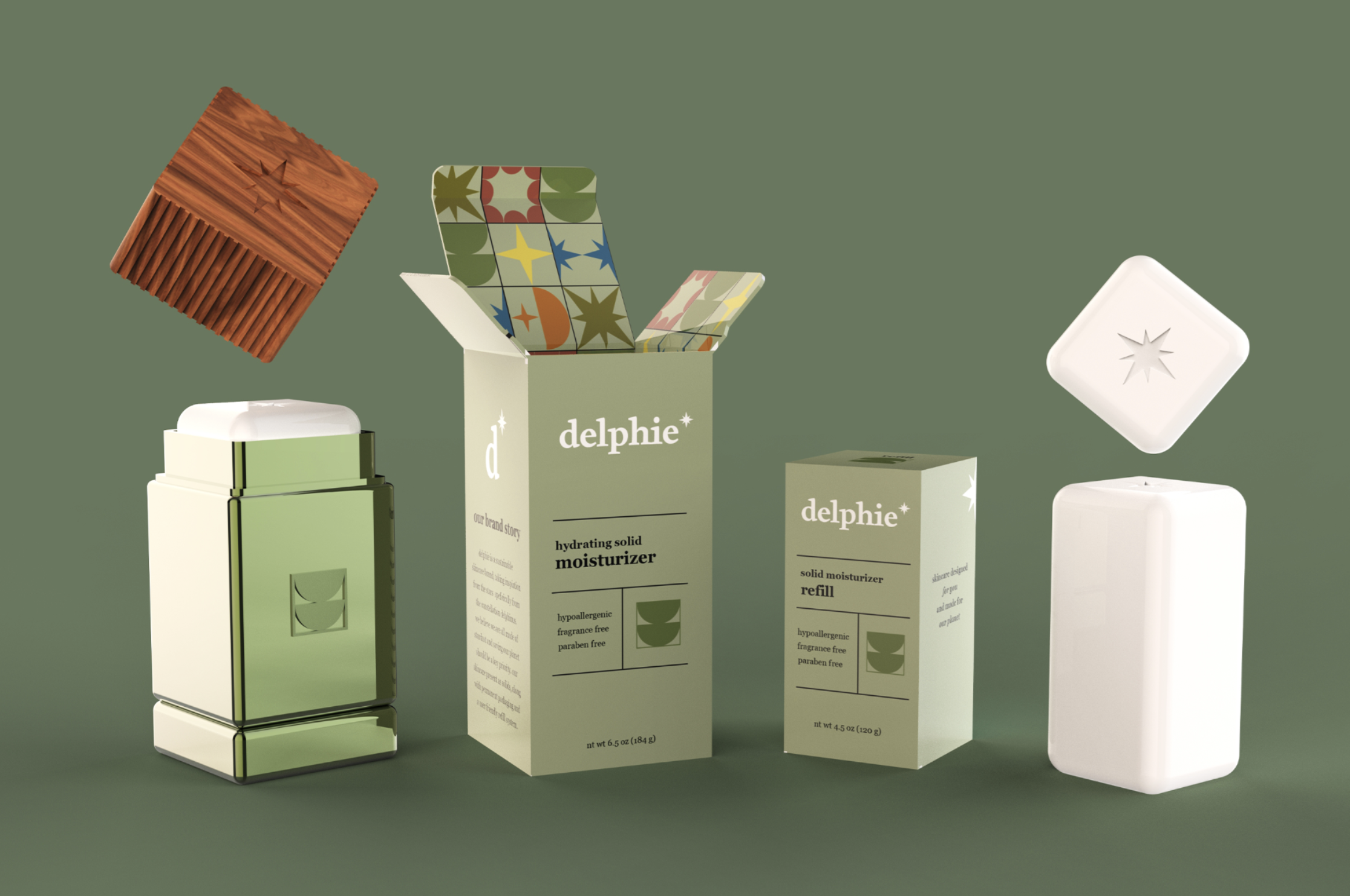Delphie is a hypothetical skincare brand which emphasizes sustainability through materials and refill systems. It focuses in on solid beauty which also helps decrease the energy needed to store and transport the items. The six products include toner, serum, sunscreen, moisturizer, exfoliant, and cleanser. All come with the option for refill systems and permanent packaging made out of brushed aluminum and wood.