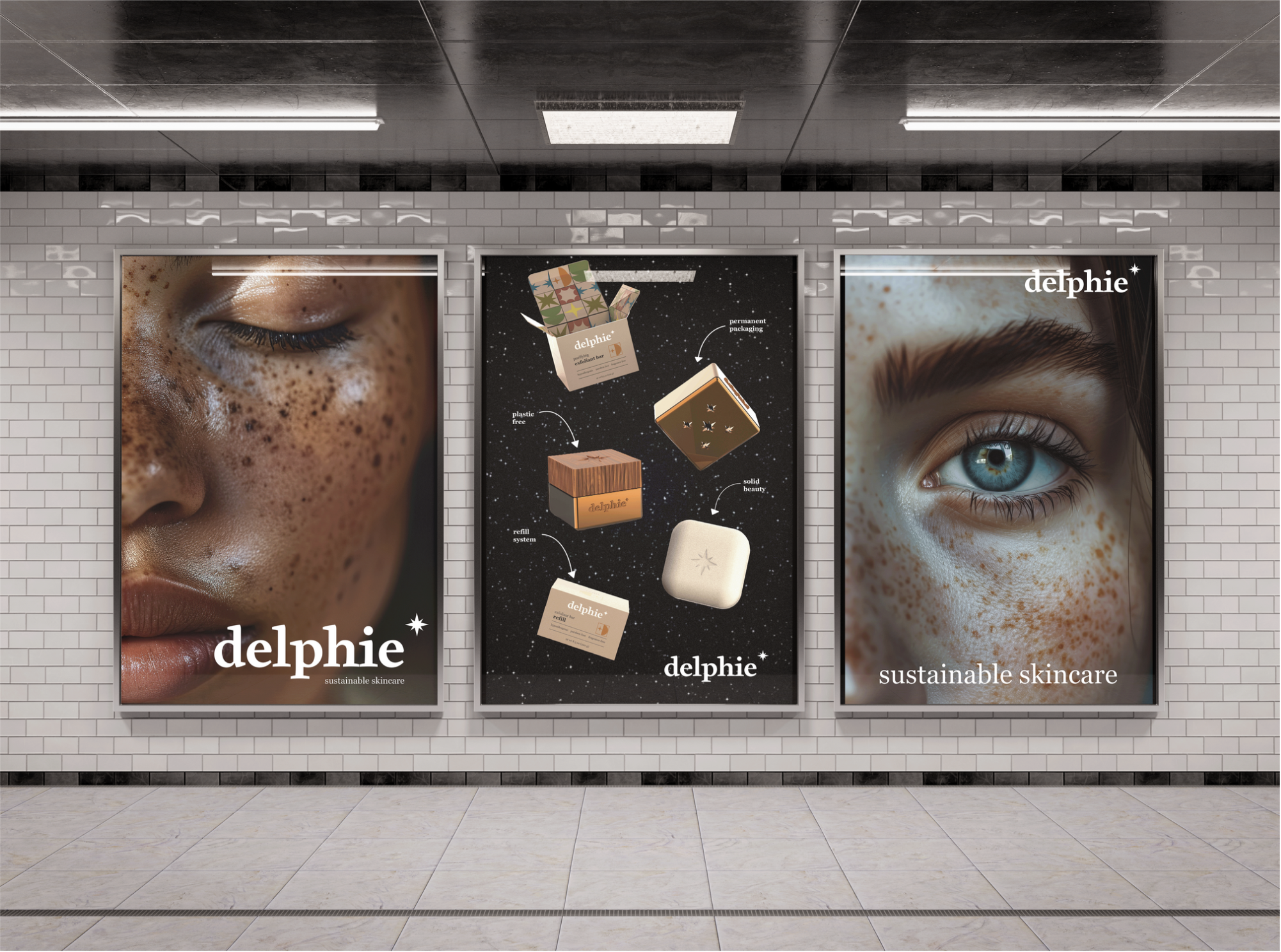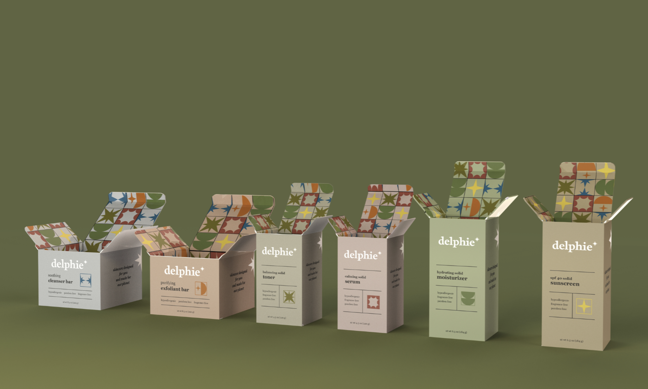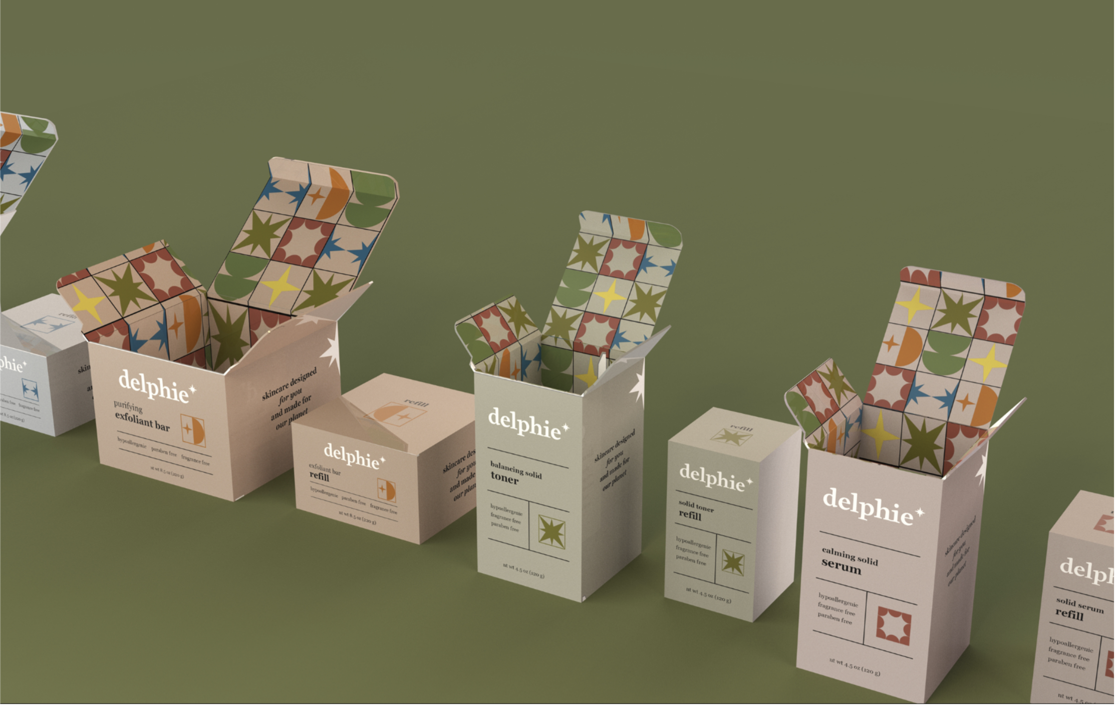 Delphie is a hypothetical skincare brand which emphasizes sustainability through materials and refill systems. It focuses in on solid beauty which also helps decrease the energy needed to store and transport the items. The six products include toner, serum, sunscreen, moisturizer, exfoliant, and cleanser. All come with the option for refill systems and permanent packaging made out of brushed aluminum and wood.