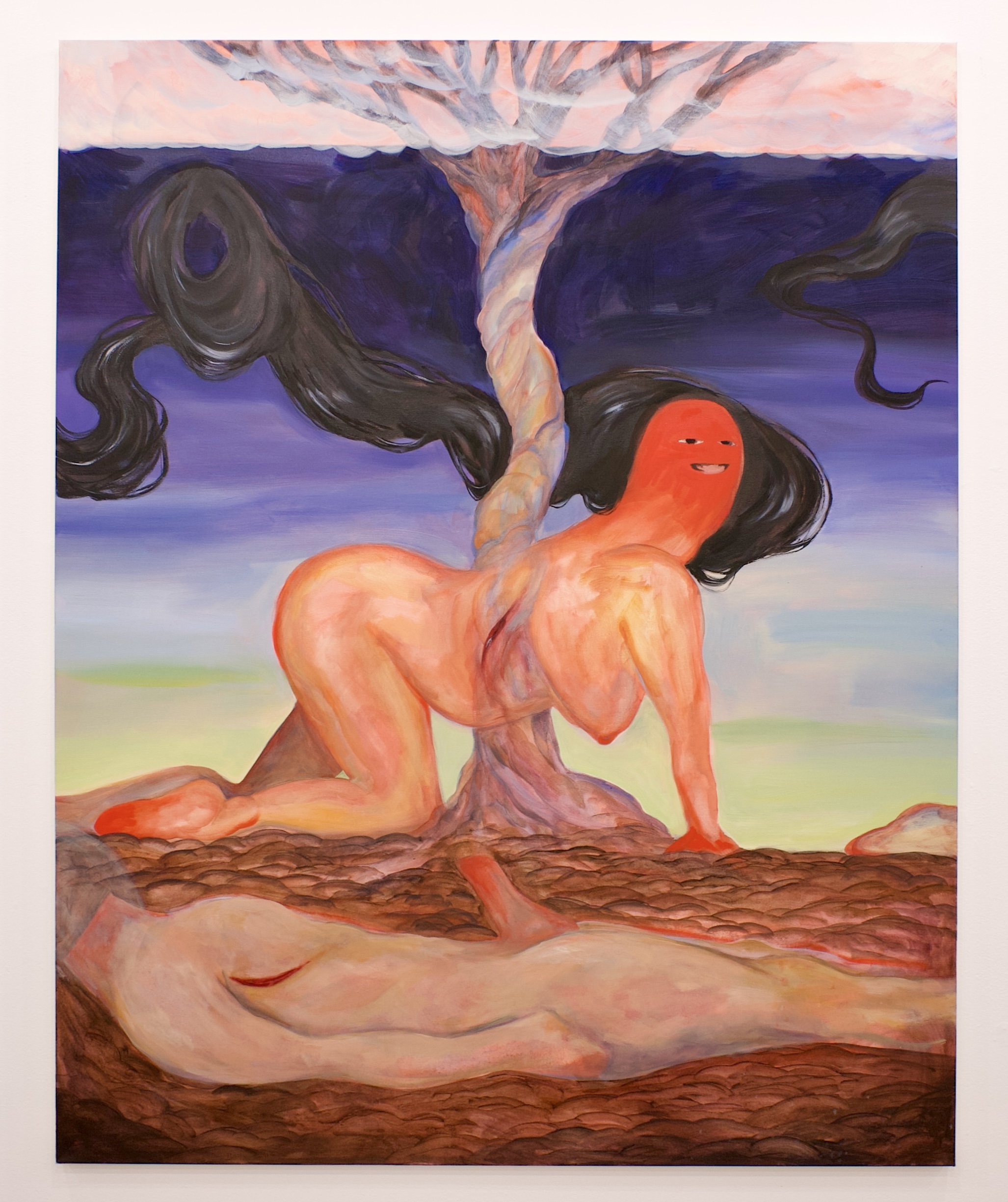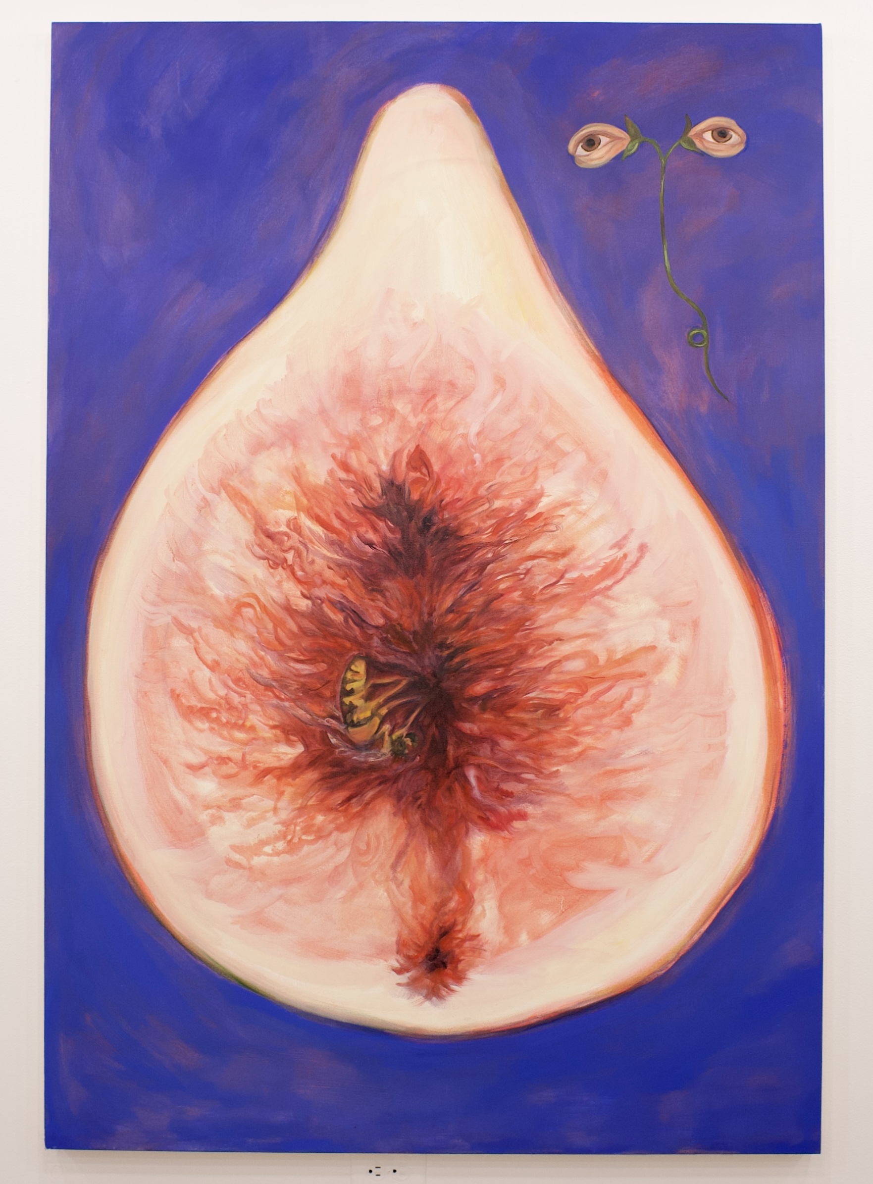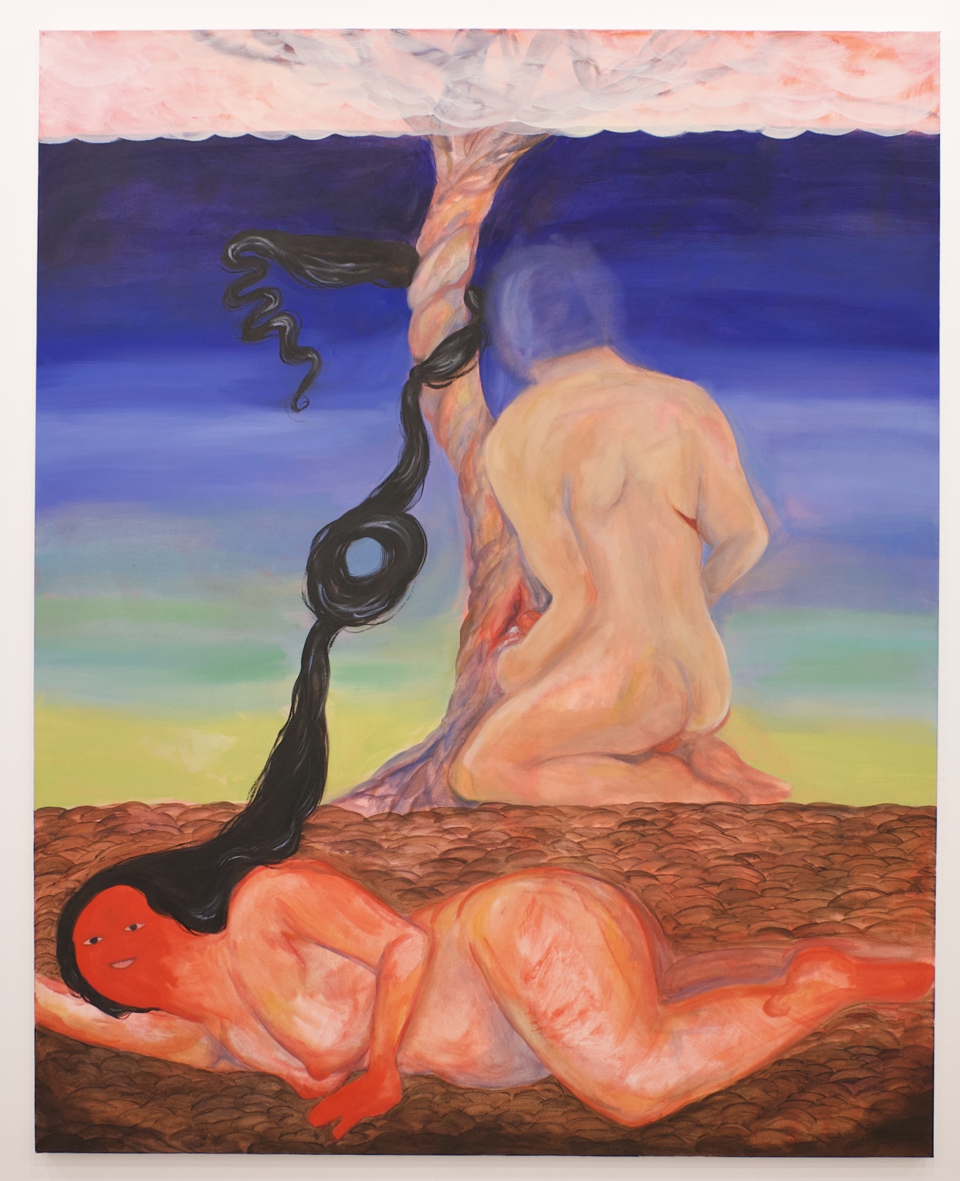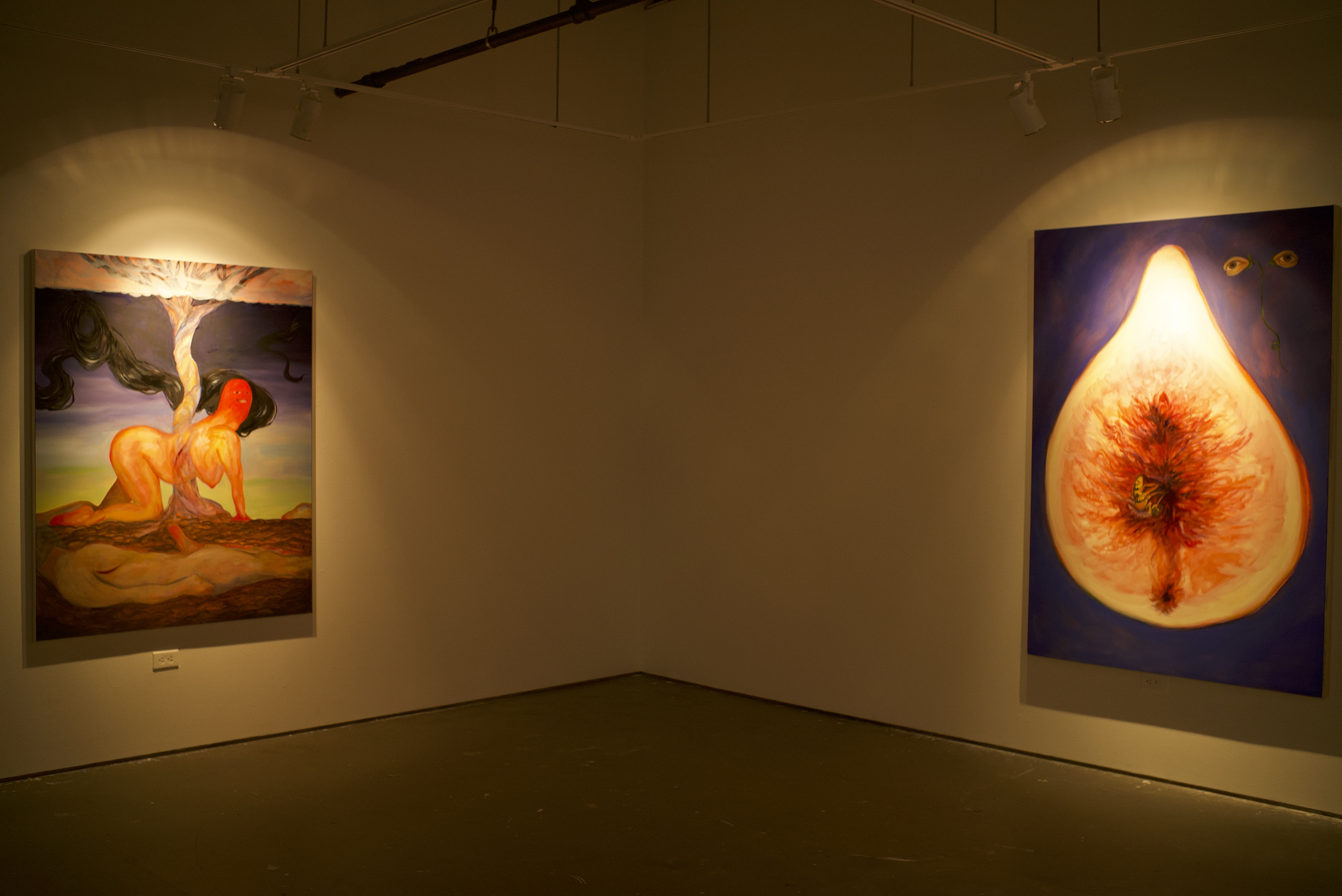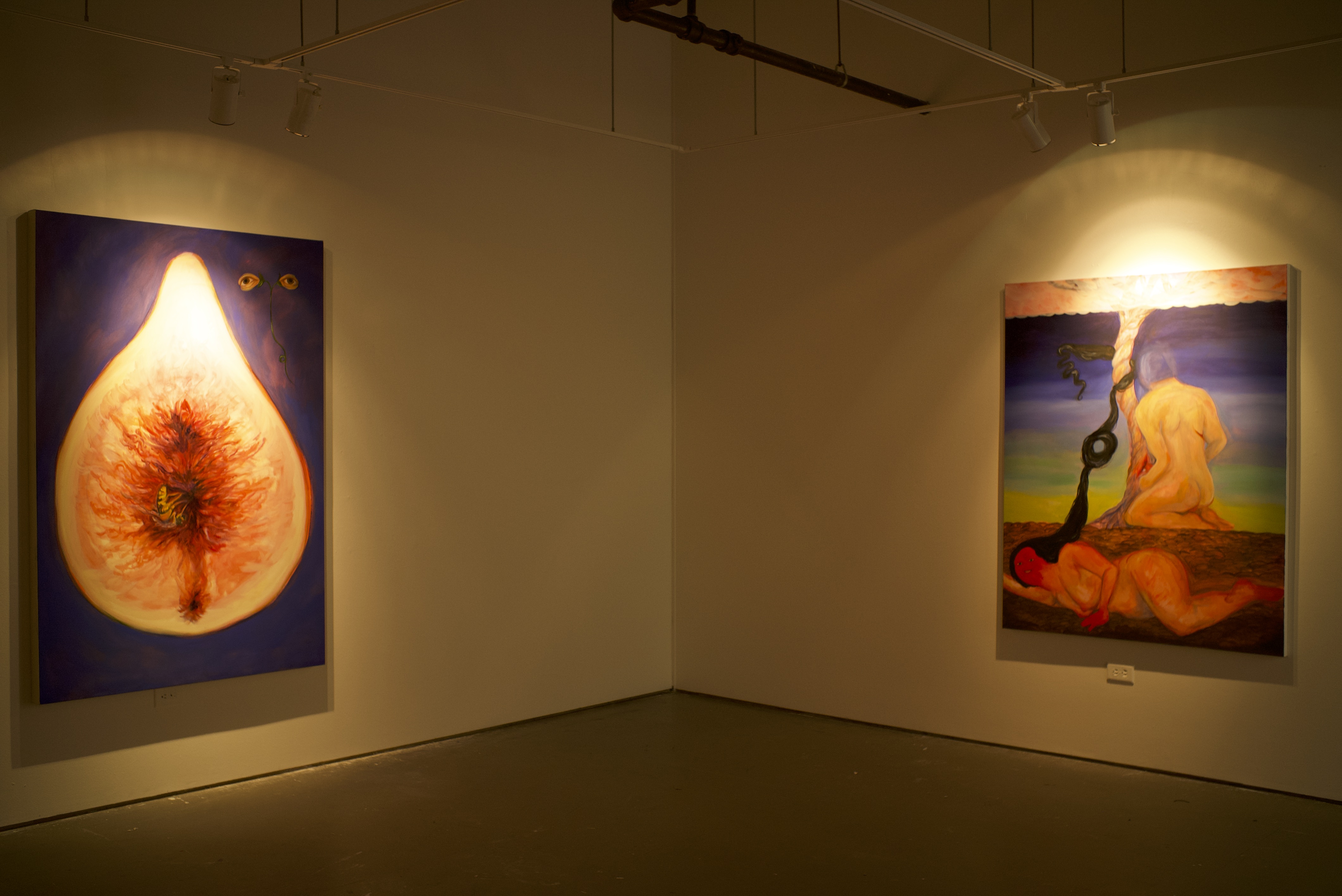 “cleave unto his wife” is a solo exhibition of Maria Cervantes Mejia's most recent paintings. Using biblical text from the book of Genesis, they hope to invite the viewer to question the roles of gender and sex within the myth.