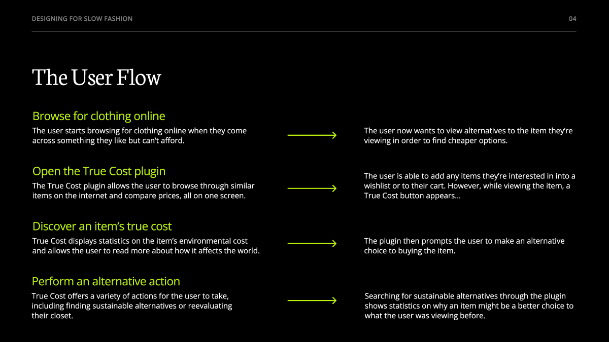 True Cost is a web browser plug-in that helps users browse and compare items but slowly reveals the true cost of consumerism by providing hidden stats as users shop and before finalizing purchases. True Cost is meant to encourage mindful consumption and decluttering in order to promote more minimalist lifestyles, turn impulse shopping into a conscious decision, and overall just make the best out of what we already have.