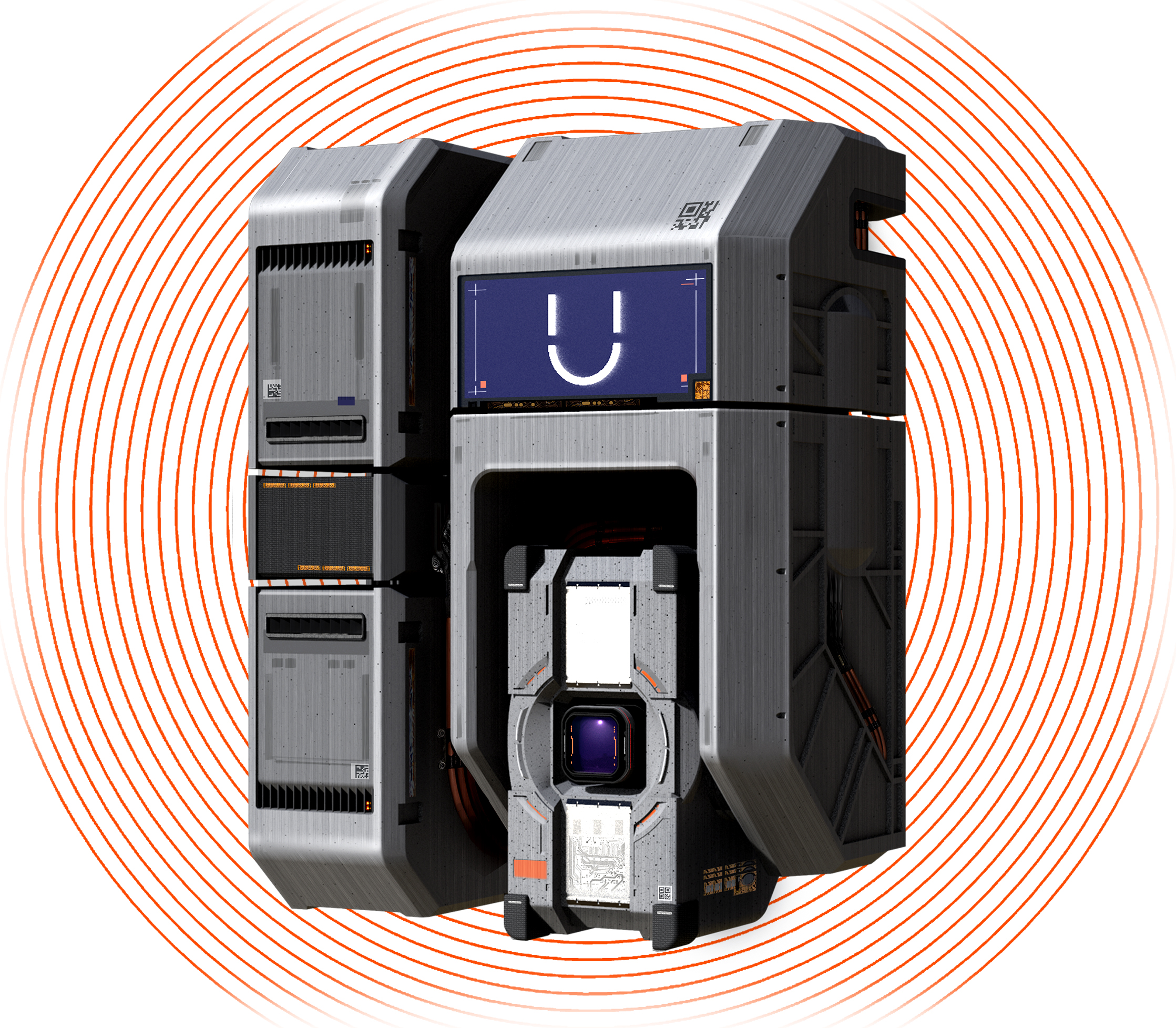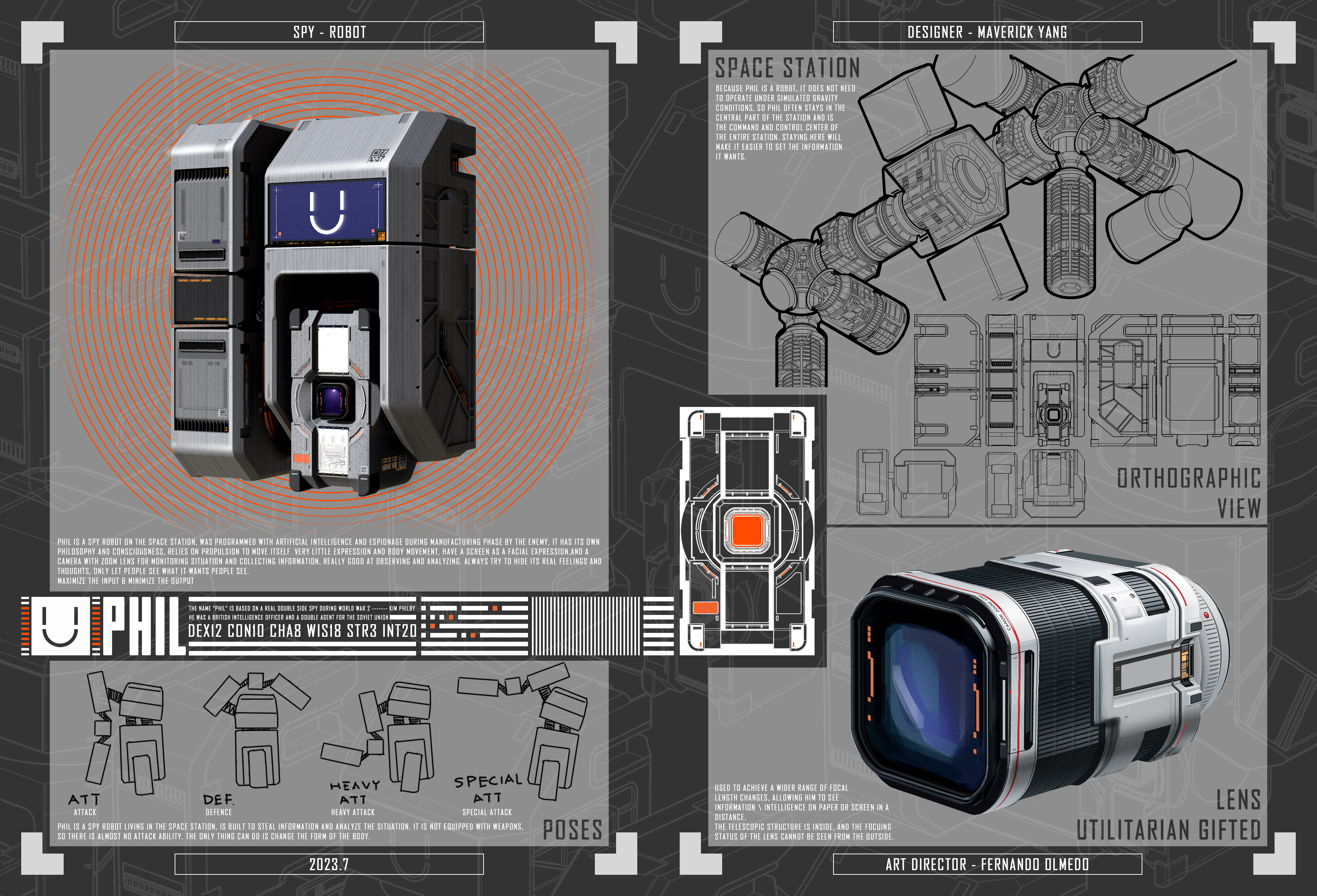 A spy robot on a space station, programmed with AI for espionage by the enemy. It moves using propulsion, shows minimal expression or movement, and features a screen for facial expressions and a zoom-lens camera for monitoring and information gathering. It conceals its true intentions, revealing only what it wants others to perceive. Maximizes input, minimizes output.