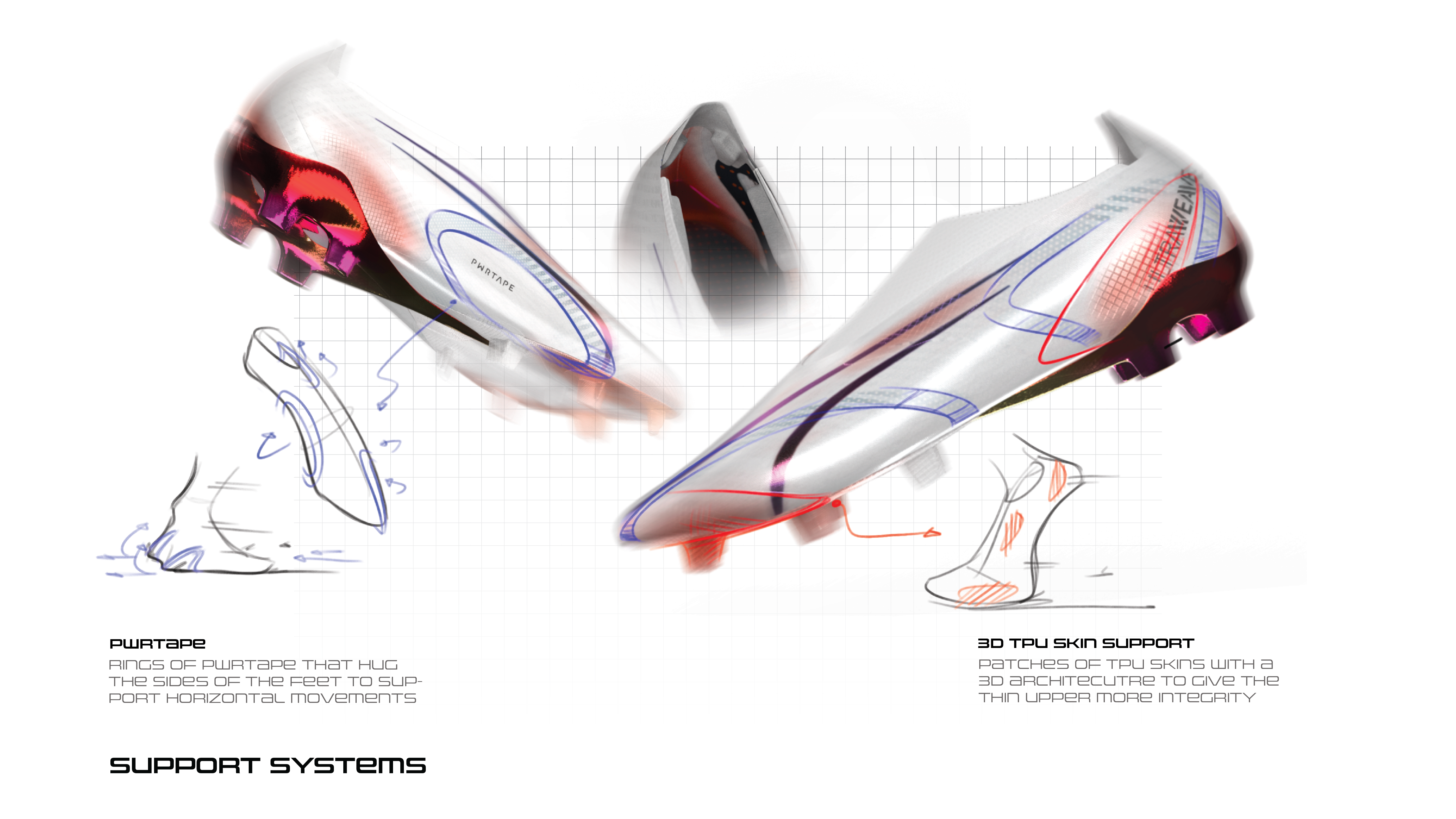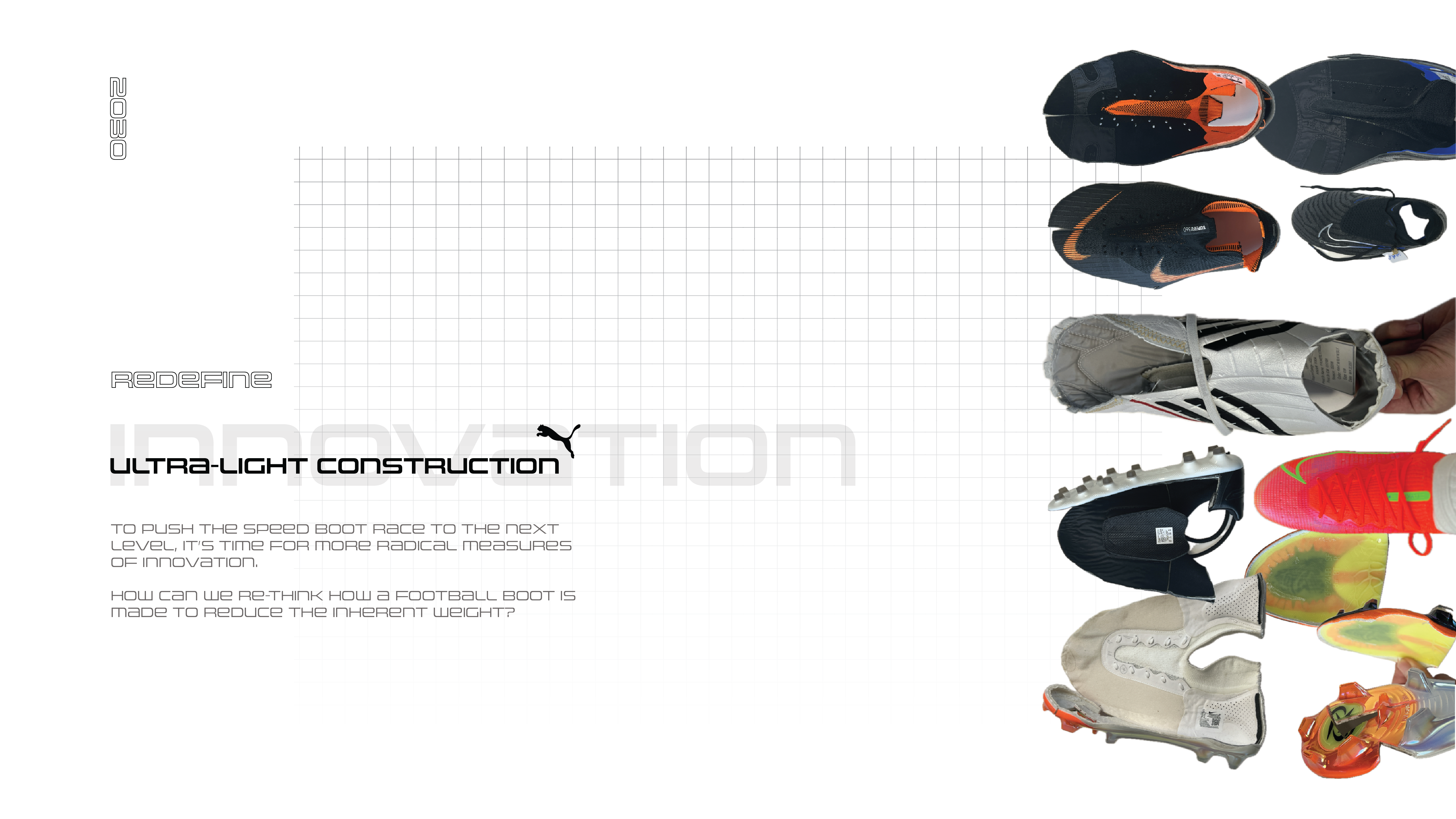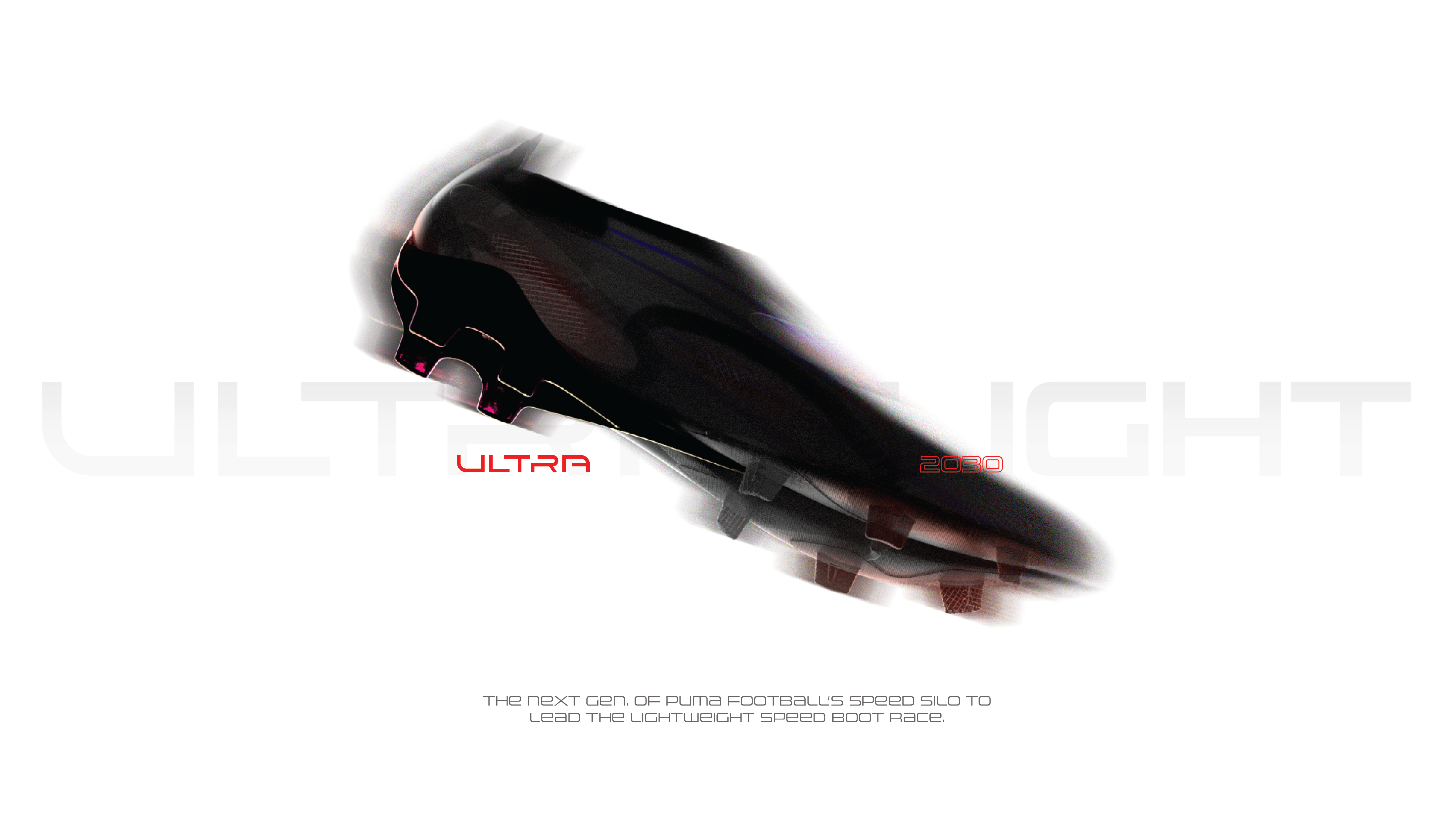 Puma 'Ultra Ultimate,' is the brands' premier Speed silo within the Puma football (soccer) boot lineup. This project was a 1-week design task to imagine the future of this important boot in the year 2030. Consider the landscape of football culture and performance, as well as material trends and innovation to create a novel concept to improve 'Speed.'