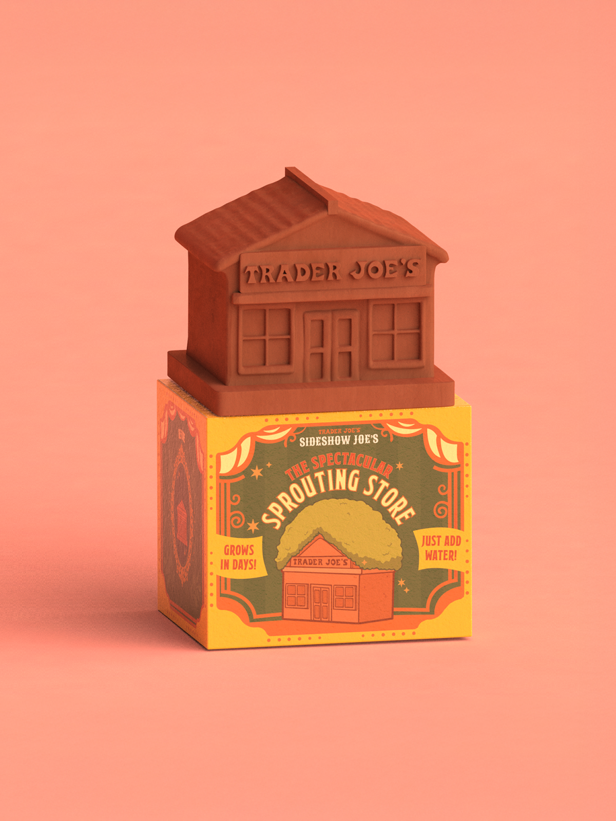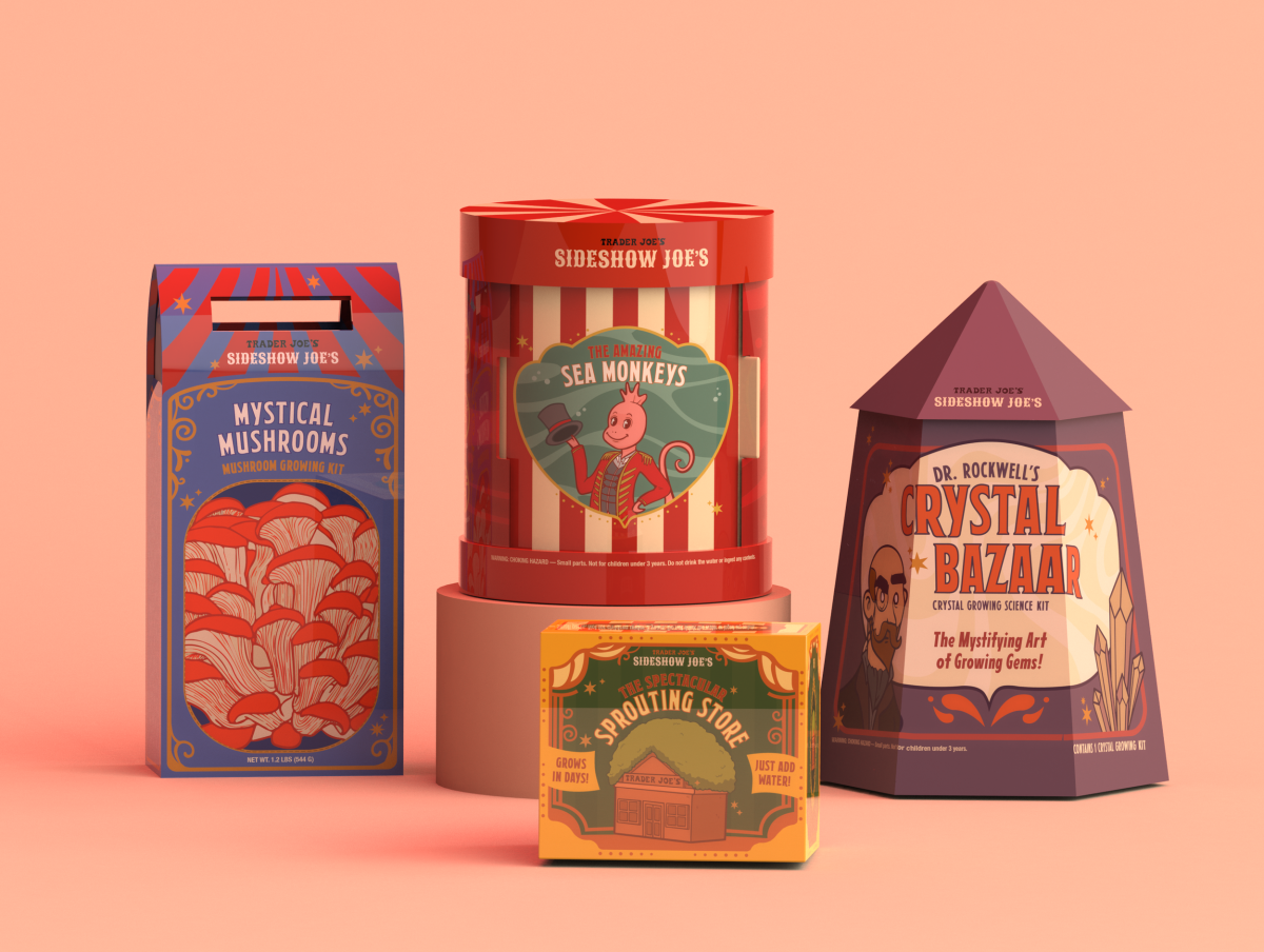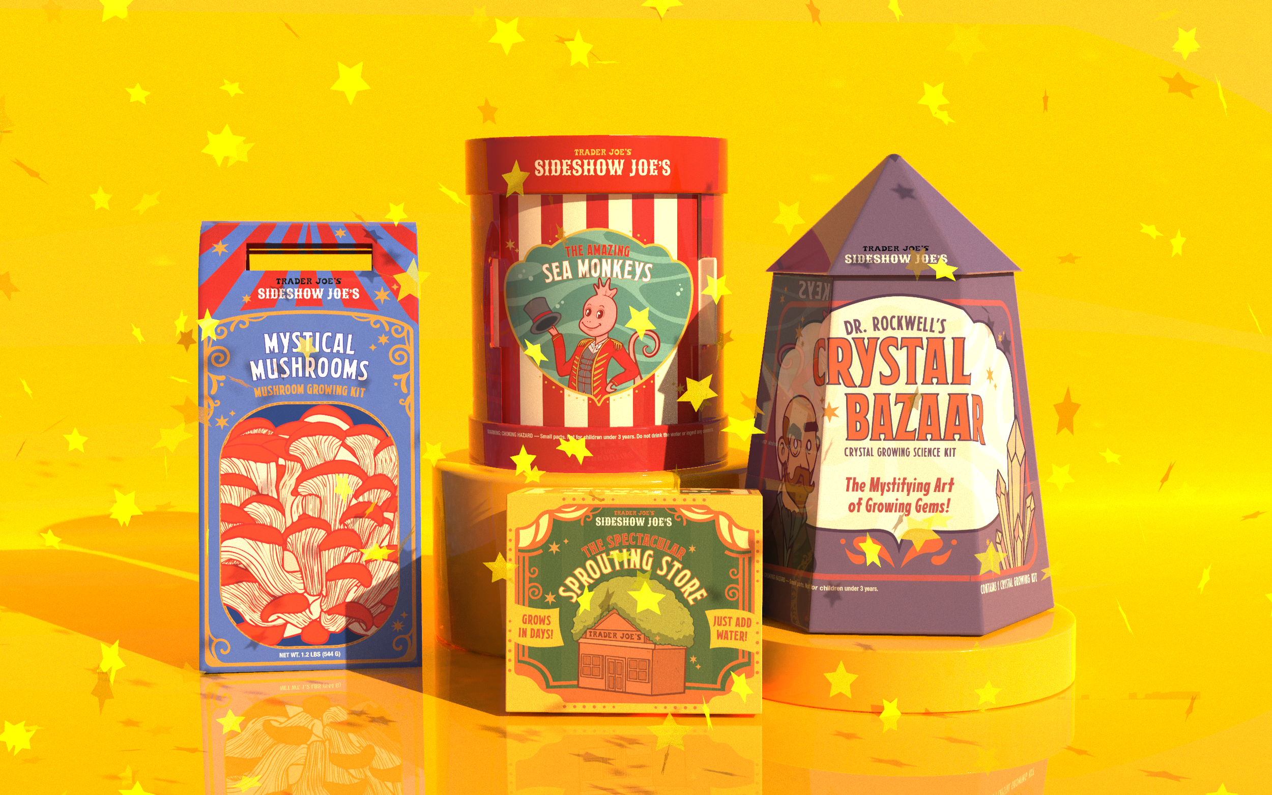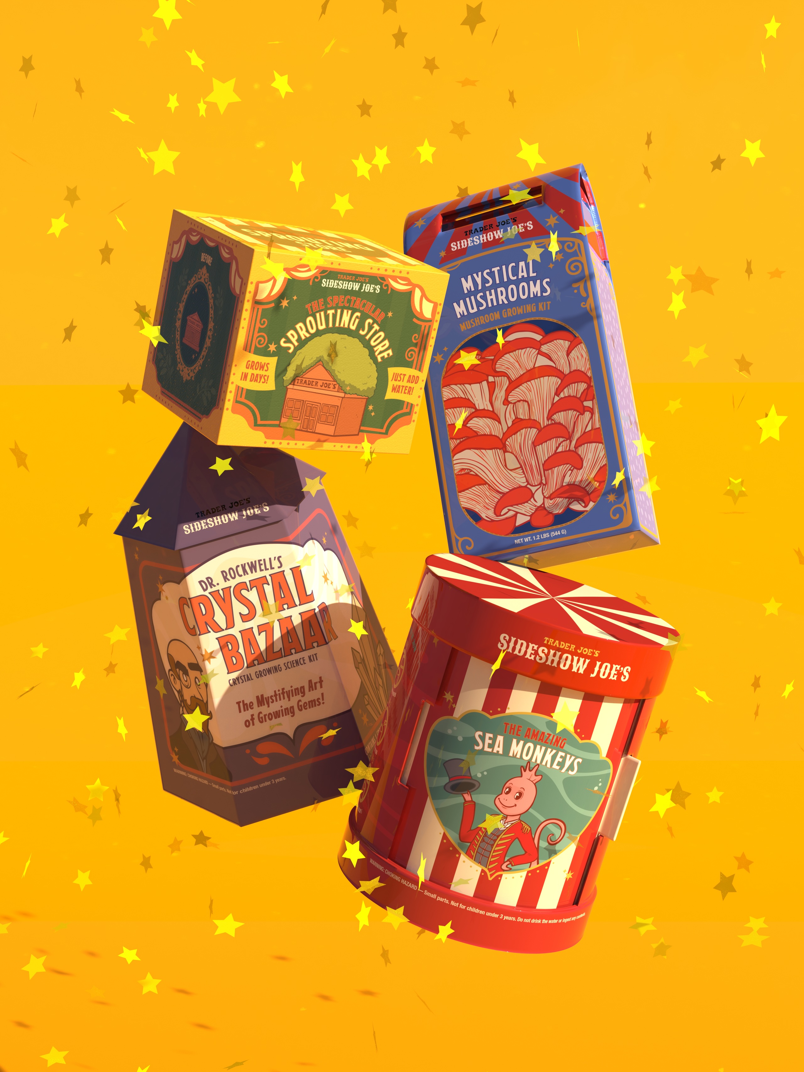 A line of growable kits, crystals, sea monkeys, mushrooms, and a sprouting sculpture, packaged as vintage circus attractions under Sideshow Joe’s.