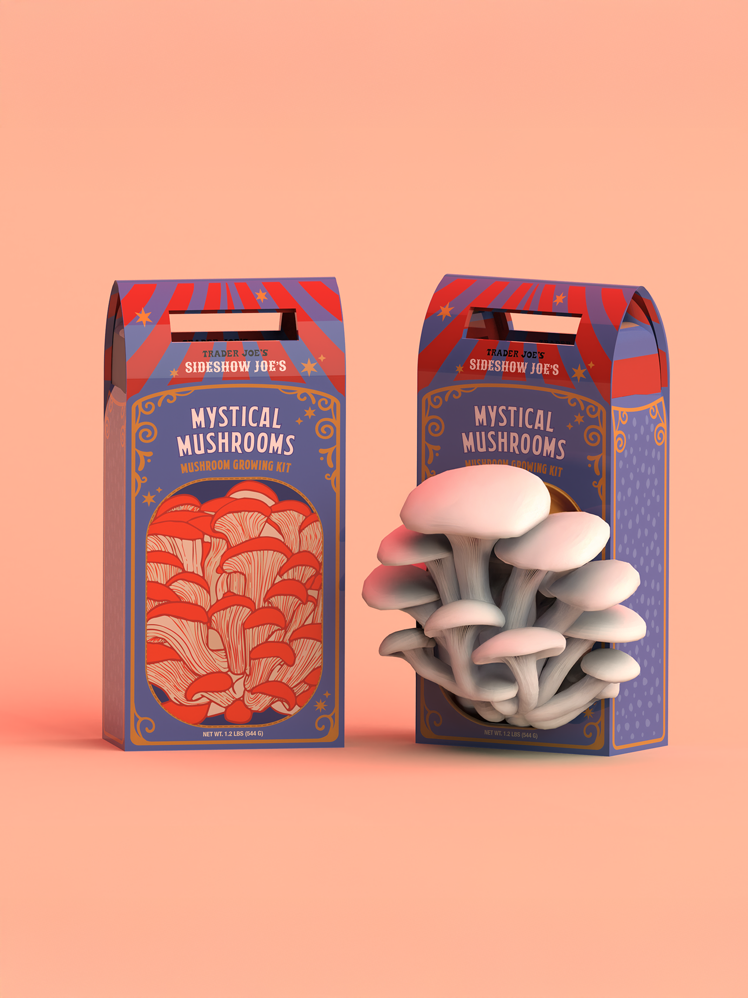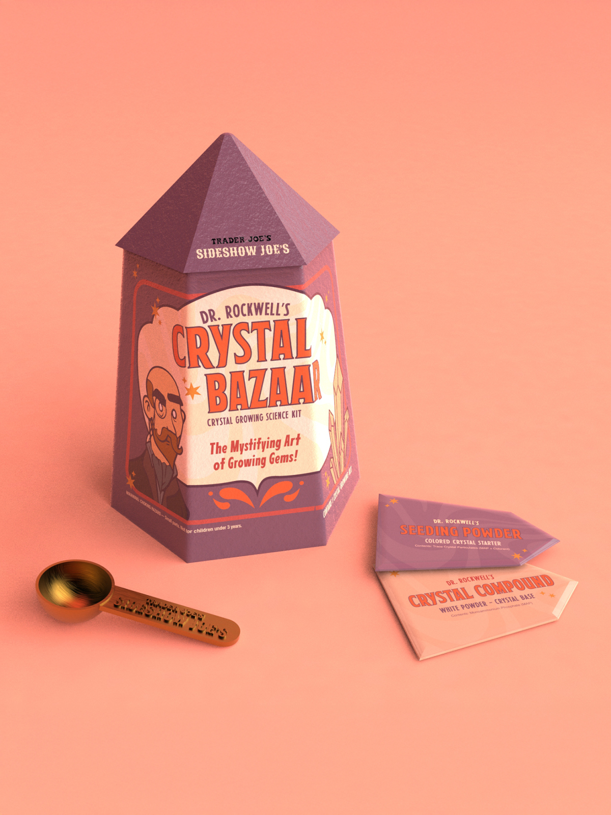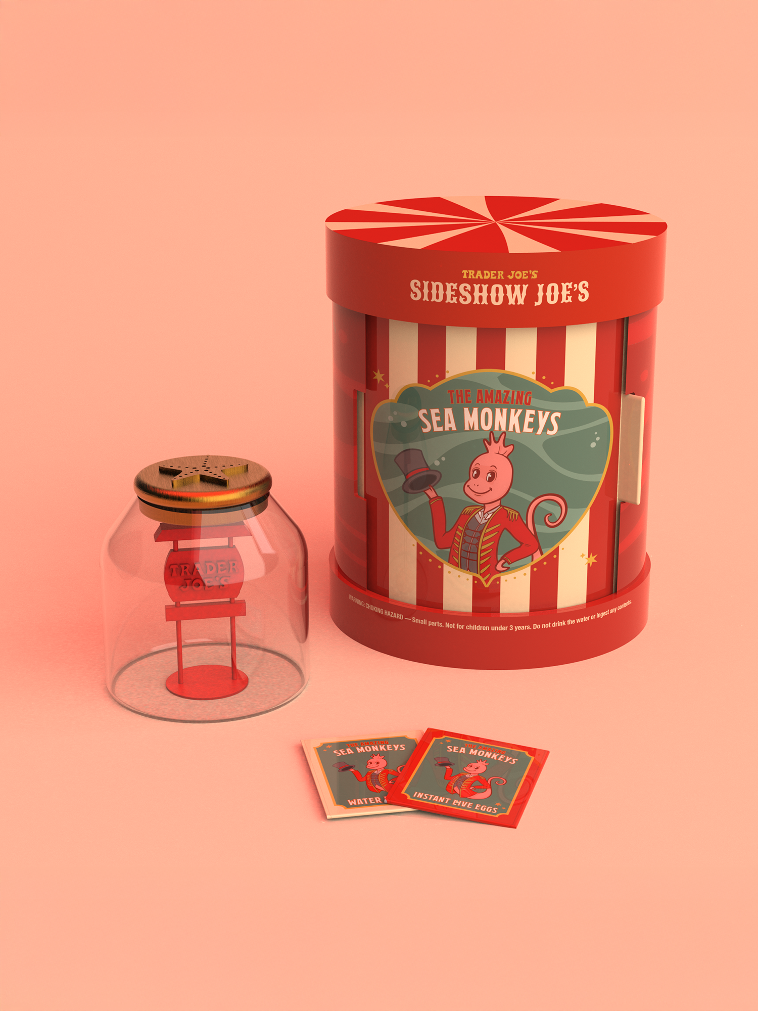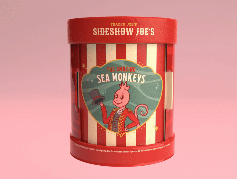 A line of growable kits, crystals, sea monkeys, mushrooms, and a sprouting sculpture, packaged as vintage circus attractions under Sideshow Joe’s.