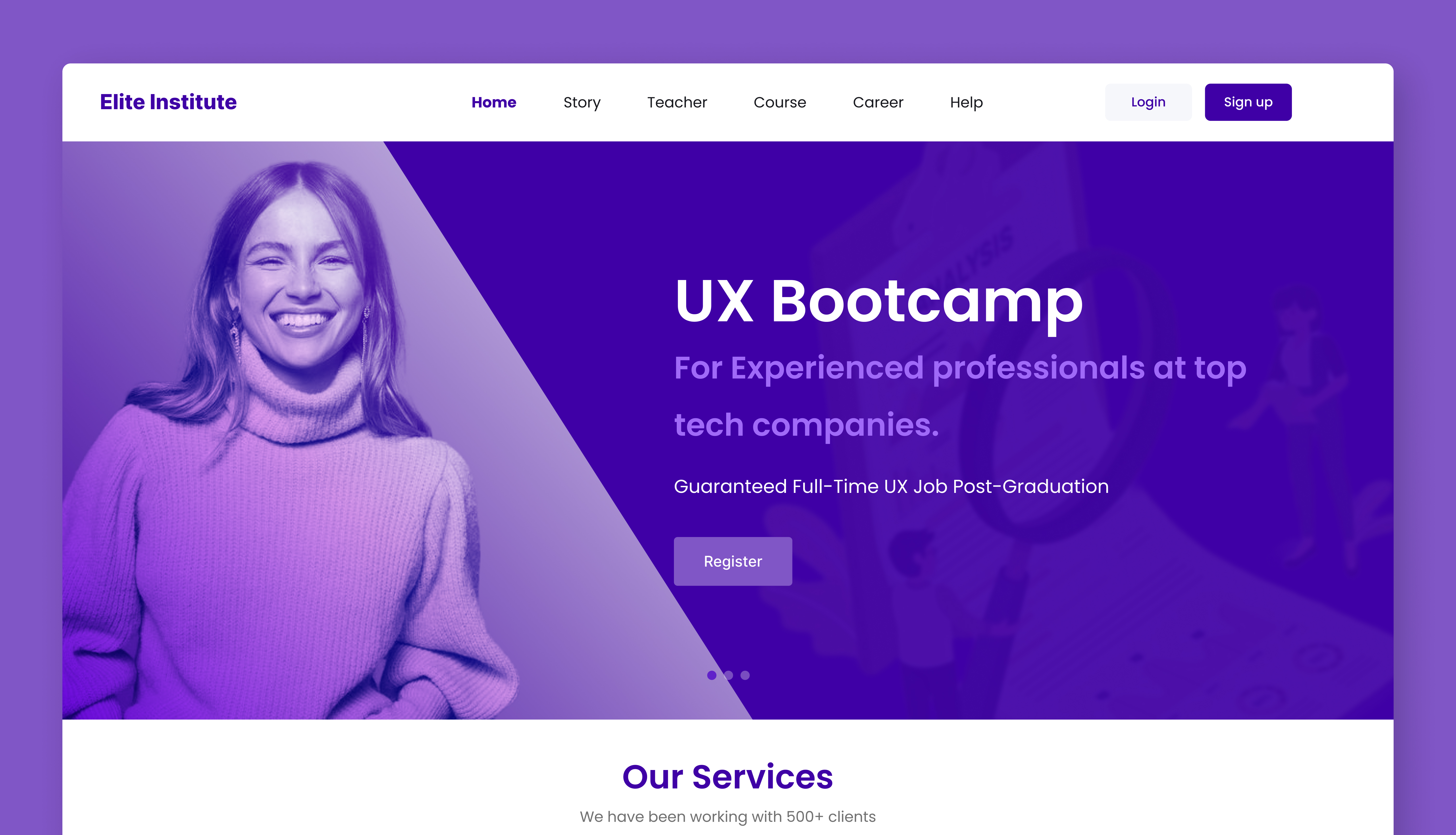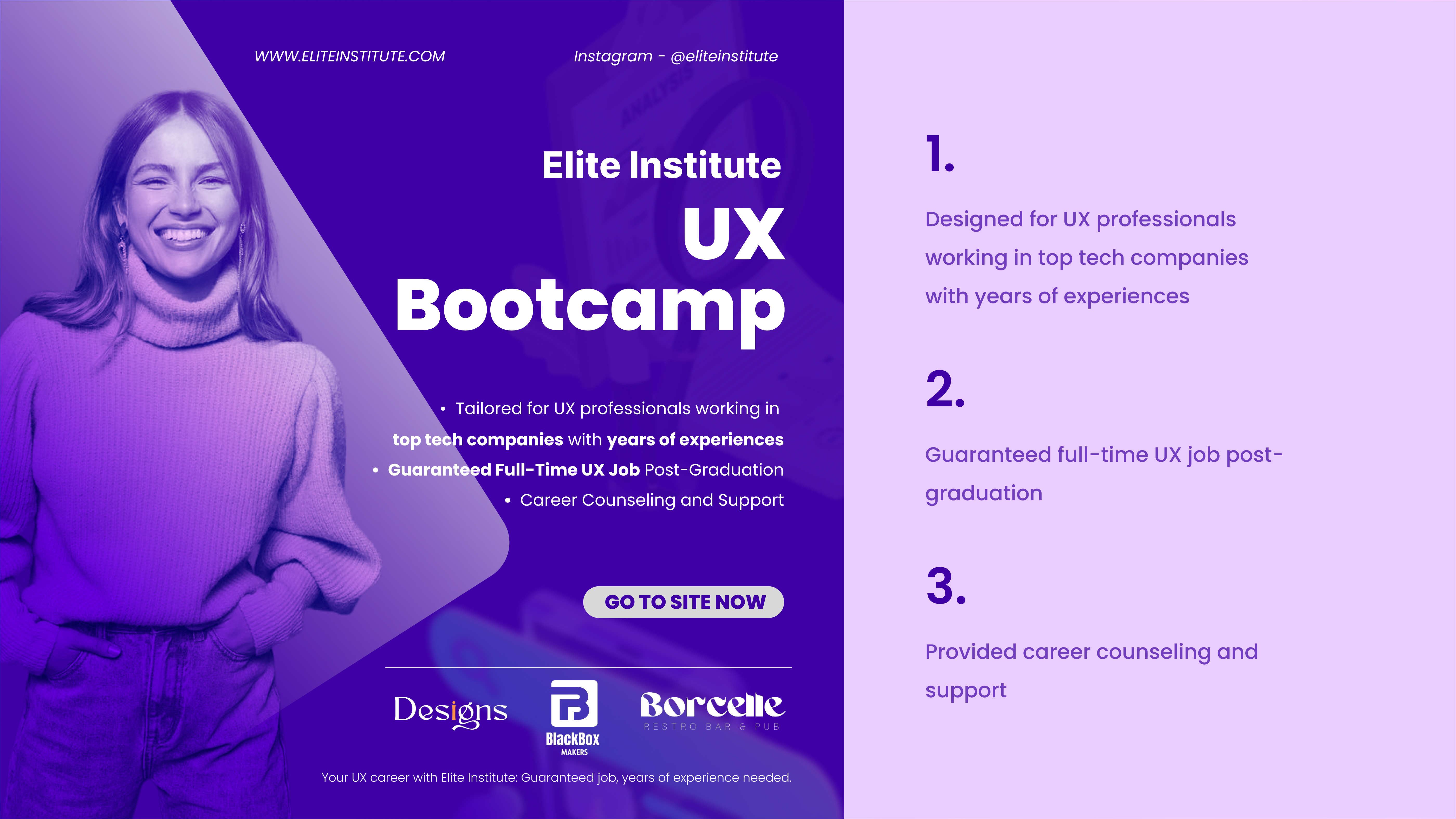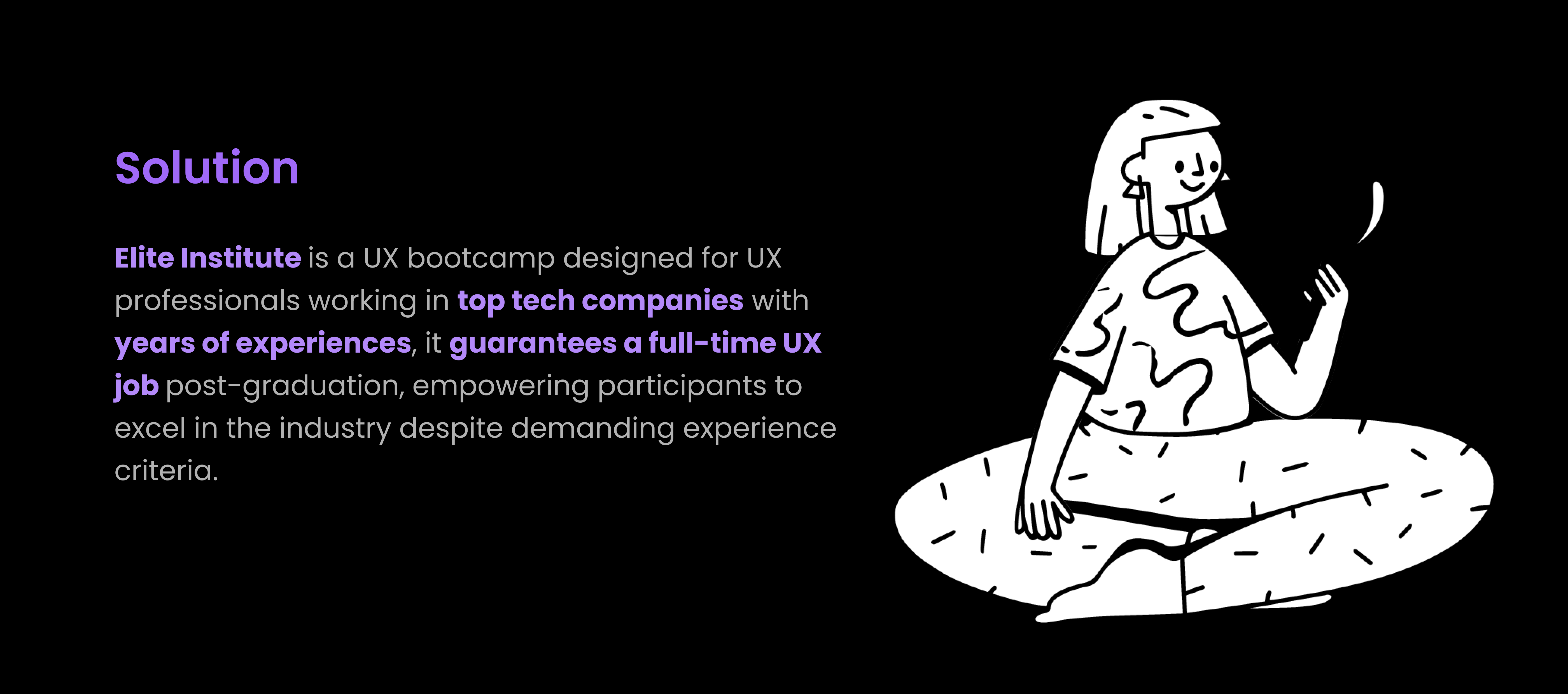 Elite Institute is a specialized UX bootcamp for experienced professionals in top tech companies. It guarantees a full-time UX job post-graduation. Although it seems to address the problem of securing a job after graduation, it actually sheds light on deeper industry issues, critiques hiring practices, and offers a new perspective on the company hiring process.