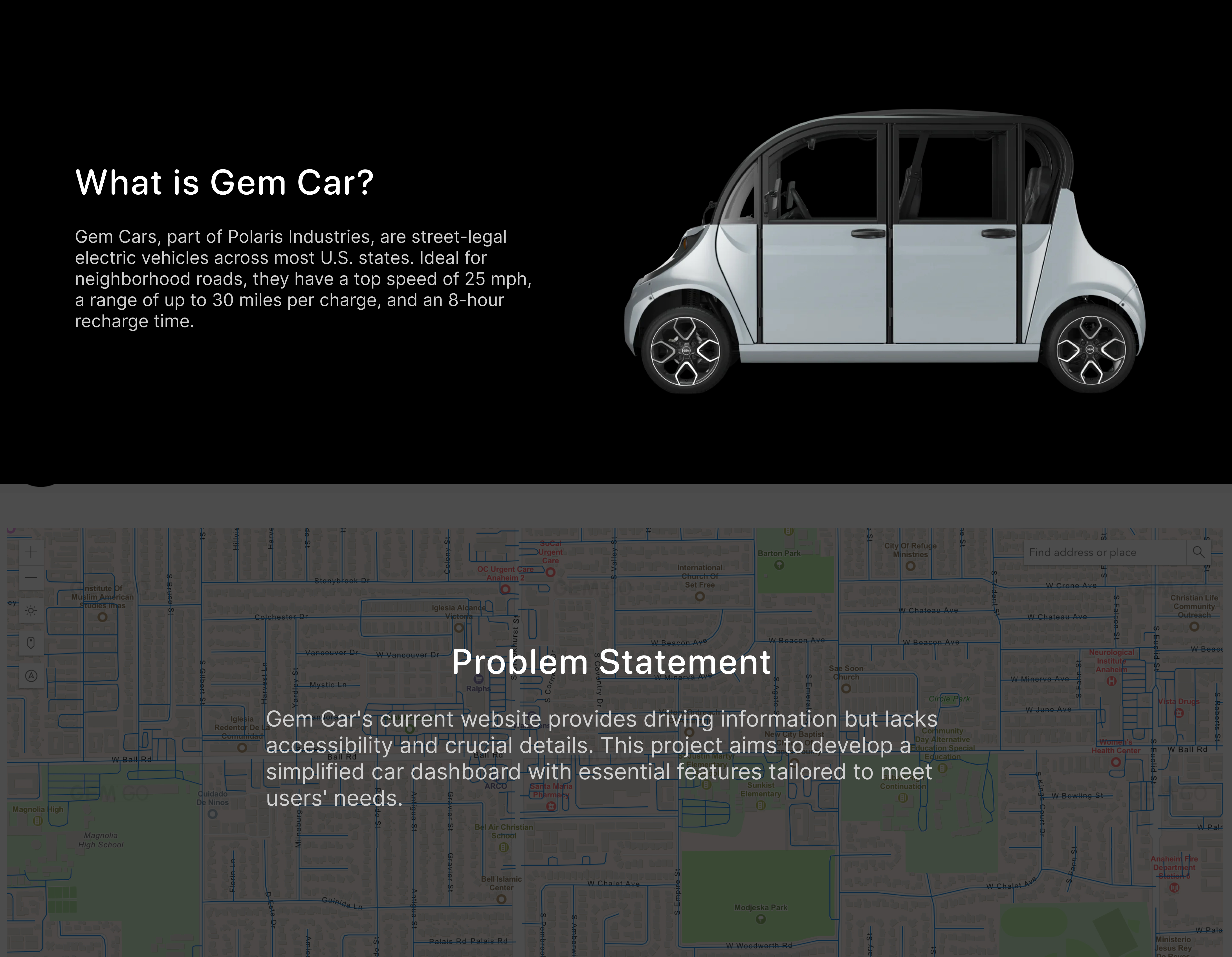 Gem Car's current website provides driving information but lacks accessibility and crucial details. This project aims to develop a simplified car dashboard with essential features tailored to meet users' needs.