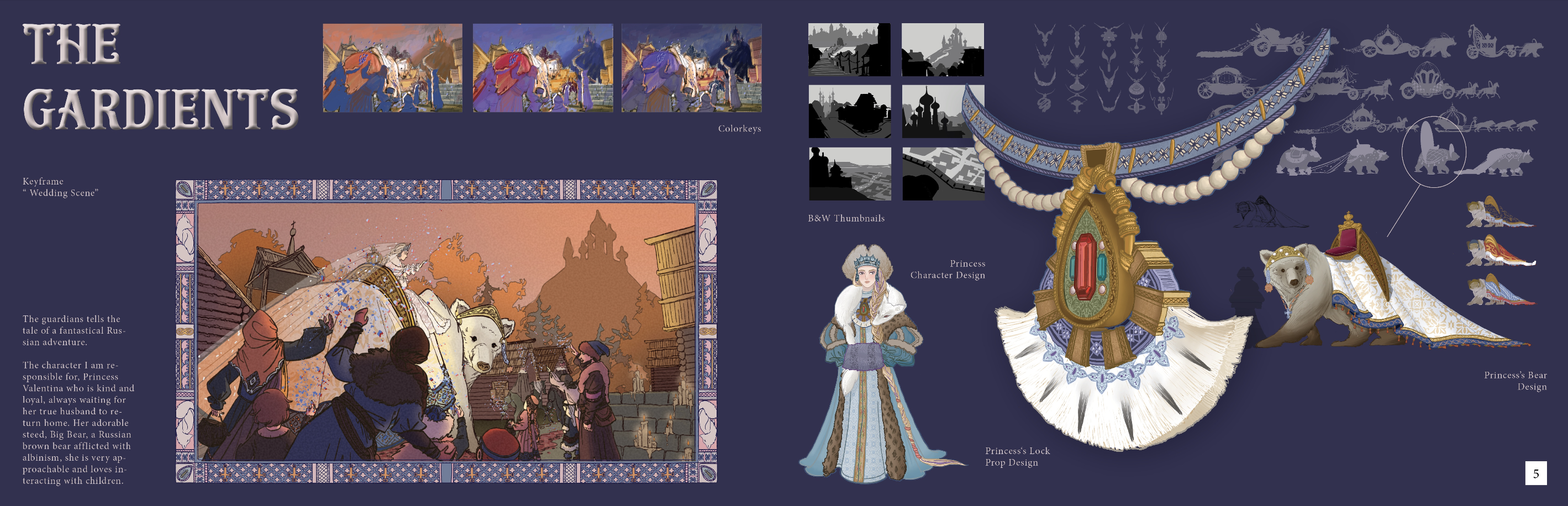 The Guardians tells a story of a fantastical Russian adventure. The character I am responsible for, Princess Valentina who is kind and loyal, always waiting for her true love to return home. Her adorable steed, BigBear, a Russian brown bear afflicted with albinism, she is very approachable and loves interacting with children.