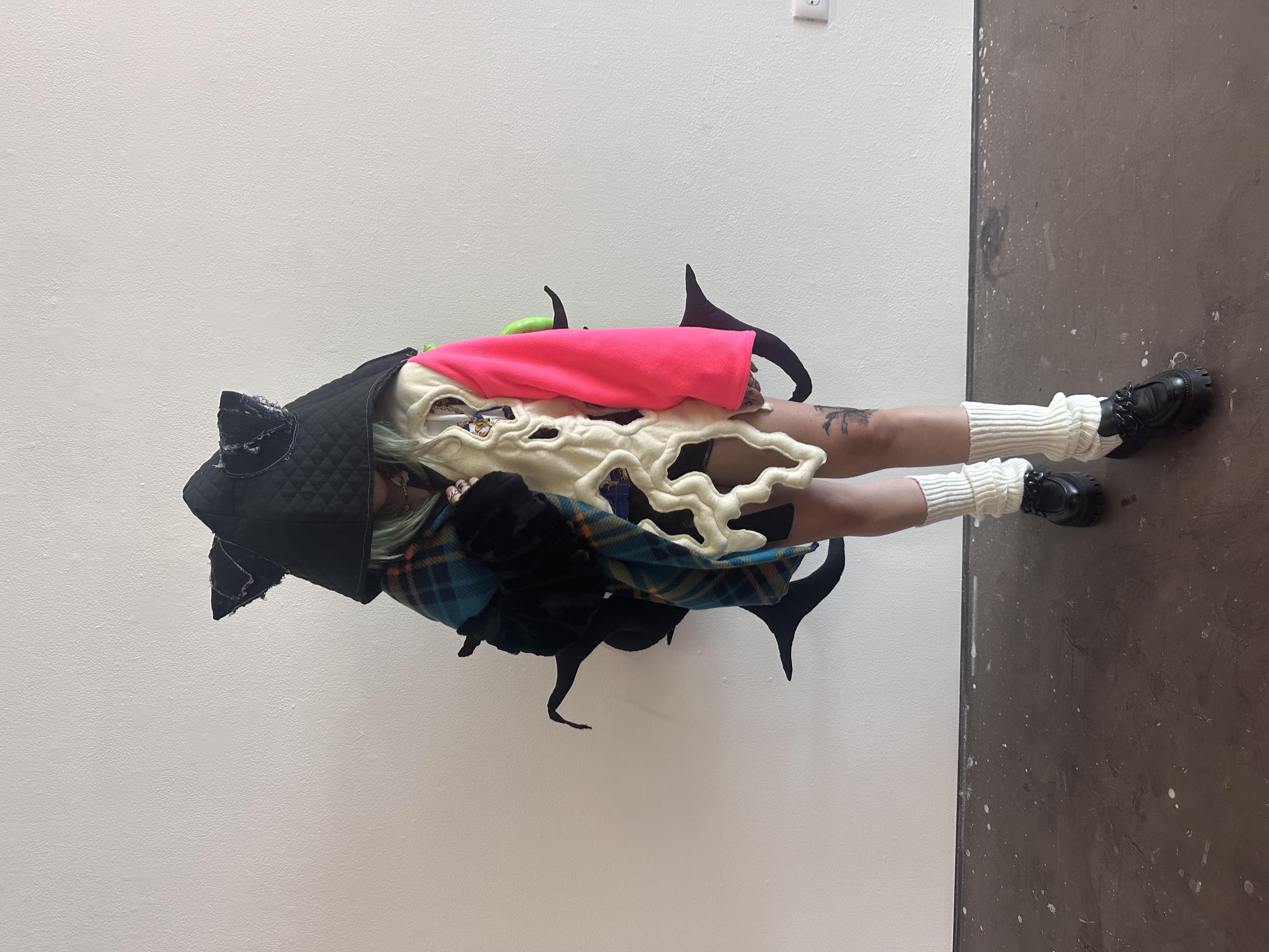 Graduates Select DepartmentBrand Design & StrategyCreative DirectionEntertainment DesignFilmFine ArtFurniture, Lighting and FixturesGraduate ArtGraduate FilmGraduate Graphic DesignGraduate Interaction DesignGraduate Spatial Experience DesignGraphic DesignIllustrationIndustrial DesignInteraction DesignMedia Design PracticesPhotography and ImagingProduct DesignSpatial Experience DesignTransportation DesignTransportation Systems and Design Back to Projects Mia Zappala BFA in Fine Art — Fine Art Body Snatcher plaid fleece melton wool pink fleece - ribbed fur - double quilted cotton - denim - cotton - pleather - chiffon - polyester stuffing - safety pins - white PLA plastic Image back view Image hood view Image front/body view