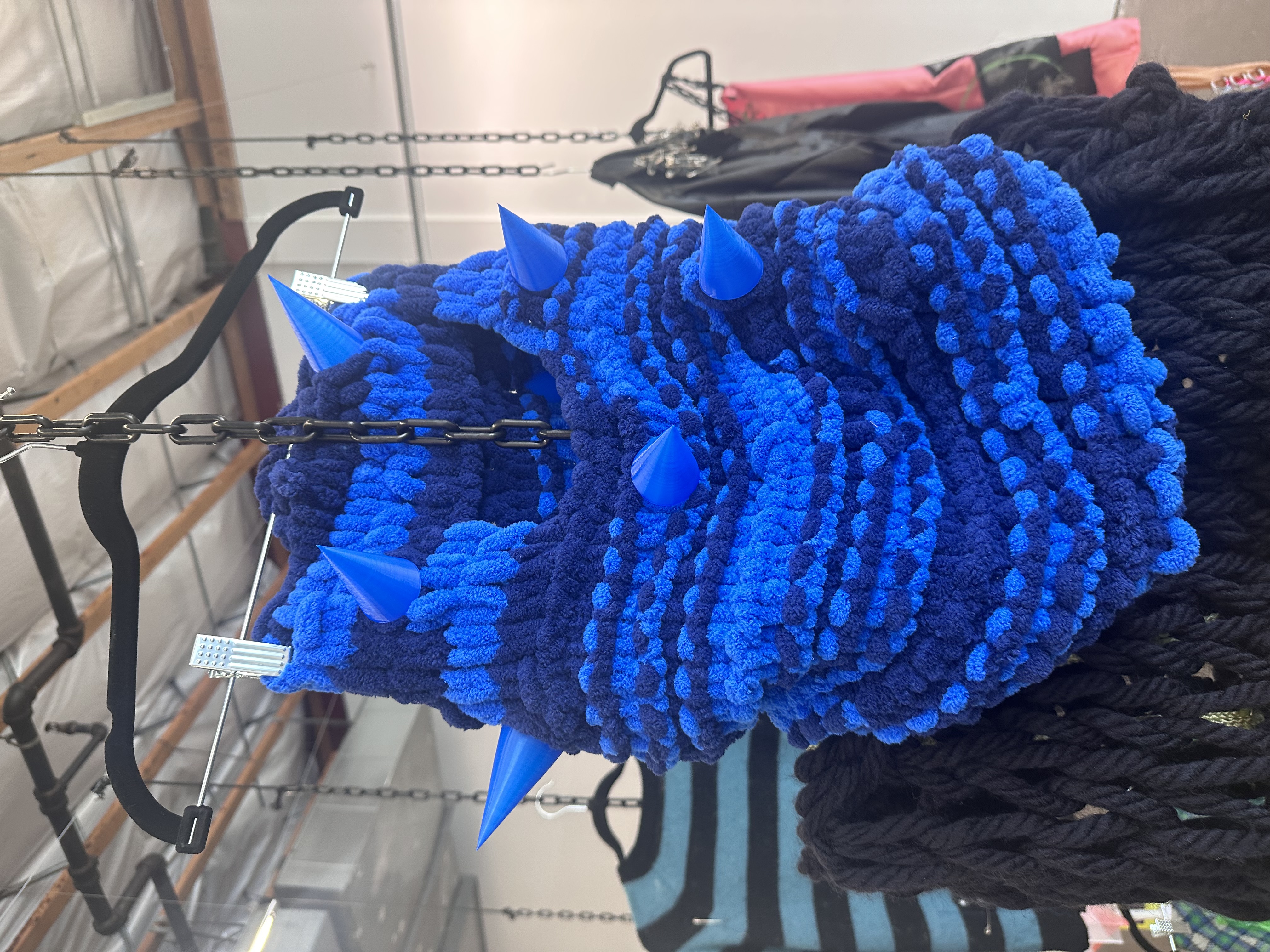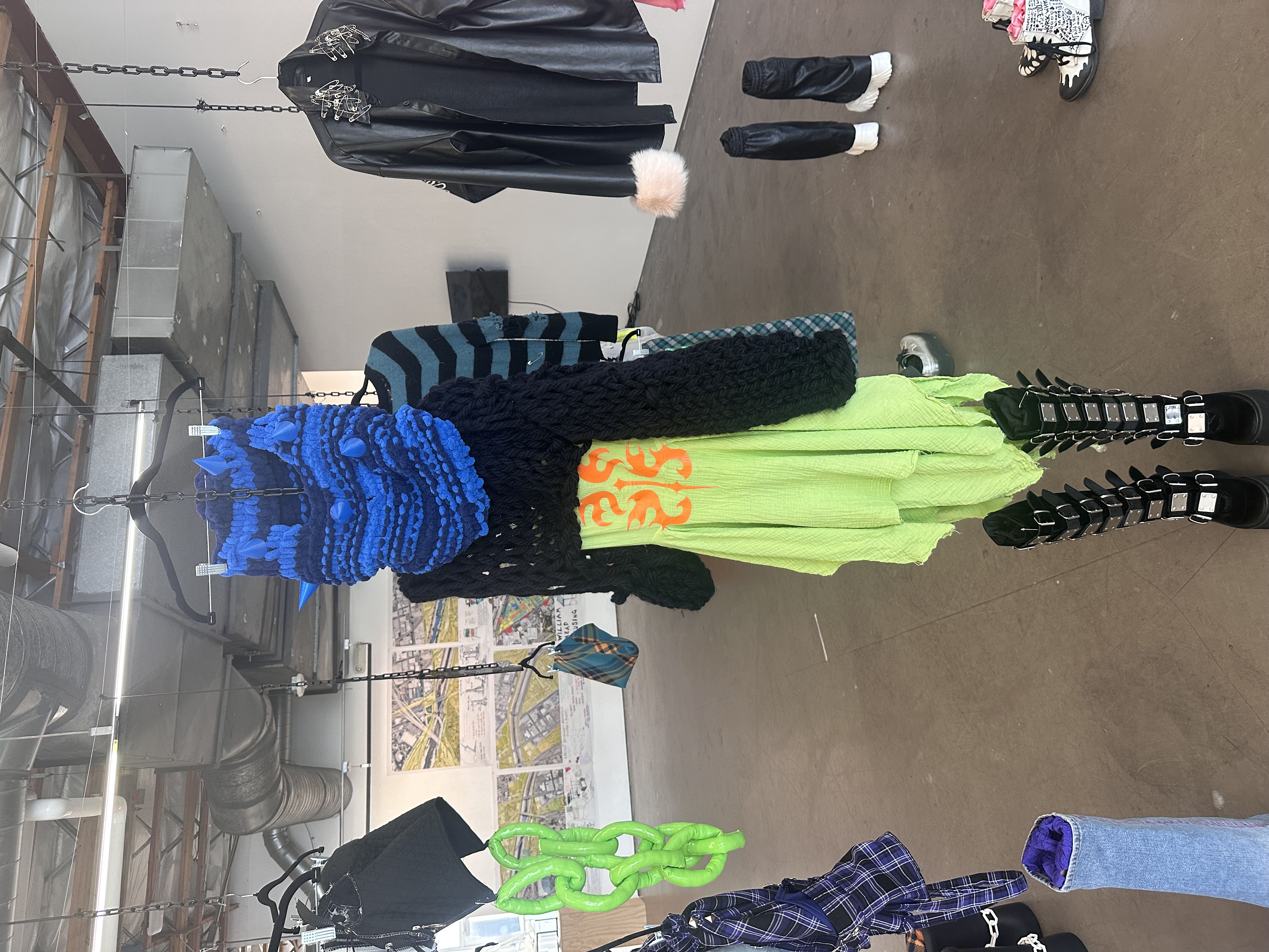 - cotton linen - iron-on vinyl - yarn - blue PLA plastic - rope originally - neon green dye - metal grommets