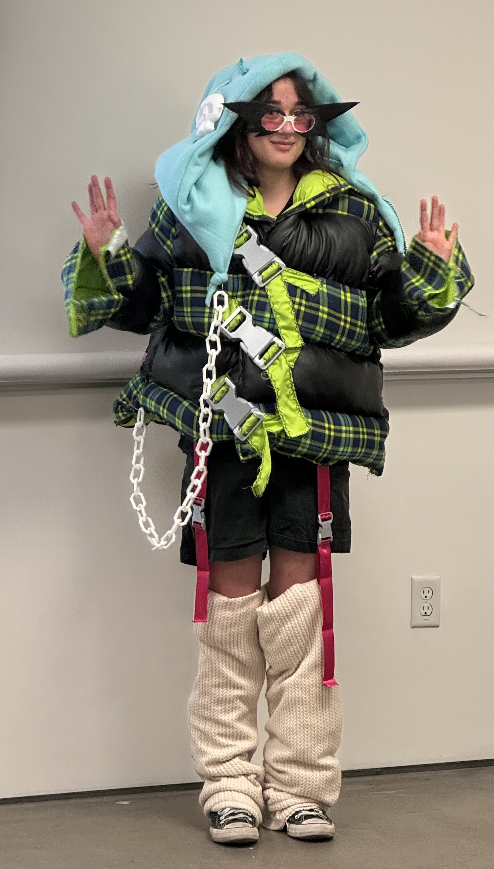 cotton flannel, pleather, cotton, fleece, knit, satin ribbon, PLA plastic filament, metal grommets, nylon rope, safety pins, polyfill stuffing, vinyl plastic, plastic glasses, masking tape, acrylic paint