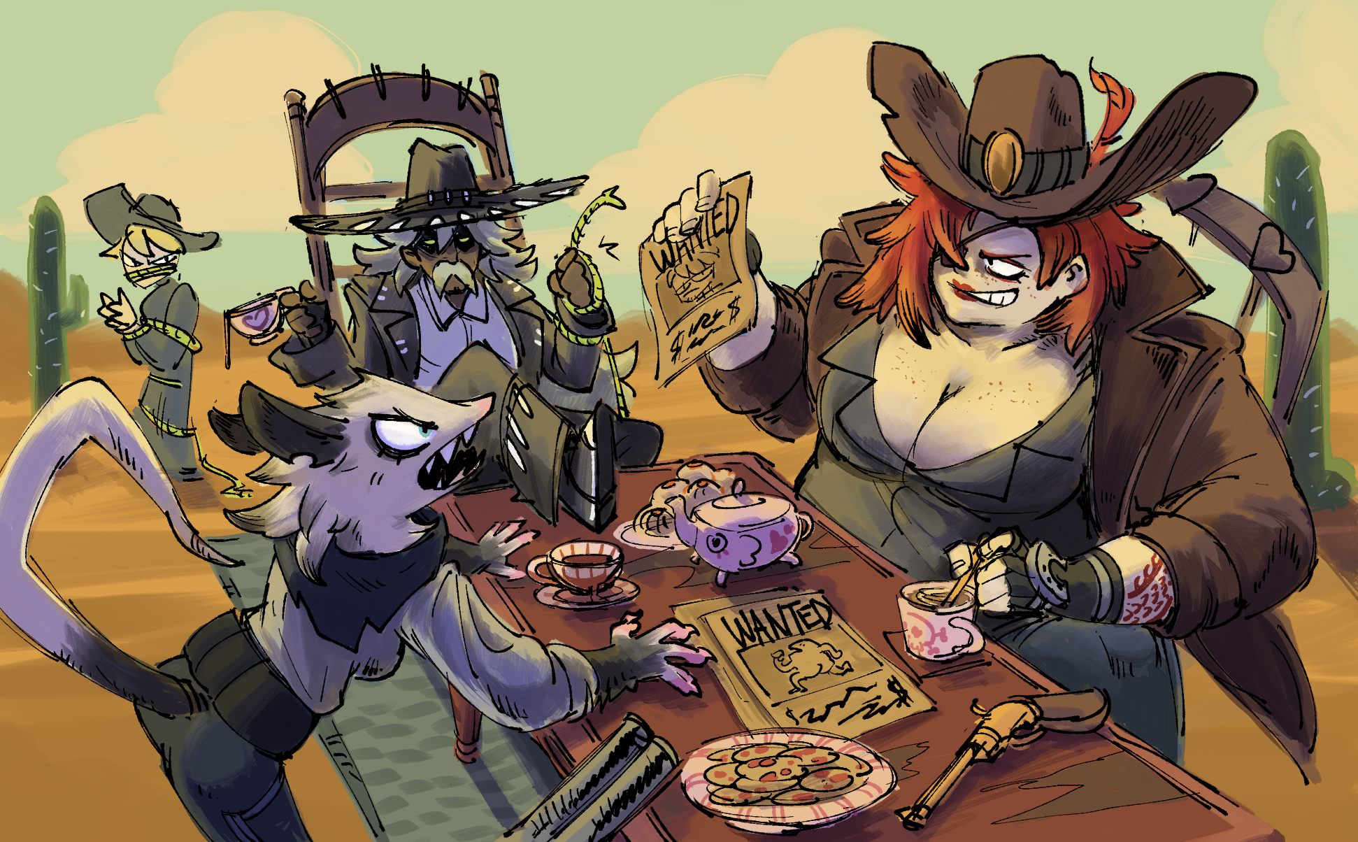This is a quick scene sketch I did for Character design when TAing. the prompt was "cowboy tea party" so I got to design some fun western vagabonds. I wanted to also lean into my stylized direct linework, and prove myself that I can compose a multiple character scene within a short period of time.
