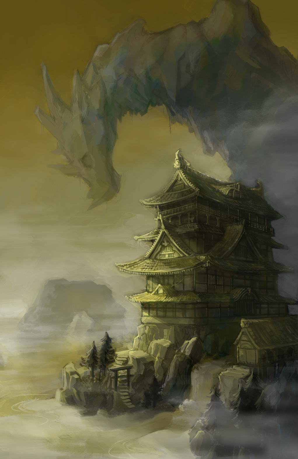 A piece from my Matte painting class. For the assignment, I had to produce a piece with a Japanese style castle, along with a dragon shaped rock formation.