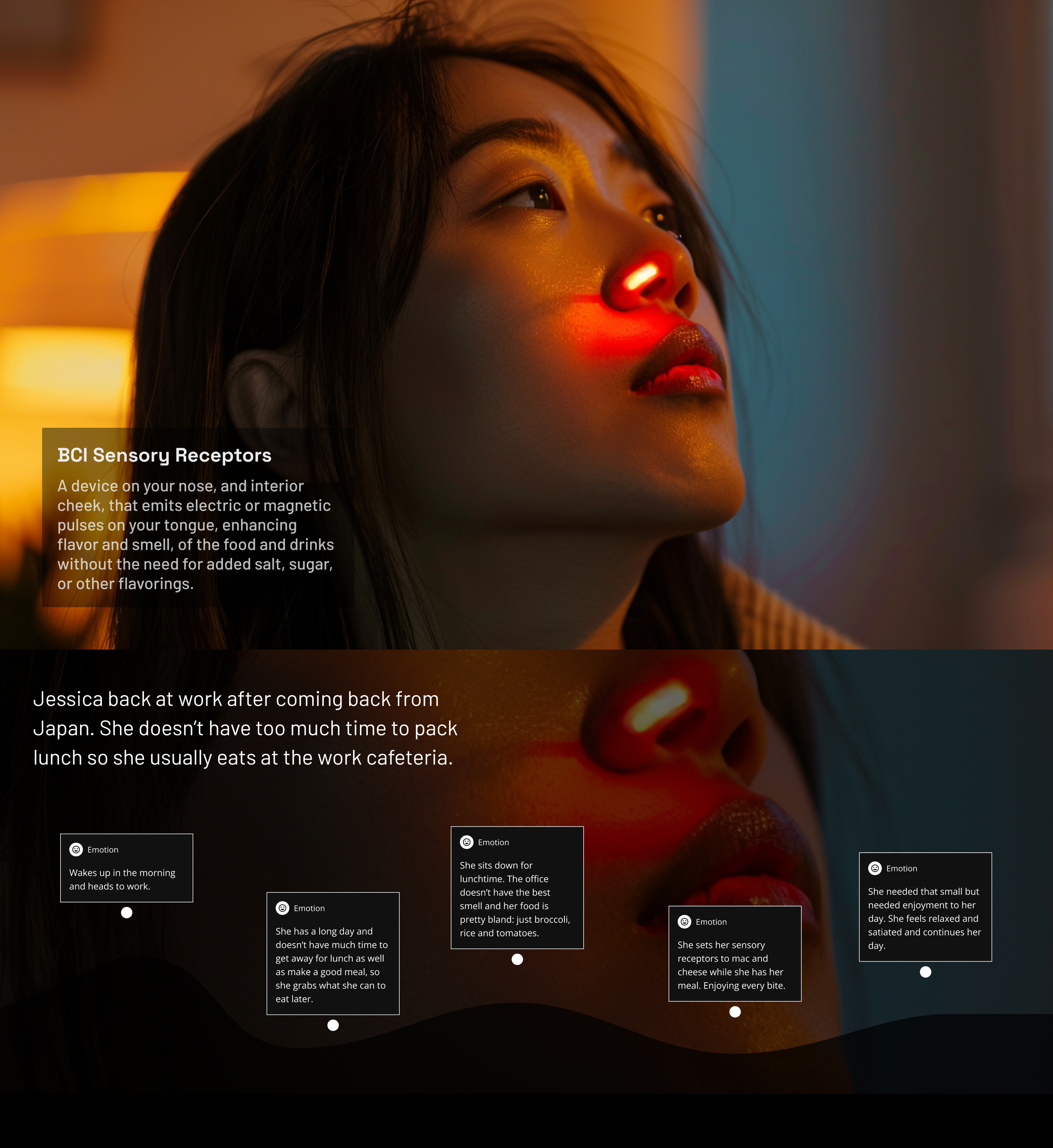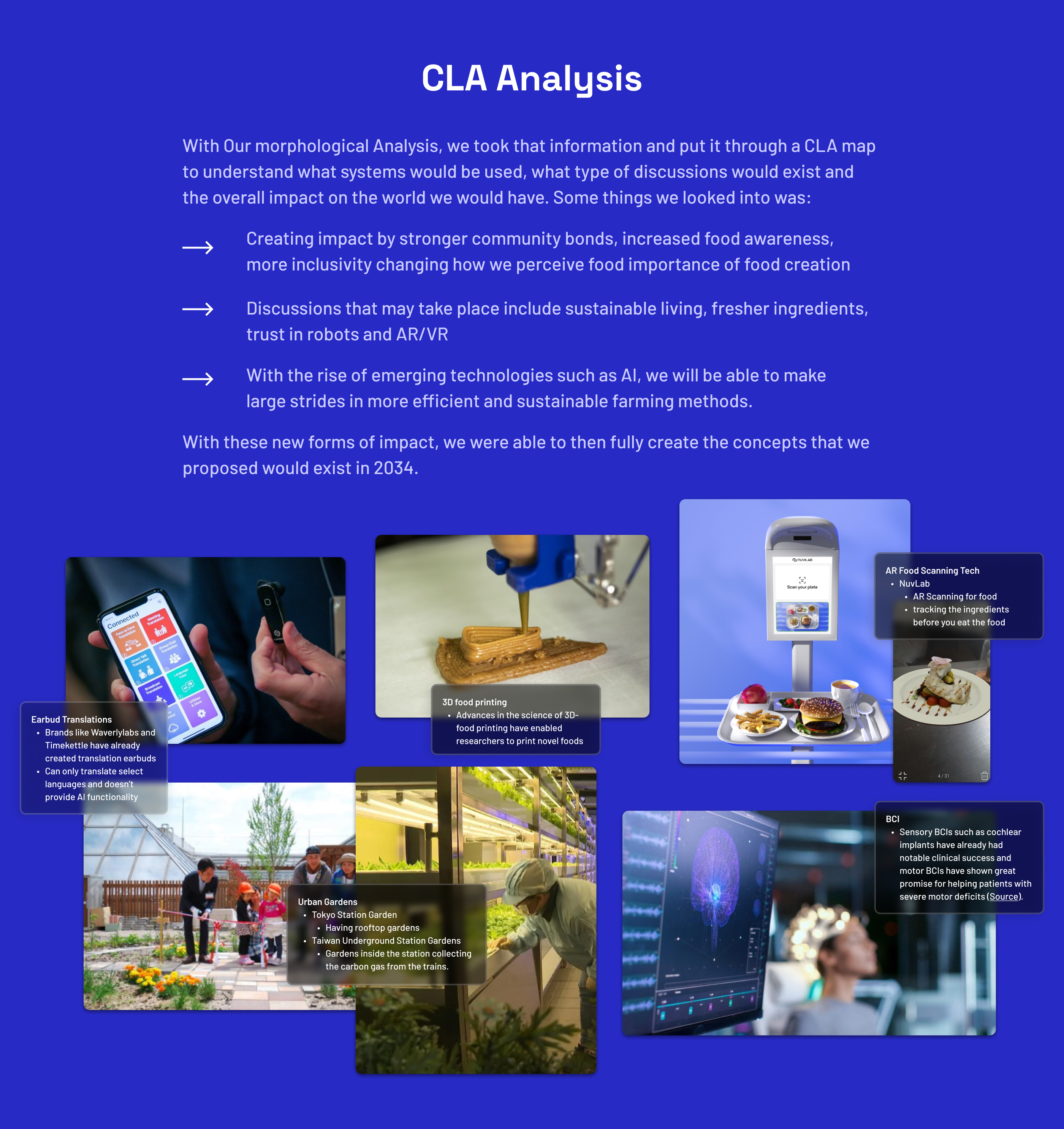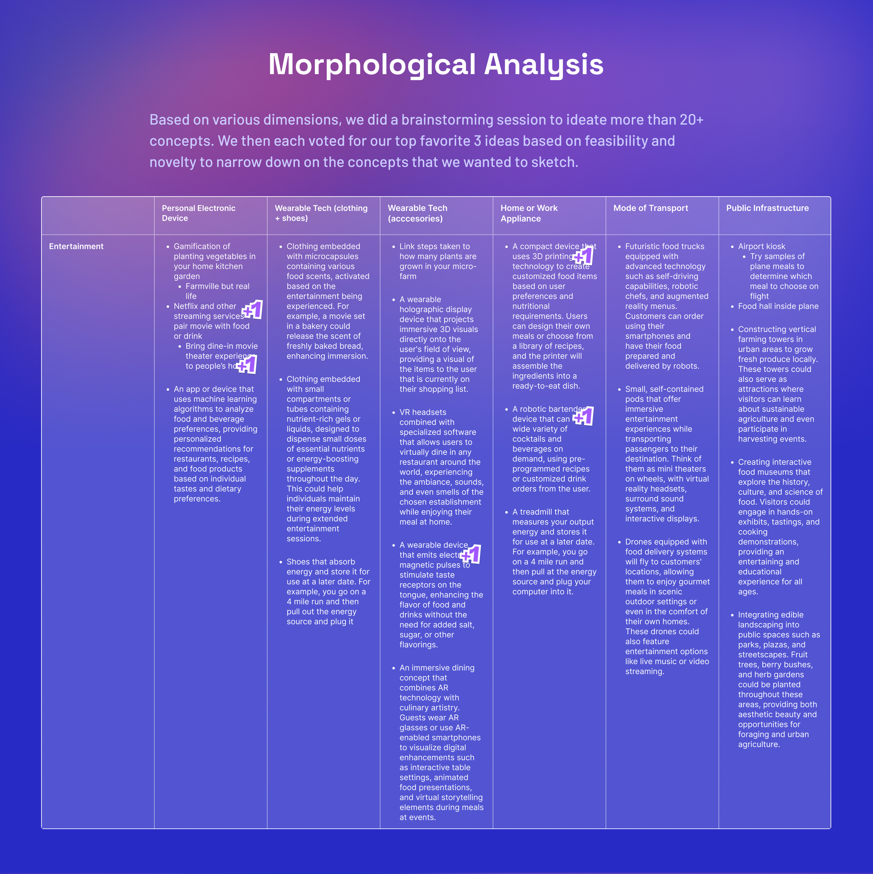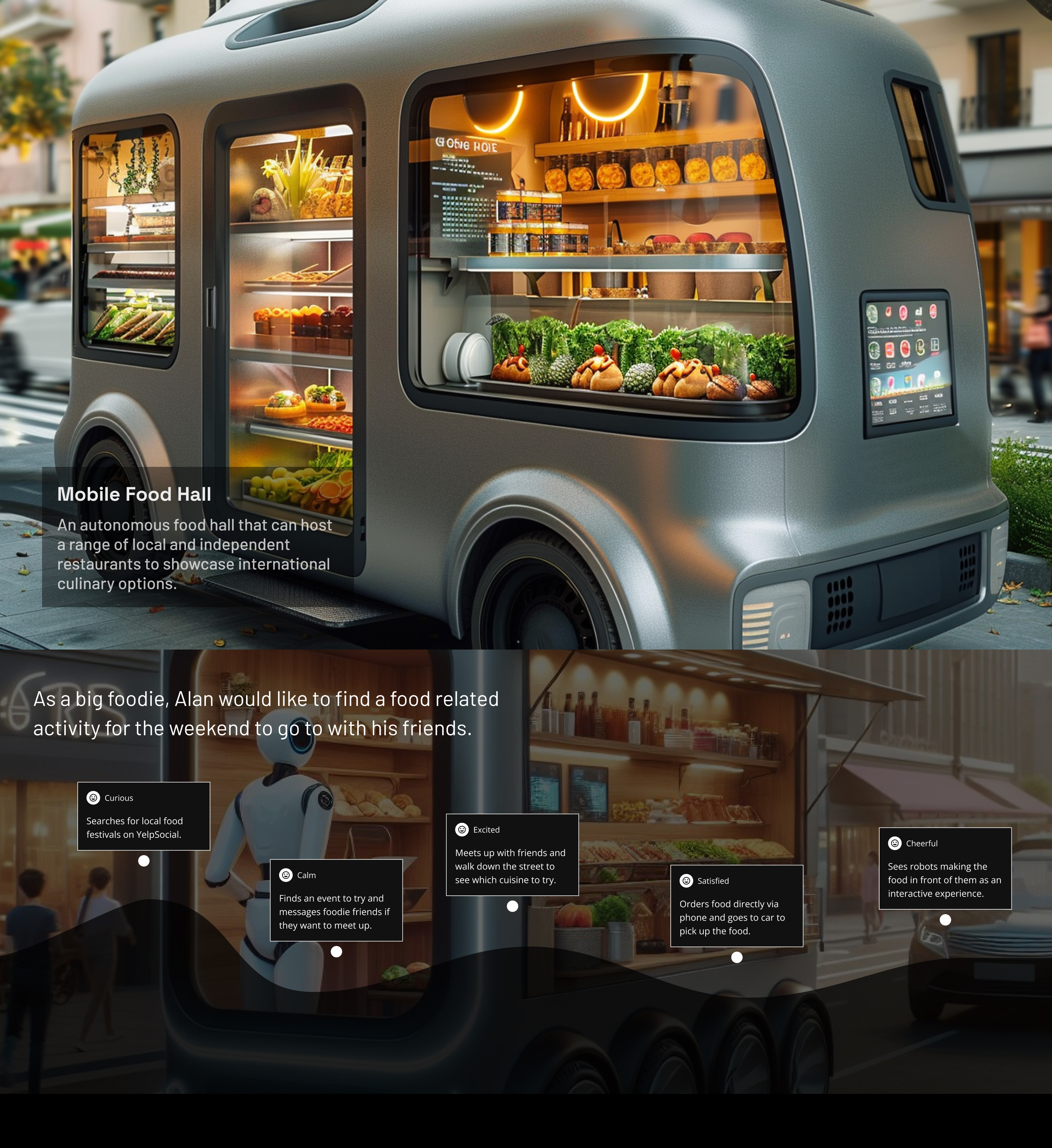 Utilizing four personas and a morphological analysis, our team was able to speculate new concepts to facilitate human interaction with food. Team members: Andrea Chau, Eric Fillingame, Mengdian Xing, Michelle Chen.