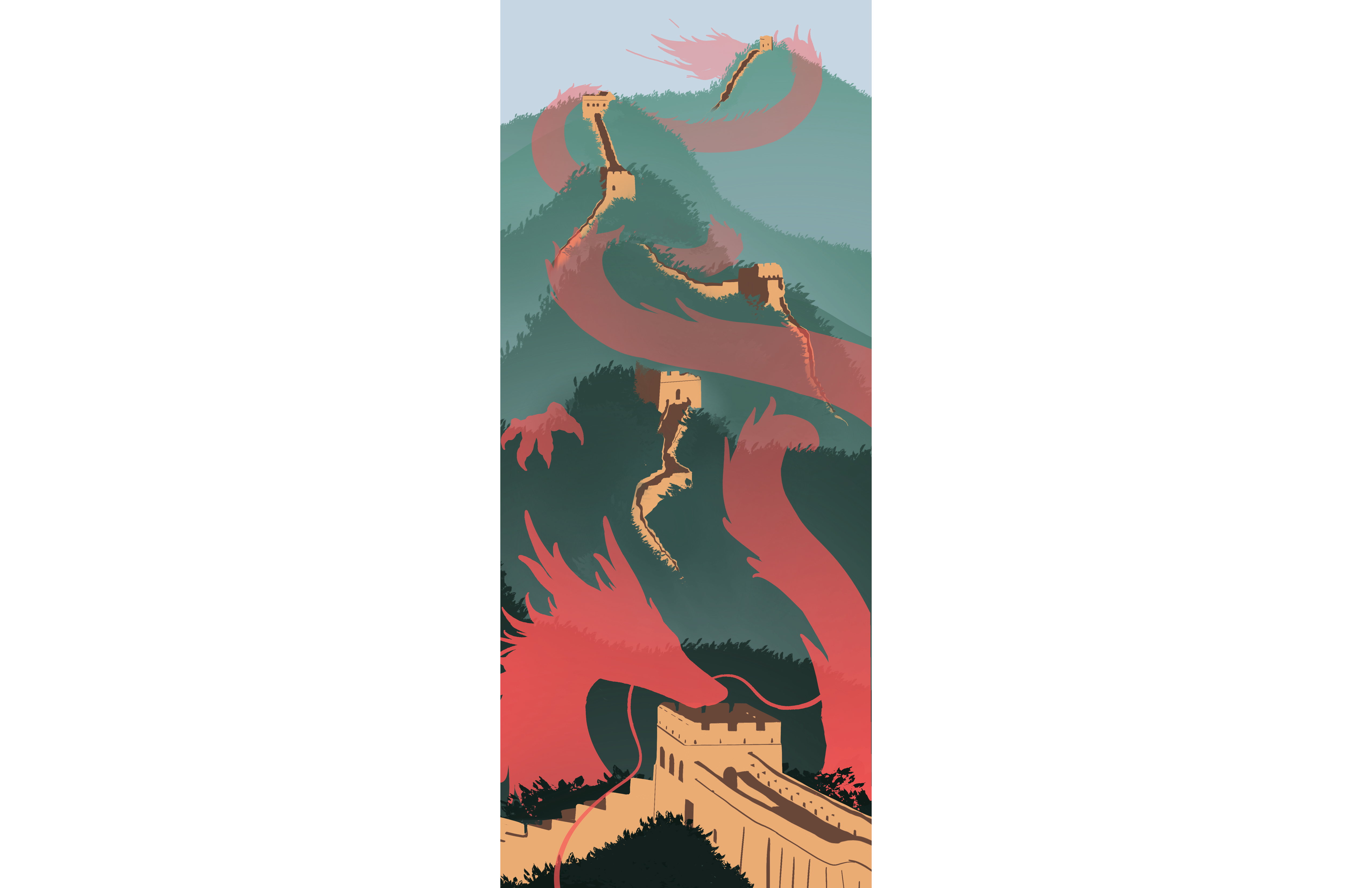 This is project Gestalt - Configuration, the place is "the Great Wall", I named it "the Ancient Guardian". It is 5 by 12 inches, and created with "Procreate". My idea is the dragon and the great wall both are representatives of Chinese tradition, they guarded each other. I add many layers of mountains and erase the bottom part so the background doesn't feel heavy. To bring contrast with the Great Wall, I darkened the color of the mountains and brighten the color and transparency of the dragon.