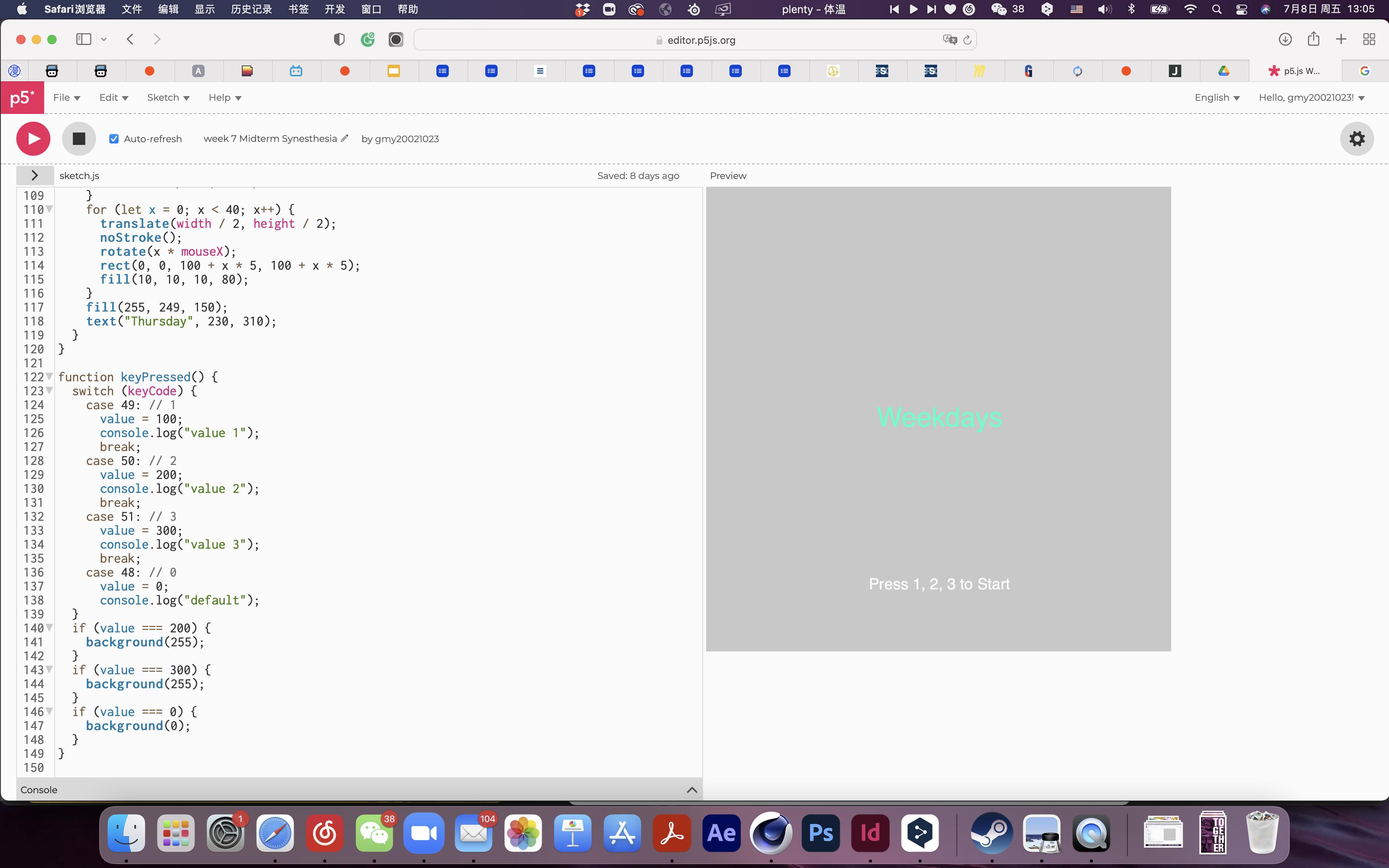 Create a project inspired by the subject and phenomenon of synesthesia. I express and represent Tuesday, Wednesday, and Thursday's senses using coding. https://editor.p5js.org/gmy20021023/sketches/ZeQF6VlWf