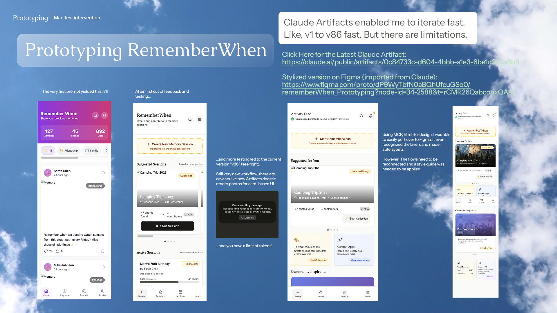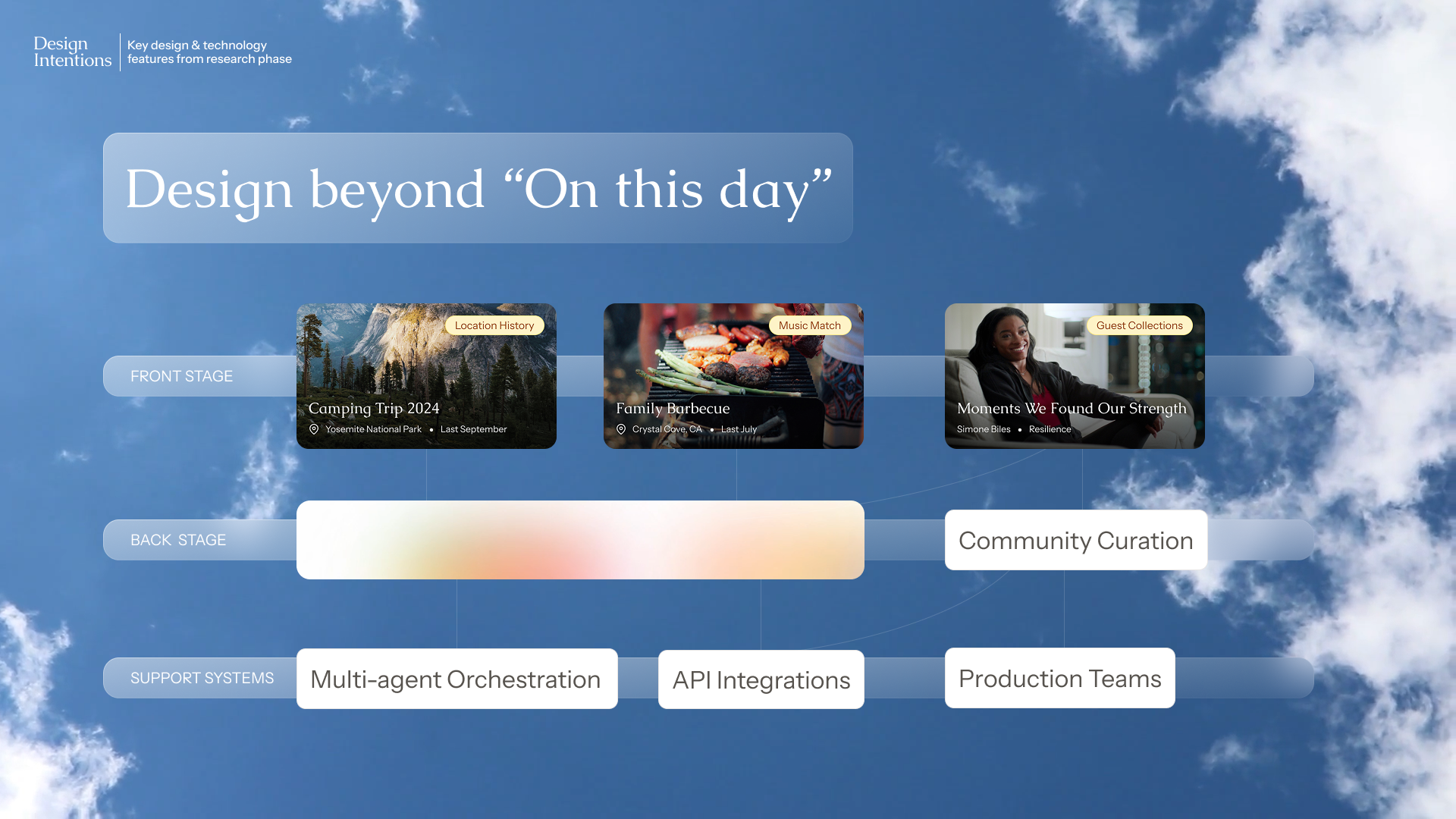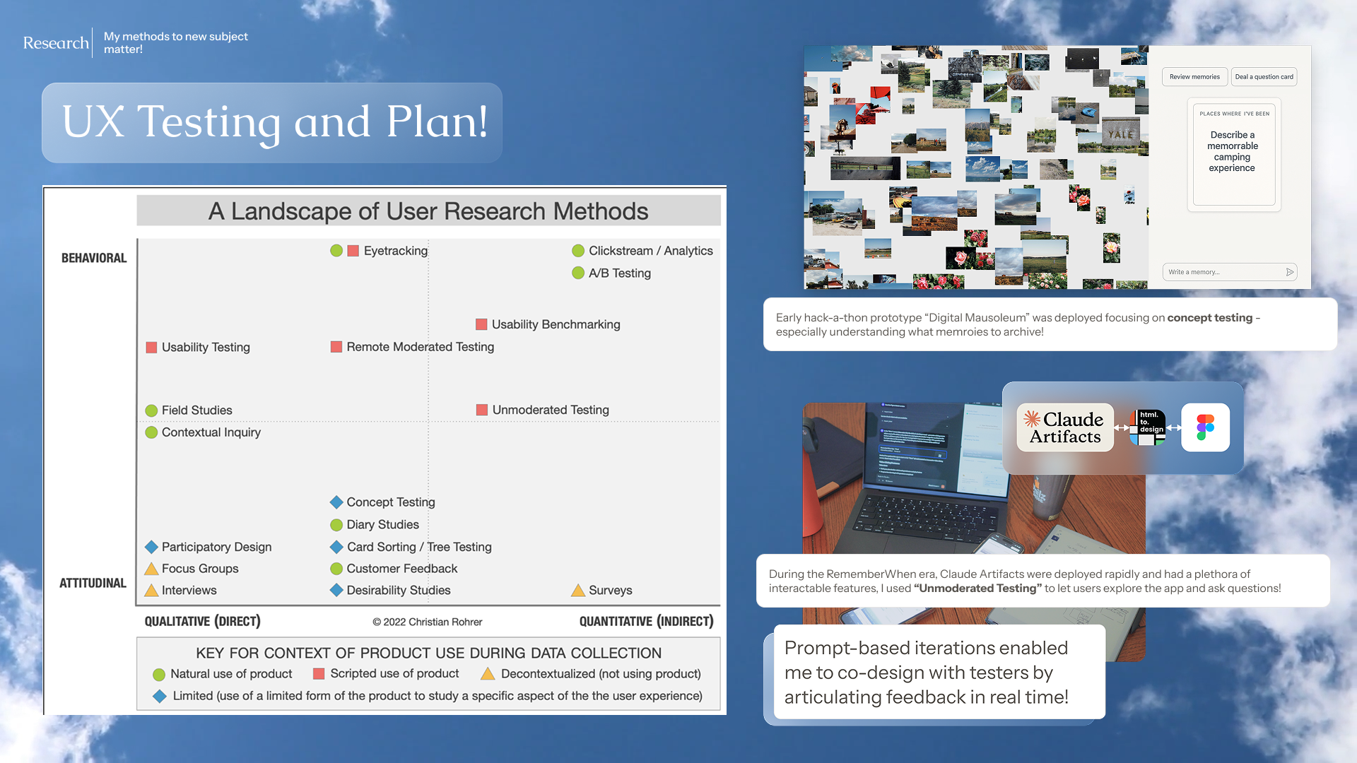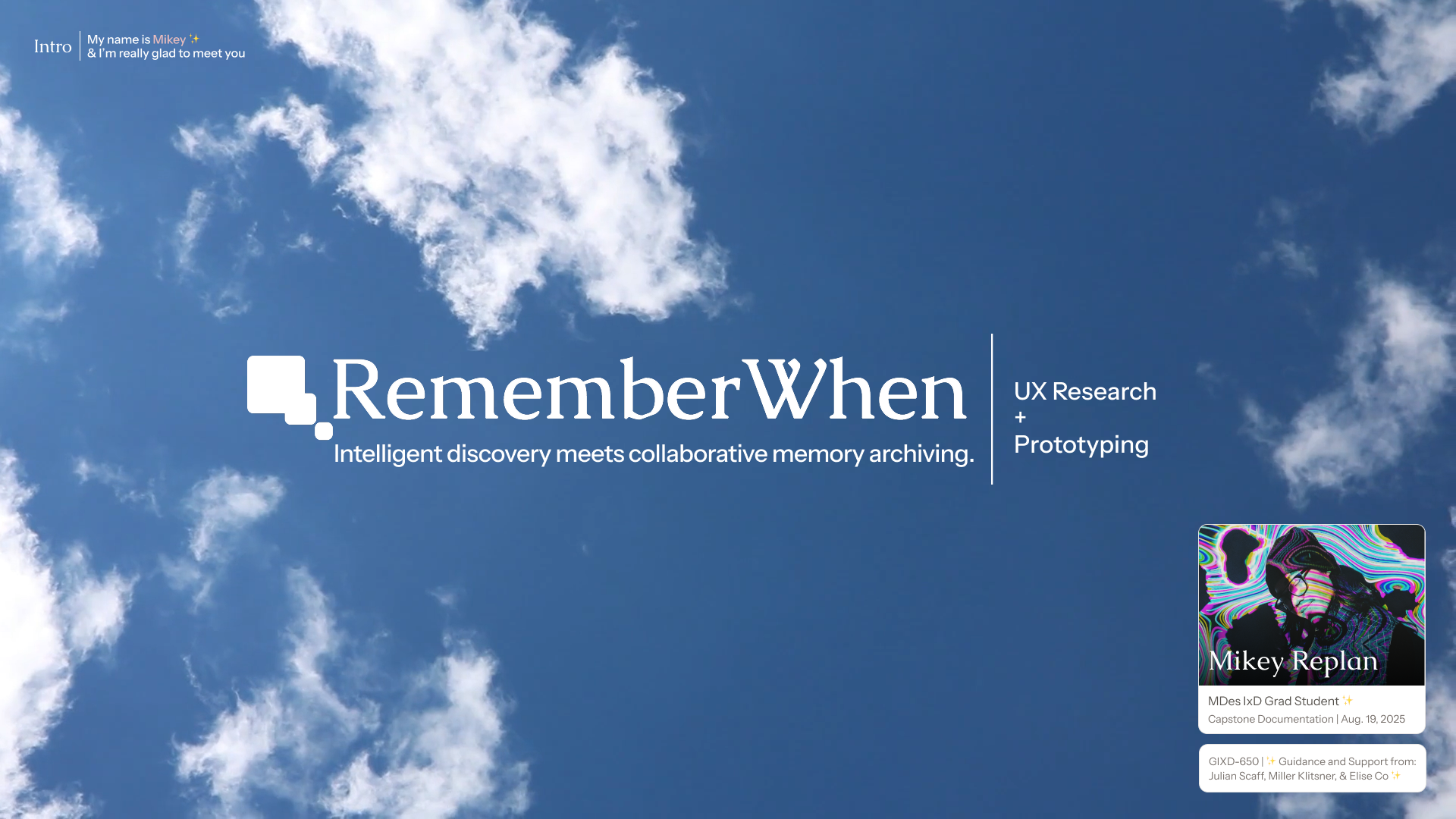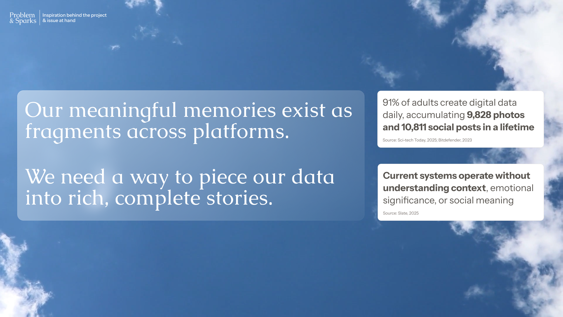 Emotion in Data Matters: coming from a cold, ultra-objective, data science background, this subject matter revealed to me how our data still holds emotions and how design can still have space to honor that. It's not just a memory storage capacity problem, but also how the data can make us feel based on how it's presented. RememberWhen's visual design went through multiple iterations to invoke a sense of calm, serenity and acceptance, even seen by the gentle sky background in the presentation deck.
