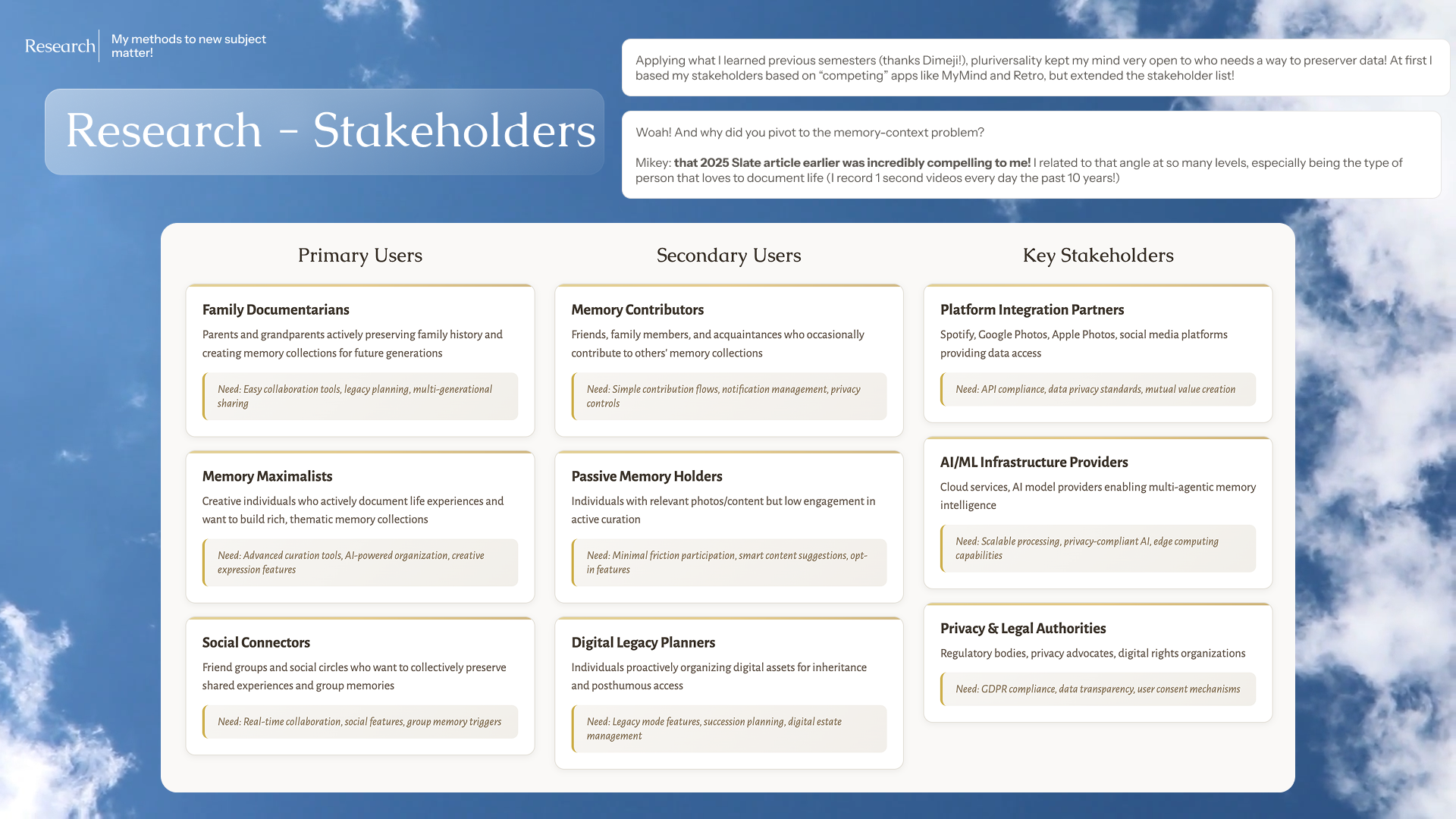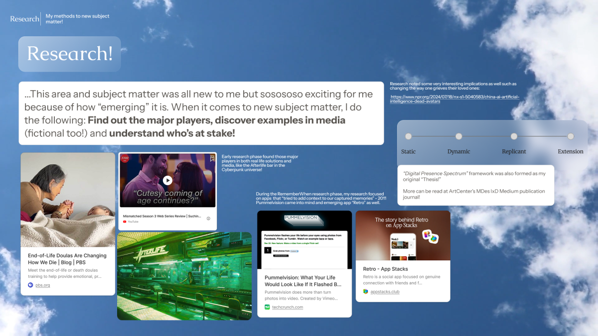 Research is Humanizing: I had the honor of interviewing people that shared their efforts and experiences in the act of remembering. Further, the emerging death-tech and memory archiving landscape exposed to me how unstructured and sensitive this domain still is. As AI accelerates in parallel, memory preservation and the way we present it requires profound care and responsibility.