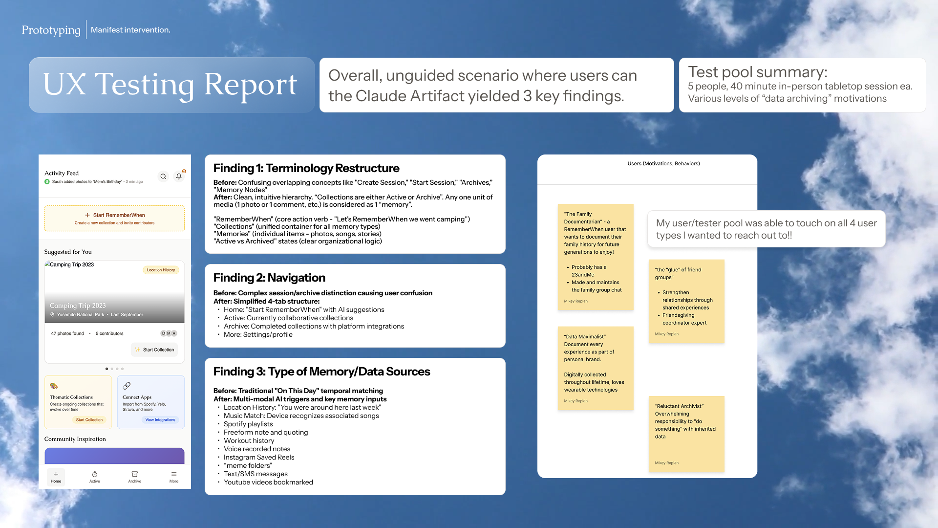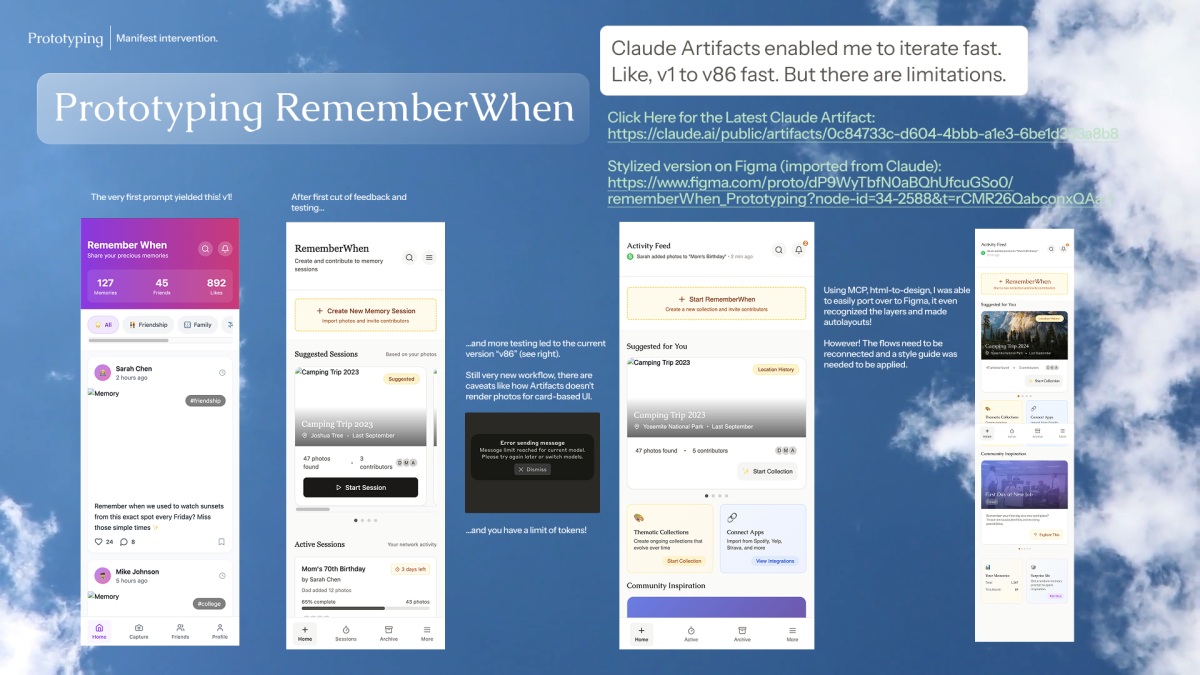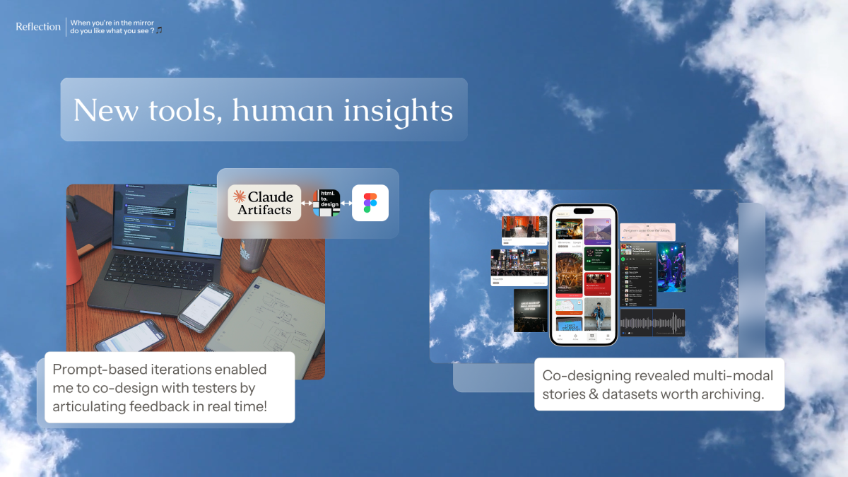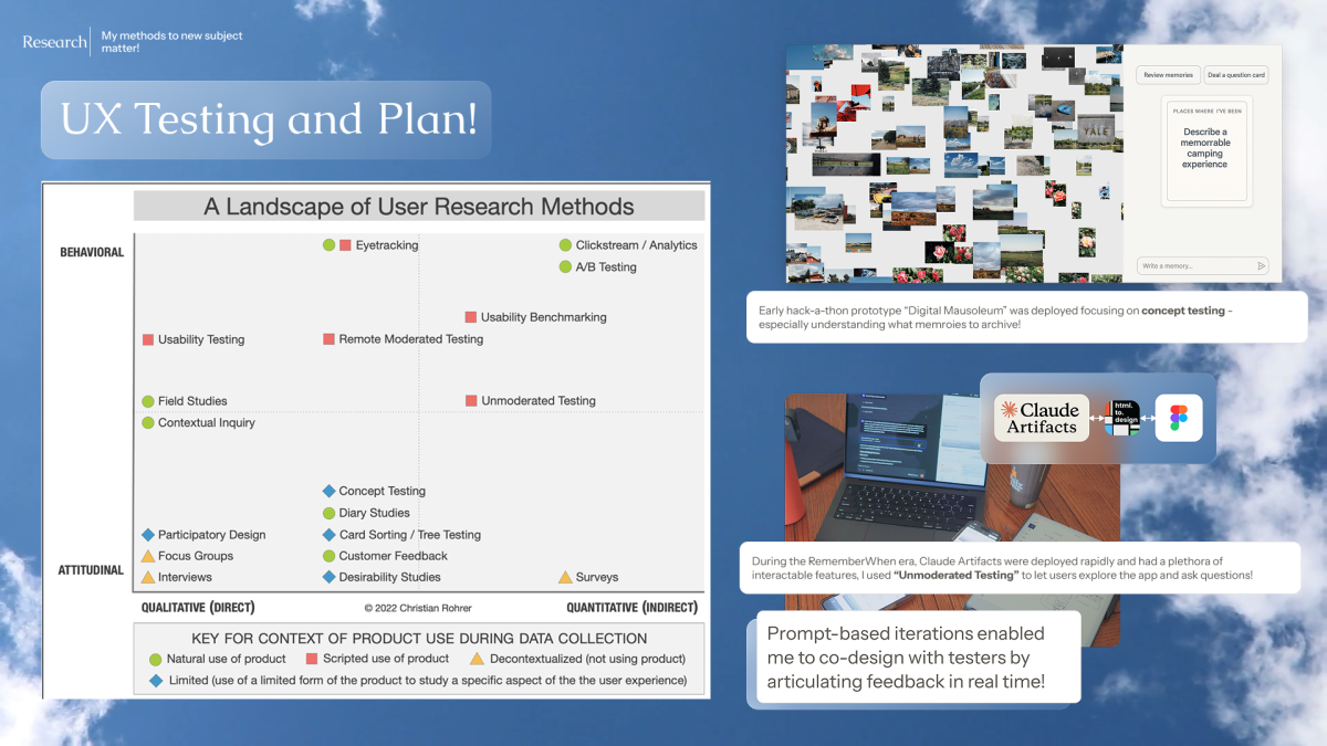 This capstone semester timeframe was during the exponential rise of vibe-coding prototypes. I took an ambitious risk and used the new-at-the-time Claude Artifacts to rapidly build functioning prototypes and deploy alongside users. The ease of iterating prototypes by vibing helped me rapidly triage and resolve user feedback.