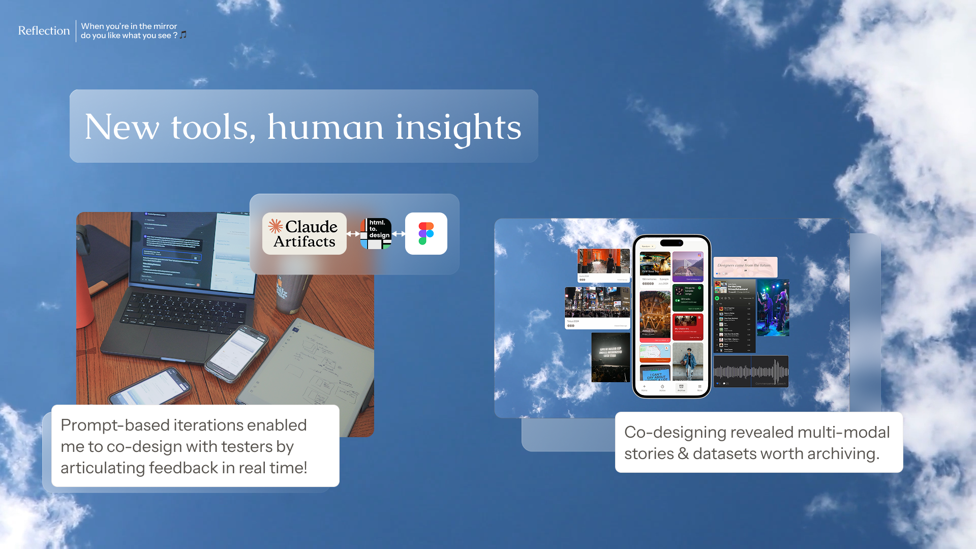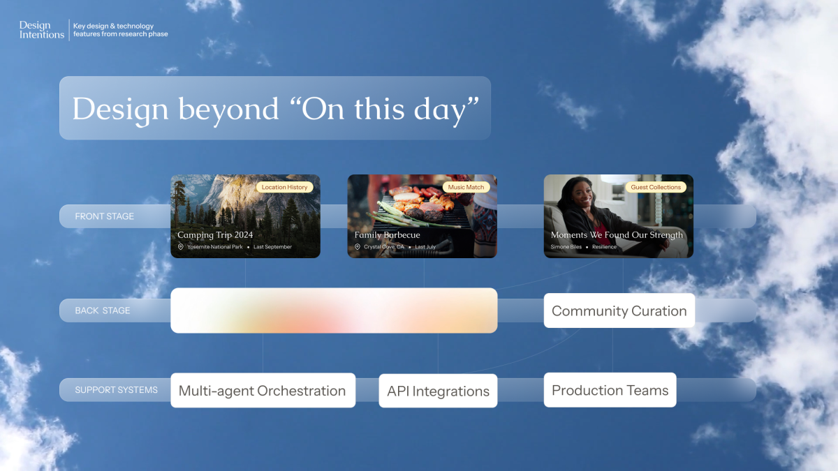 By deeply listening to each user's experience and thoughts on what types of memories they wanted to archive, I learned the many forms of digital and analog inputs they valued. It was more than just photos and videos, but also things like voice recordings, music playlists, boutique hotel check-ins, and video game achievements. Photo on the right, as seen on the video, depicted the multi-modal memories Mikayla built so far.