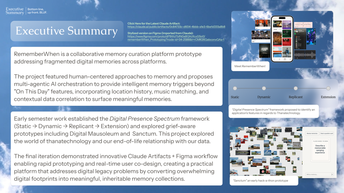 Grounded in research on digital legacy and thanatechnology, RememberWhen transforms unstructured photo libraries into curated legacies: not overwhelming data, but intentionally authored, co-created, multi-modal memory archives.