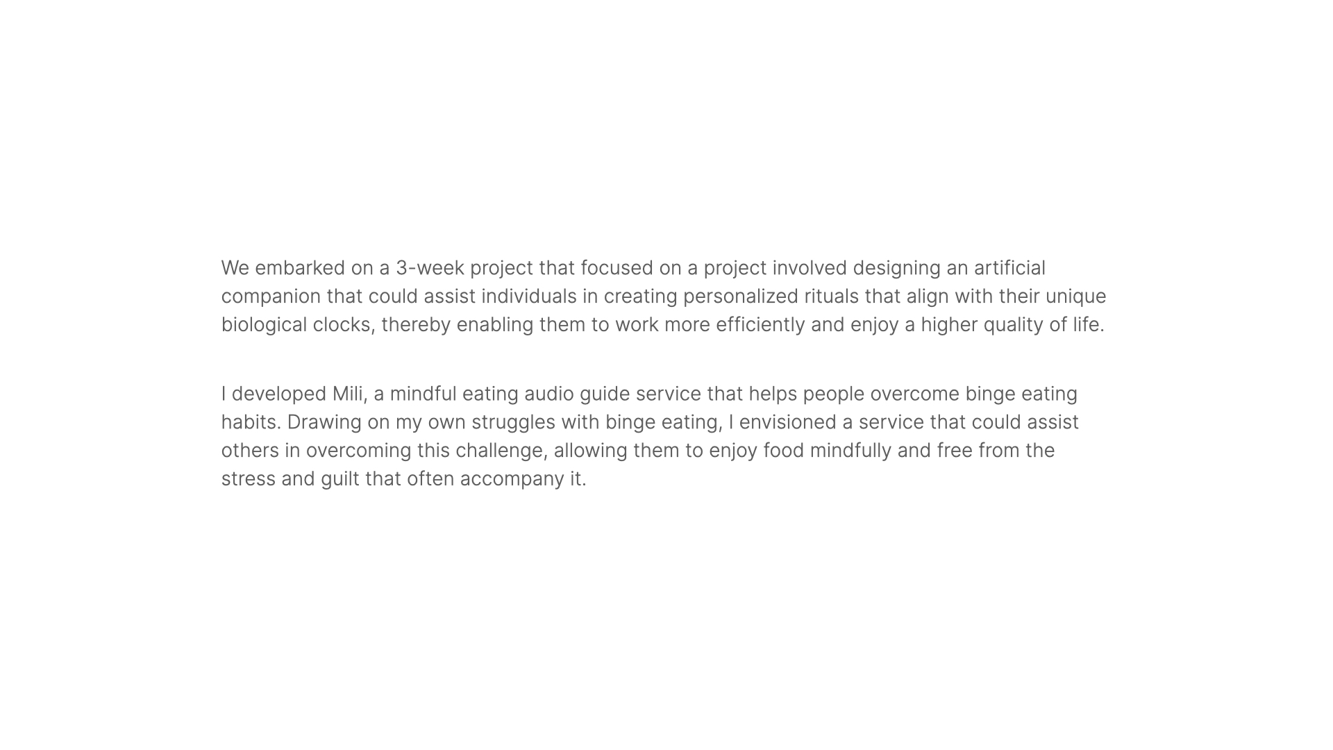 I developed Mili, a mindful eating audio guide service that helps people overcome binge eating habits. Drawing on my own struggles with binge eating, I envisioned a service that could assist others in overcoming this challenge, allowing them to enjoy food mindfully and free from the stress and guilt that often accompany it.
