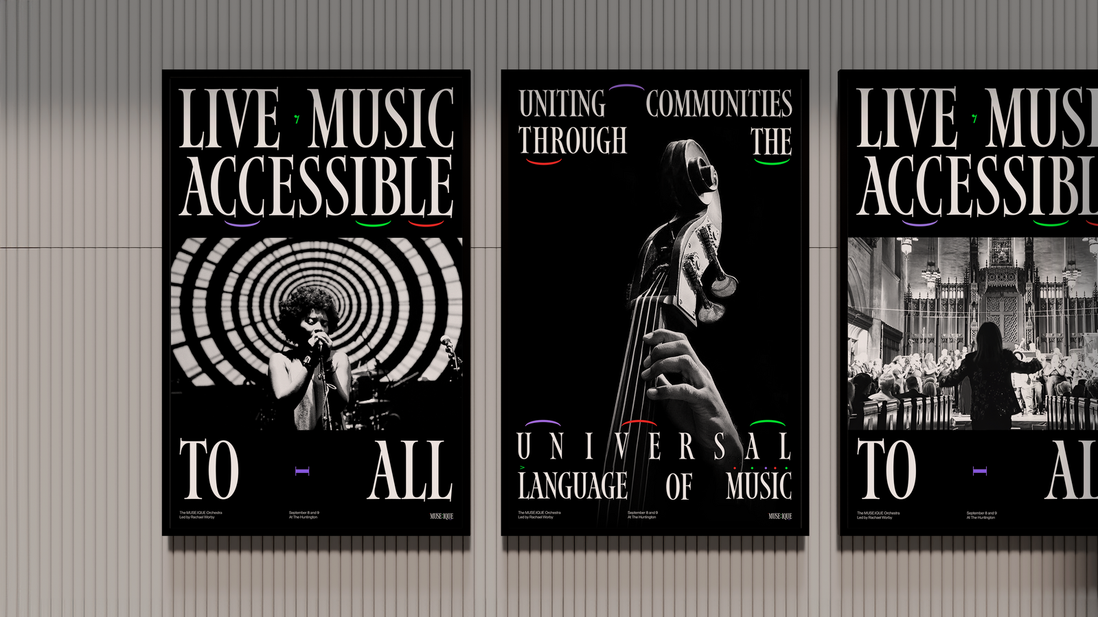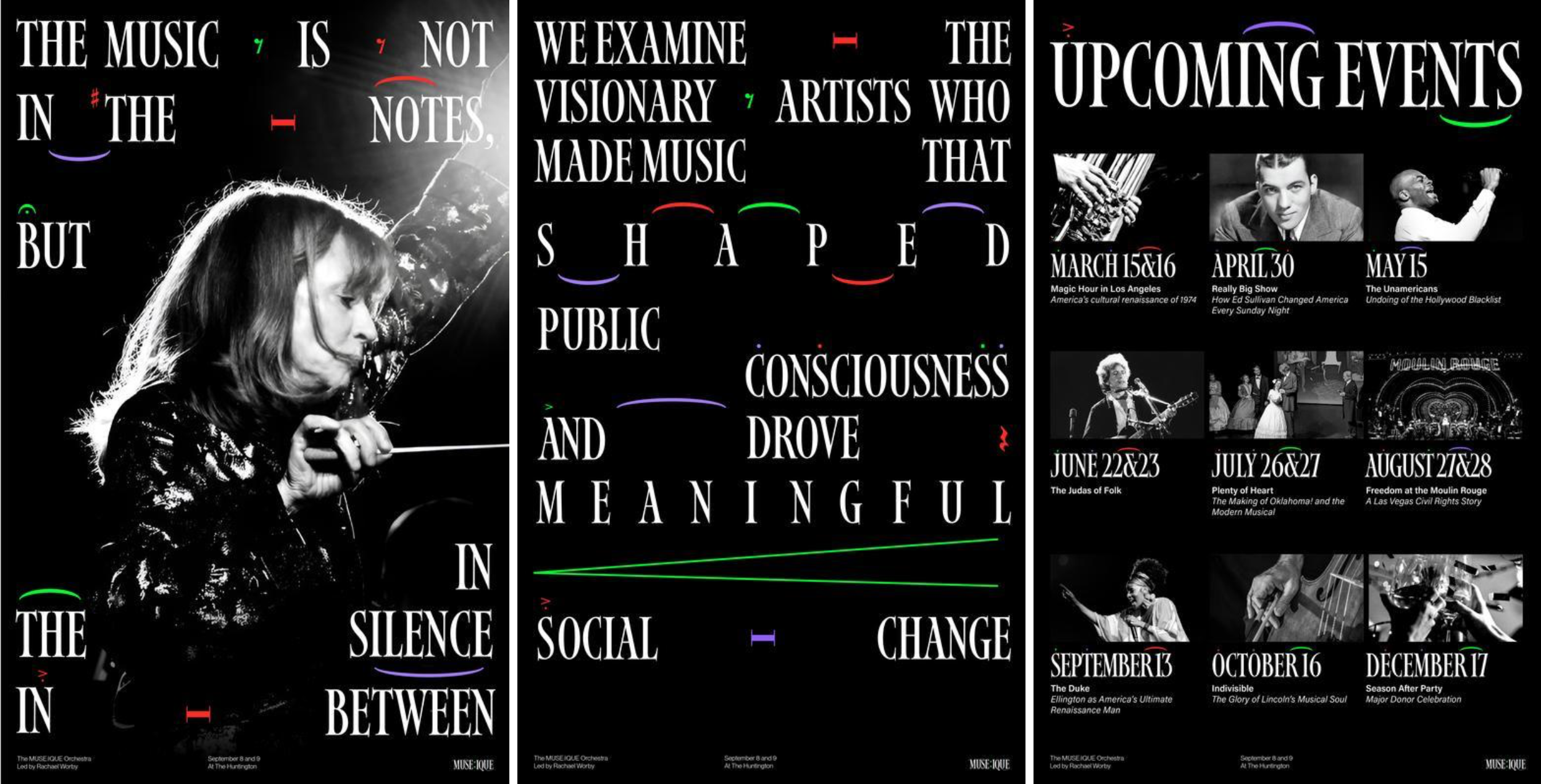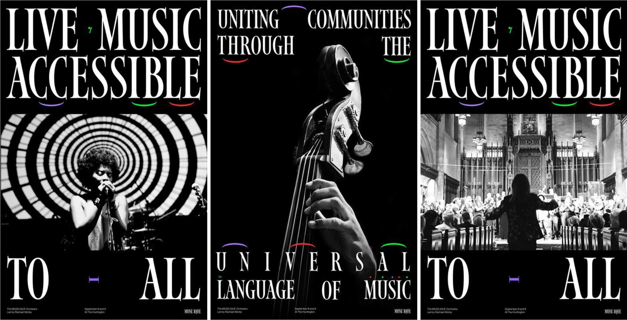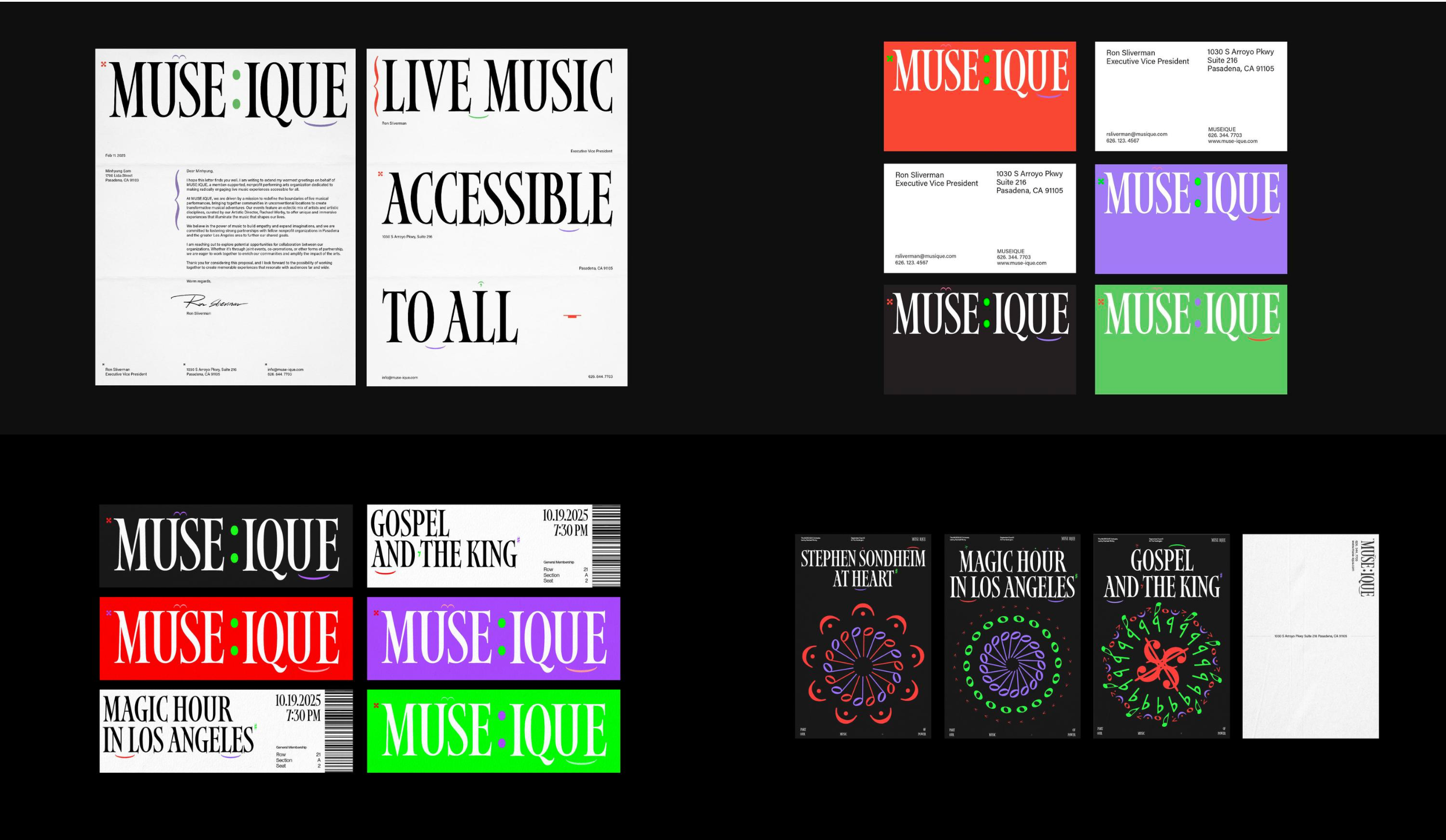 MUSE:IQUE is a nonprofit that creates accessible, community-driven live music experiences in unconventional spaces. Led by Artistic Director Rachael Worby, it blends performances with storytelling to inspire connection and imagination across Pasadena and Los Angeles. I developed a cohesive visual identity that reflected MUSE:IQUE’s mission of making music engaging and inclusive while breaking traditional boundaries in performance.