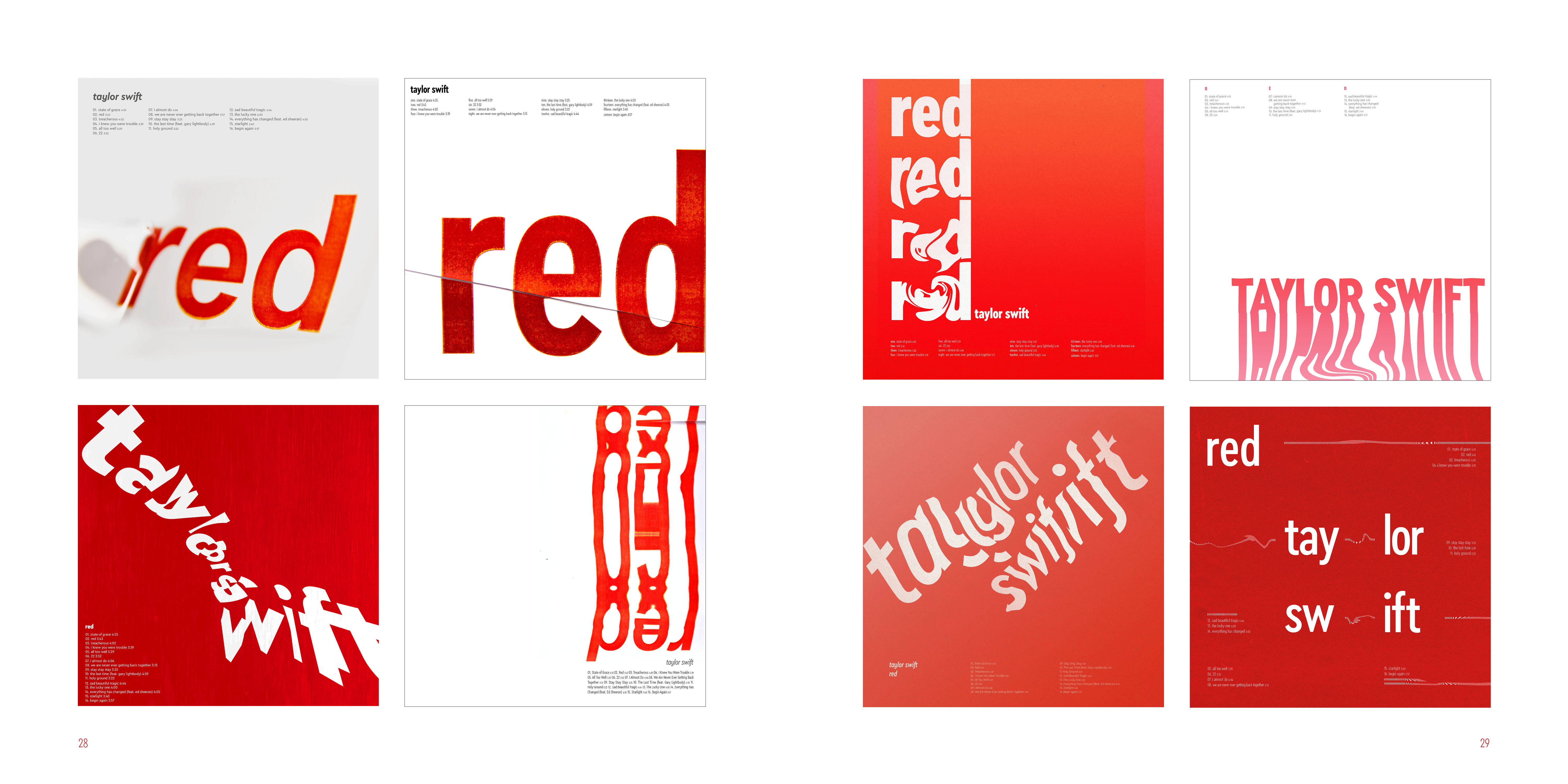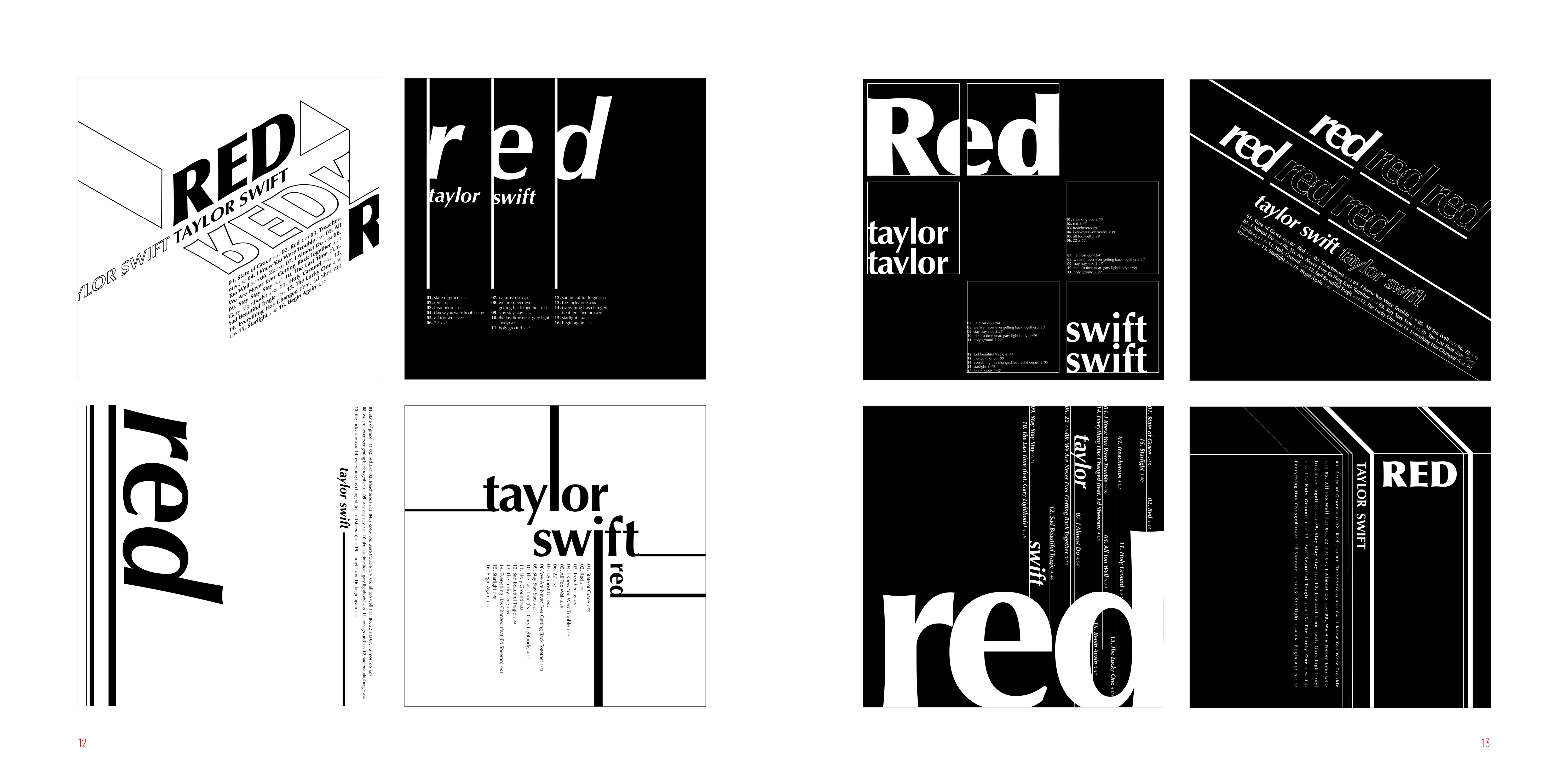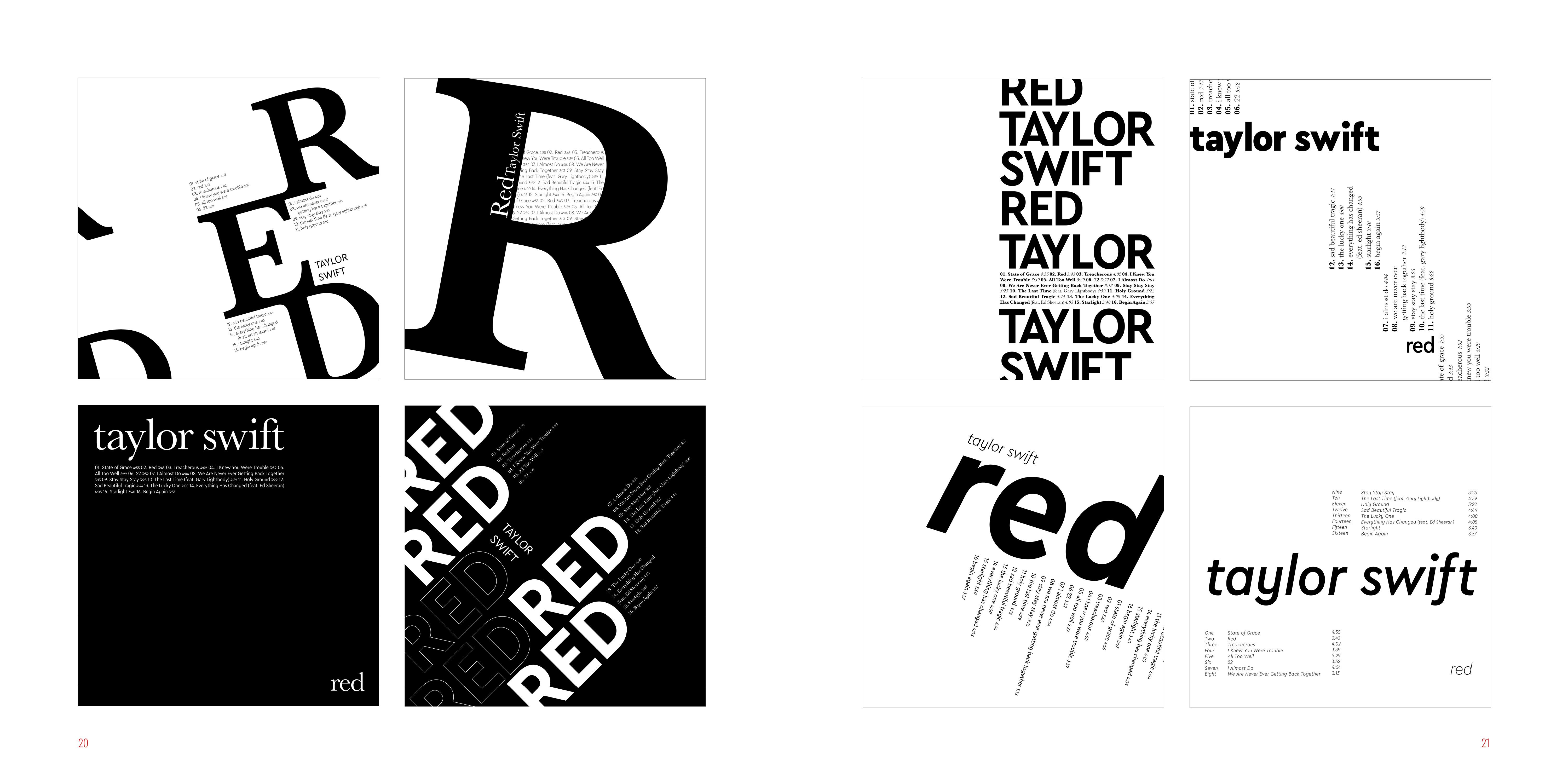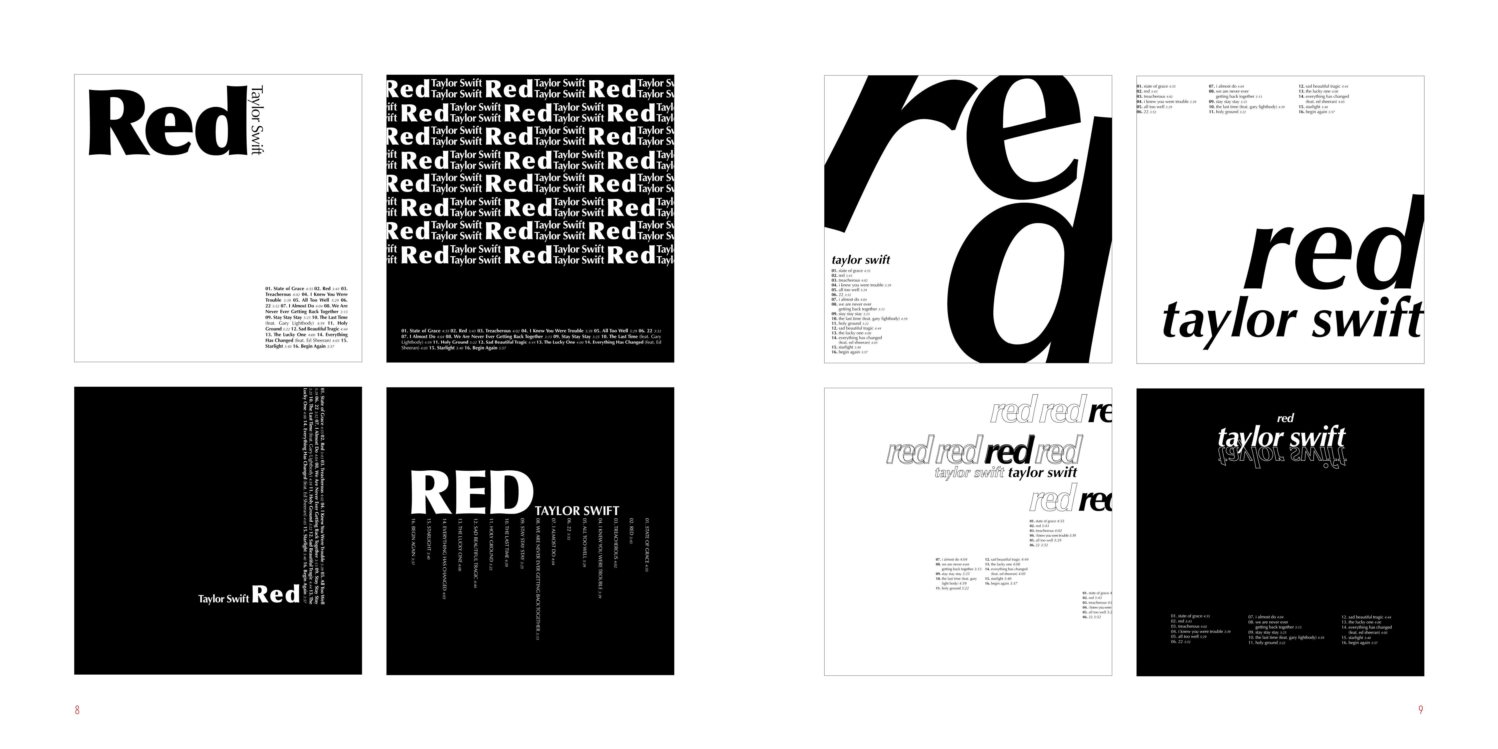 I made series of typographic exercise which was making a album cover of Red by Taylor Swift. To develop type fundamentals, I used different forms of expression by using analog and digital.
