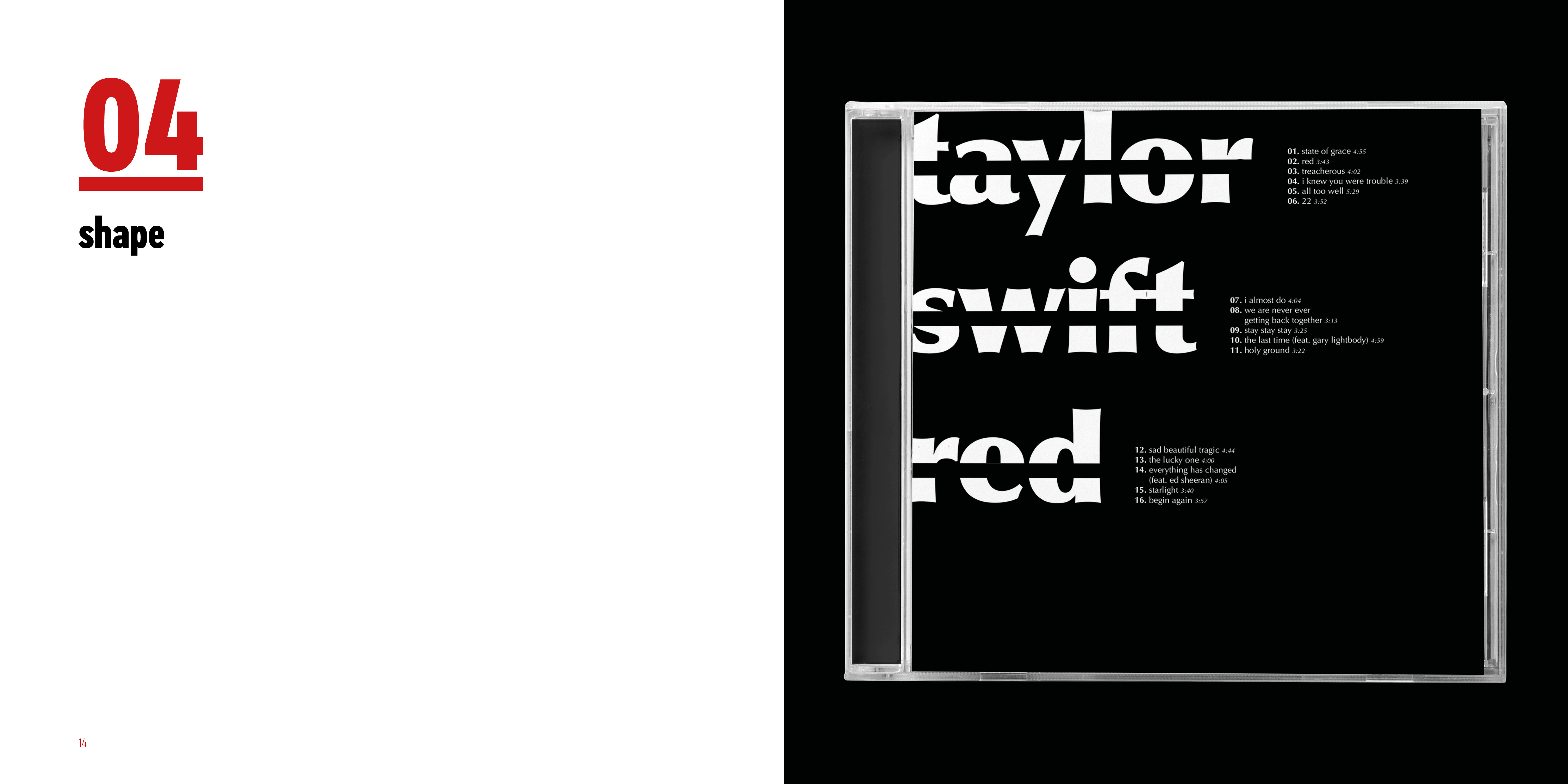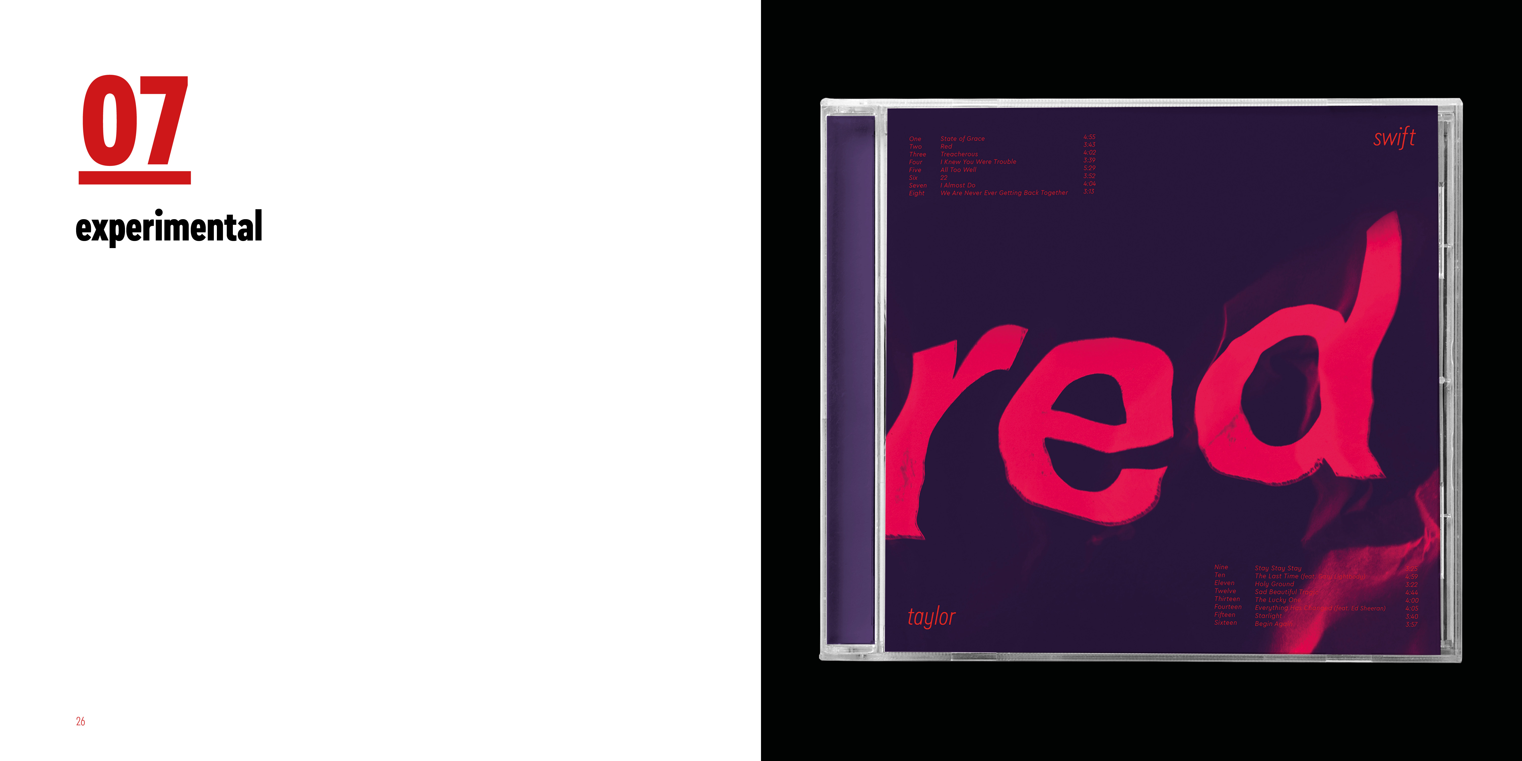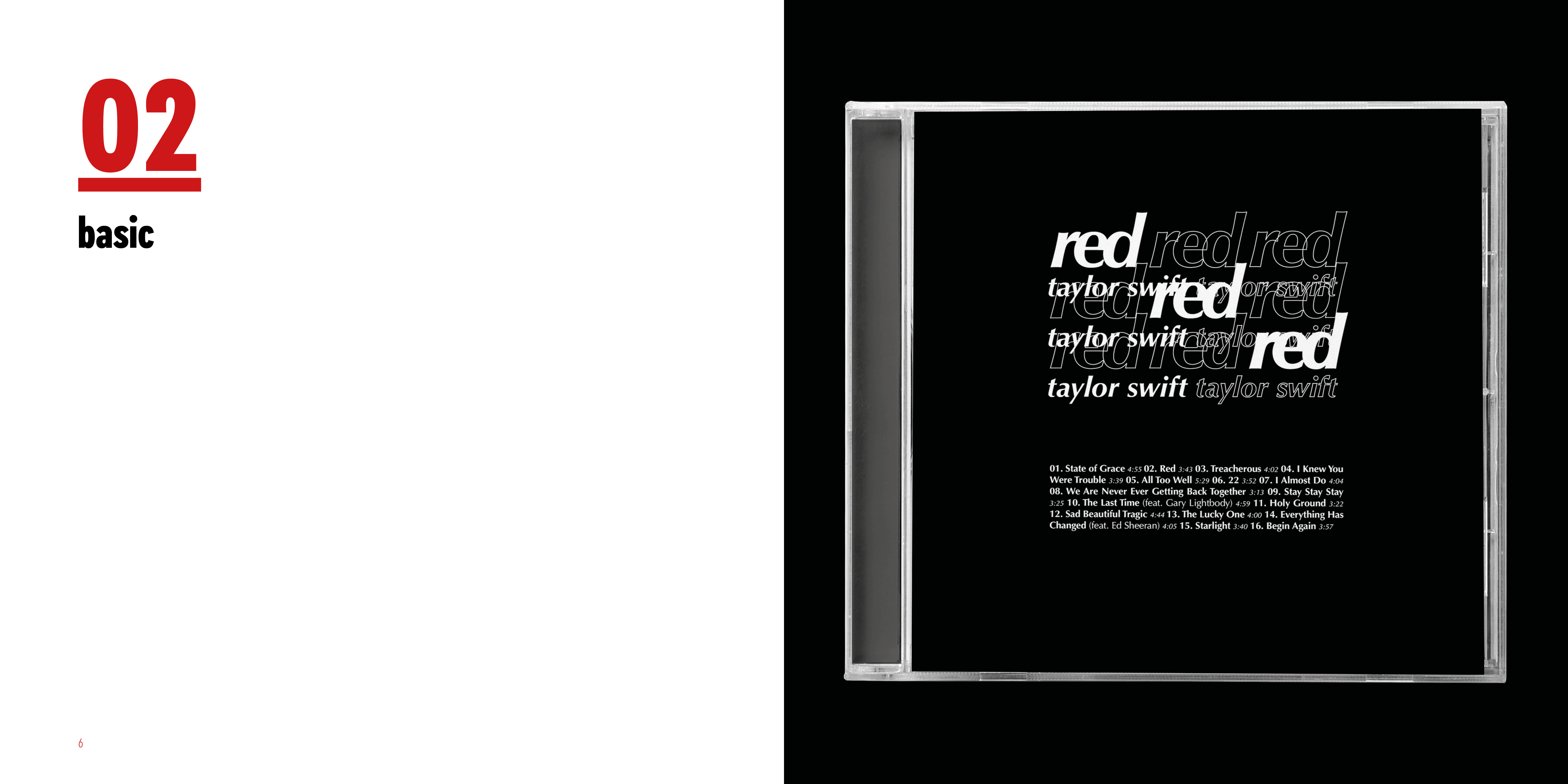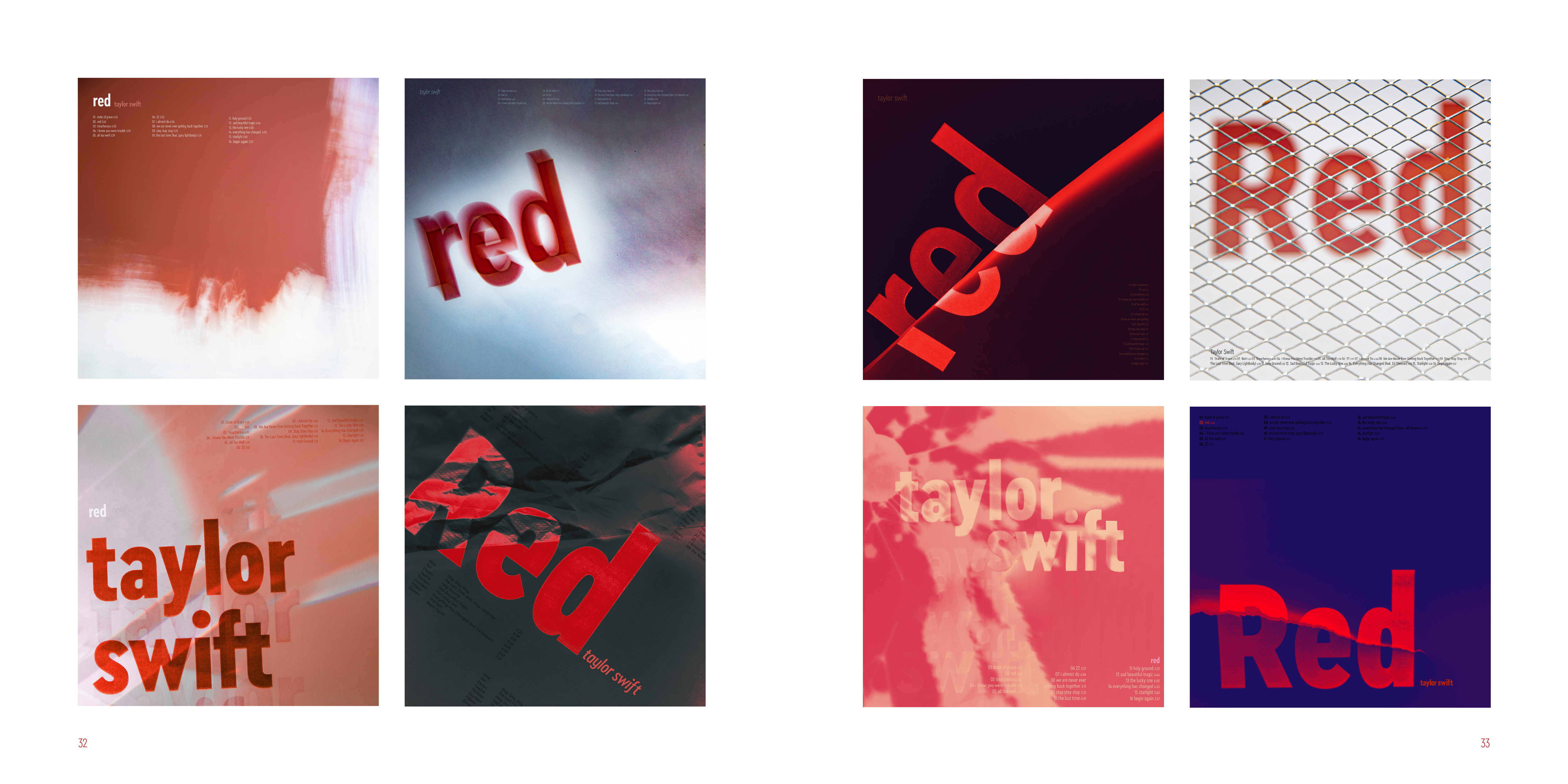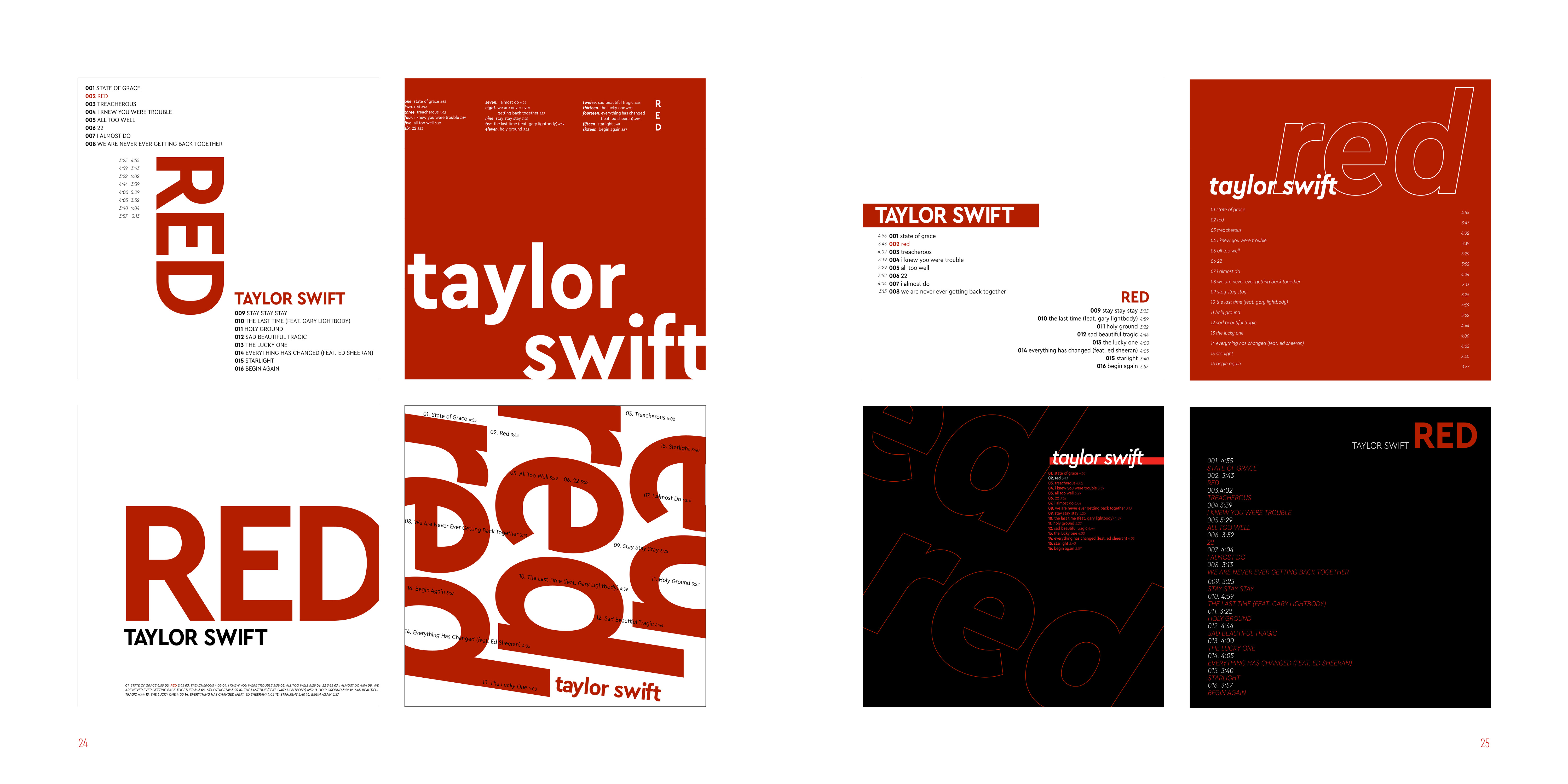I made series of typographic exercise which was making a album cover of Red by Taylor Swift. To develop type fundamentals, I used different forms of expression by using analog and digital.
