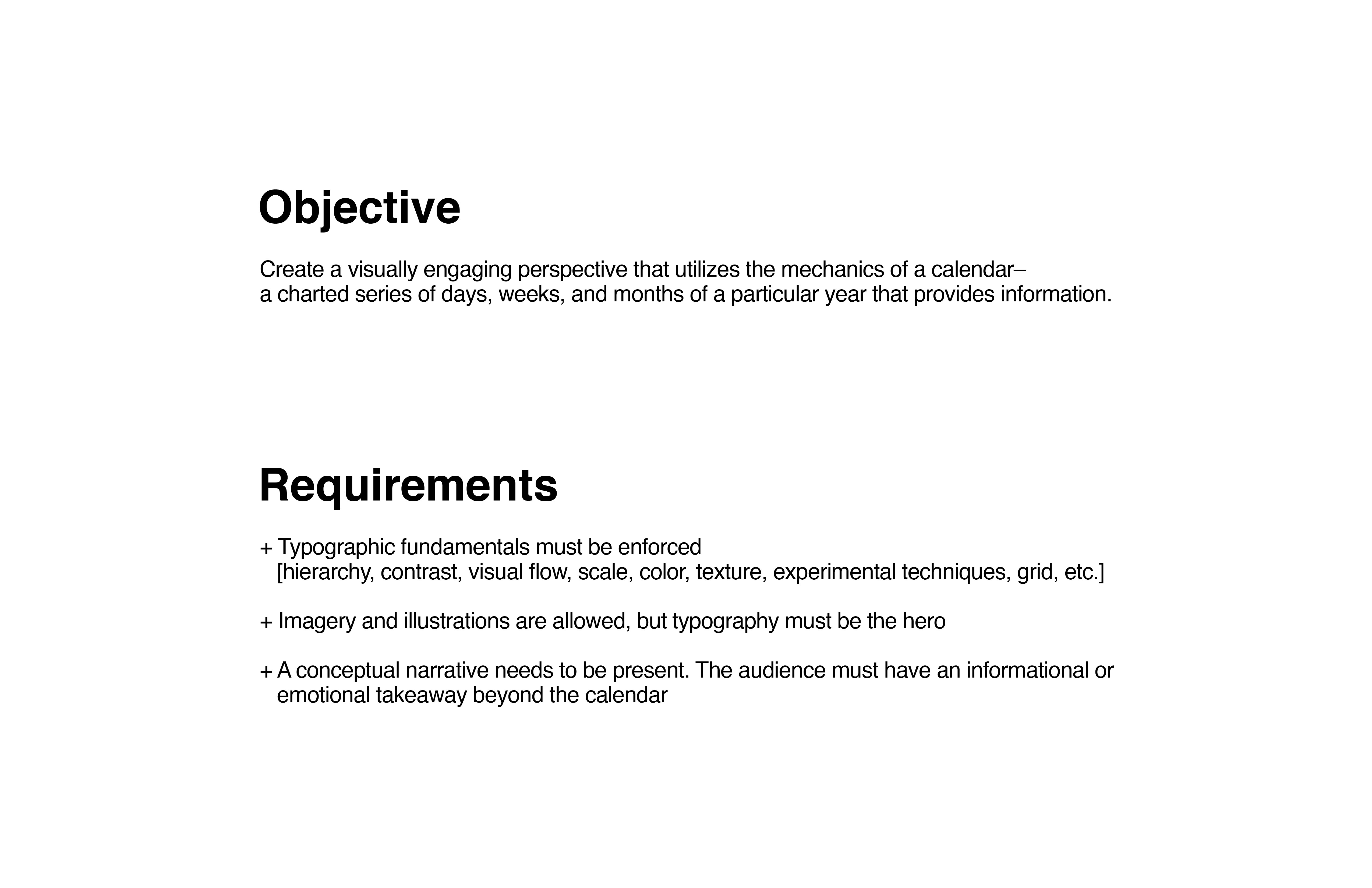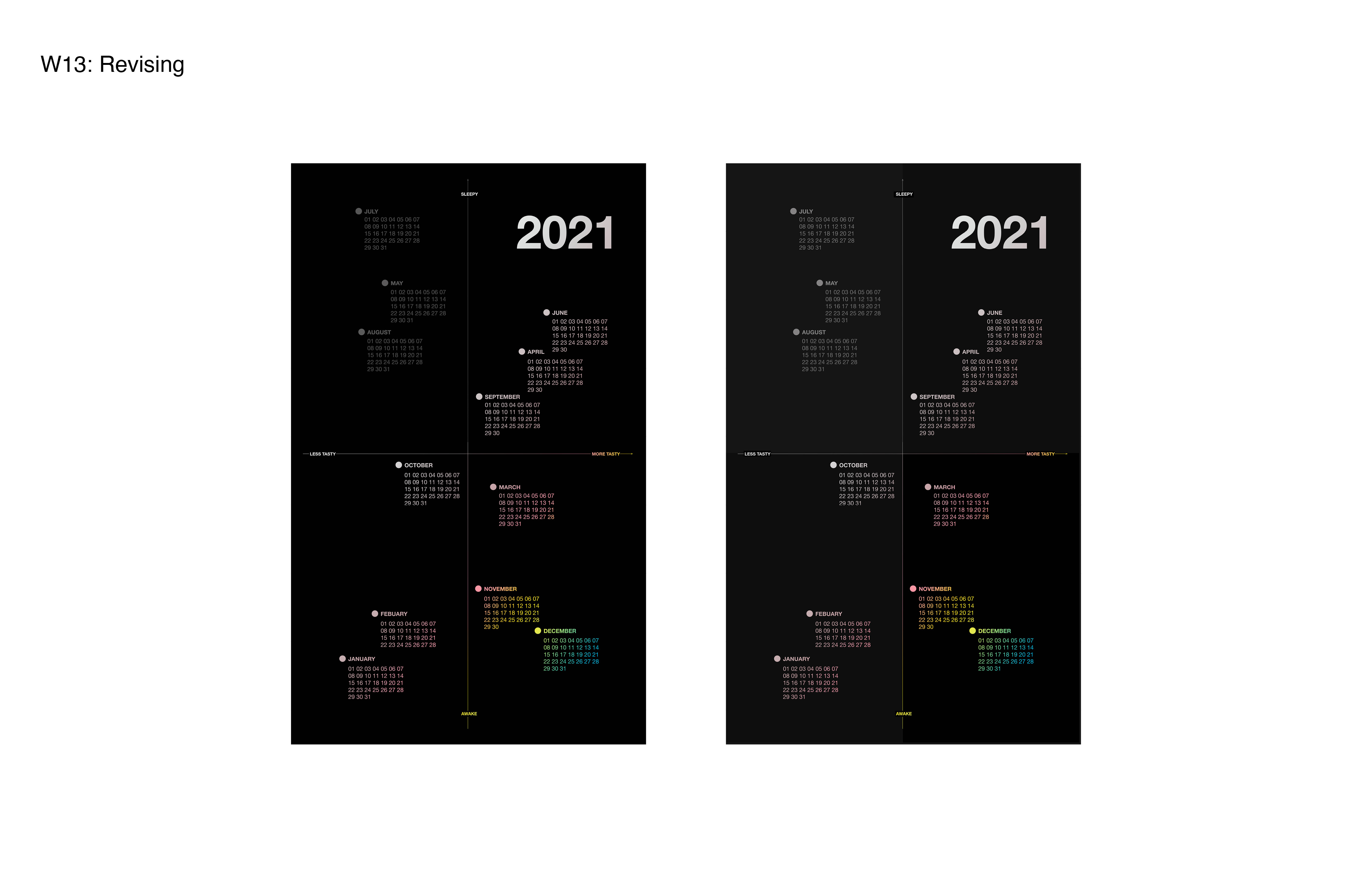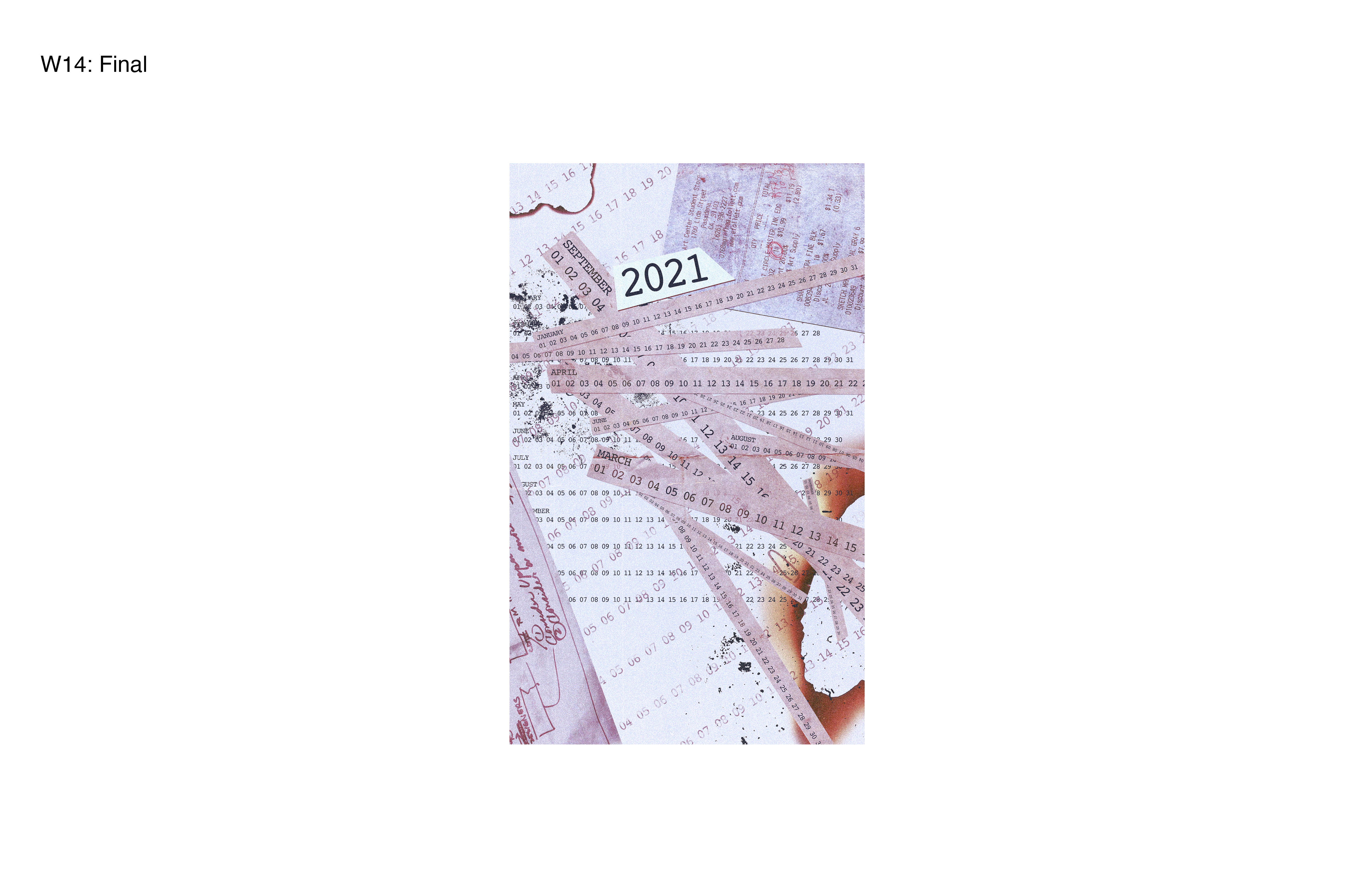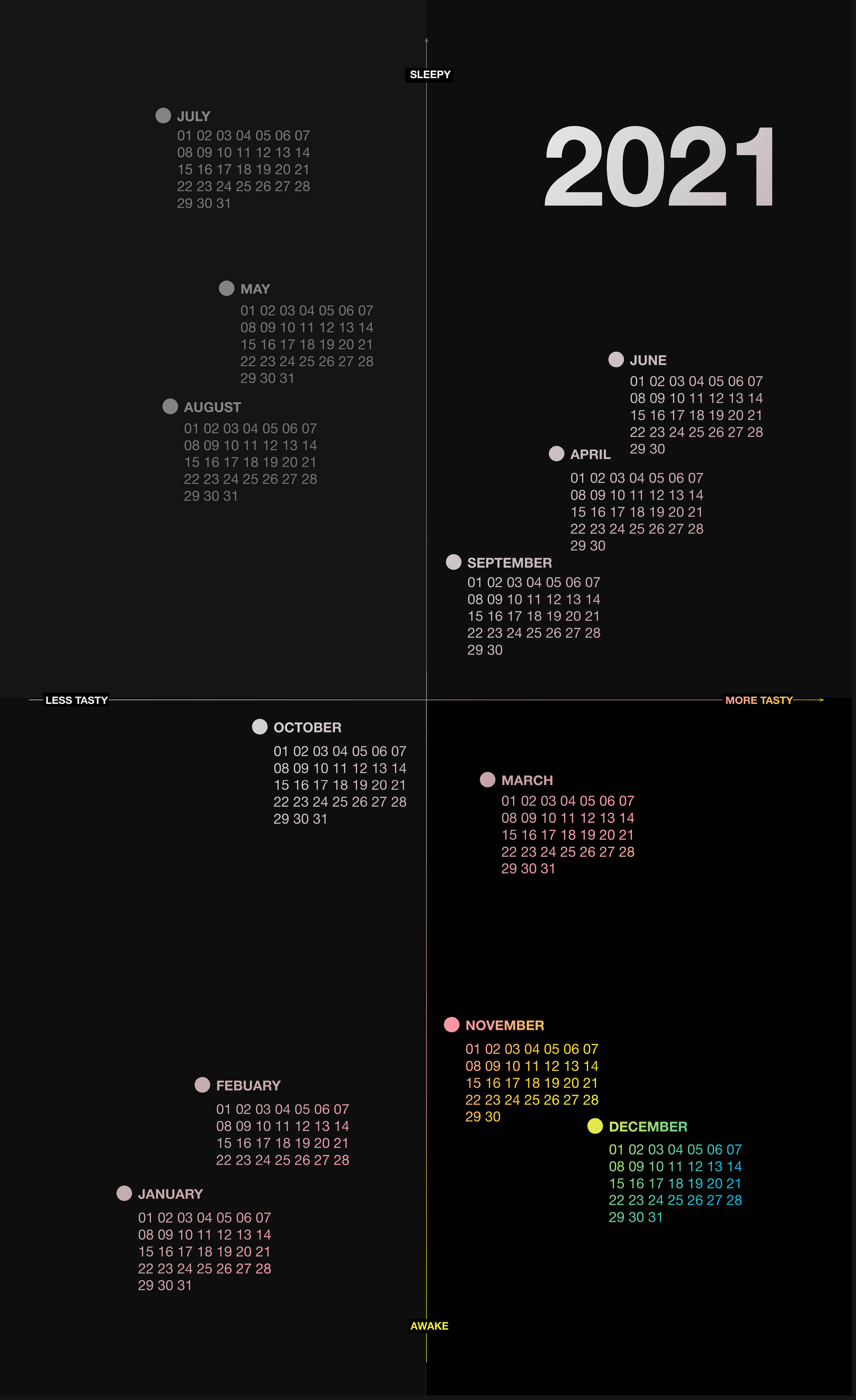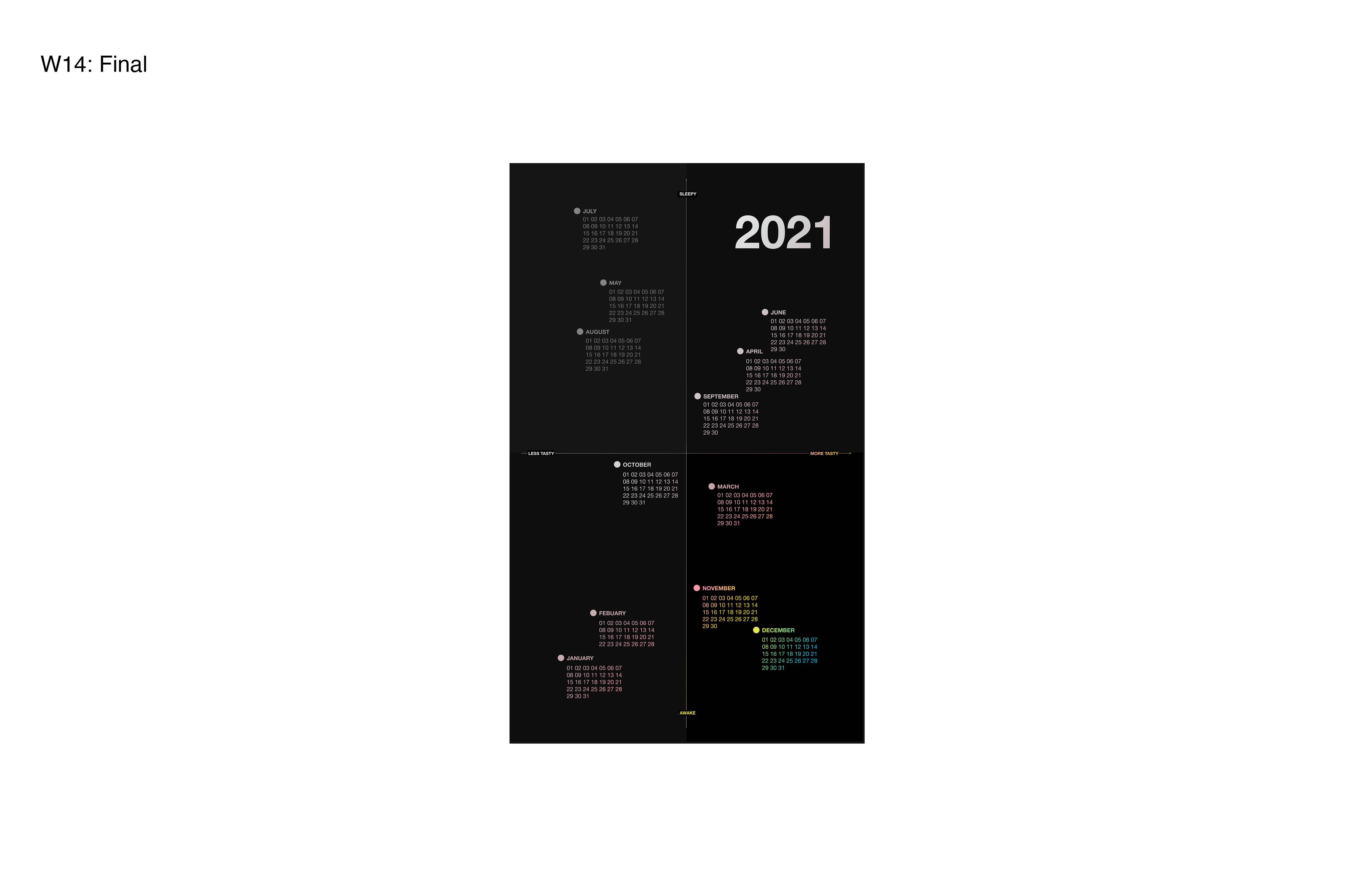 I created a visually engaging perspective that utilizes the mechanics of a calendar– a charted series of days, weeks, and months of a particular year that provides information.