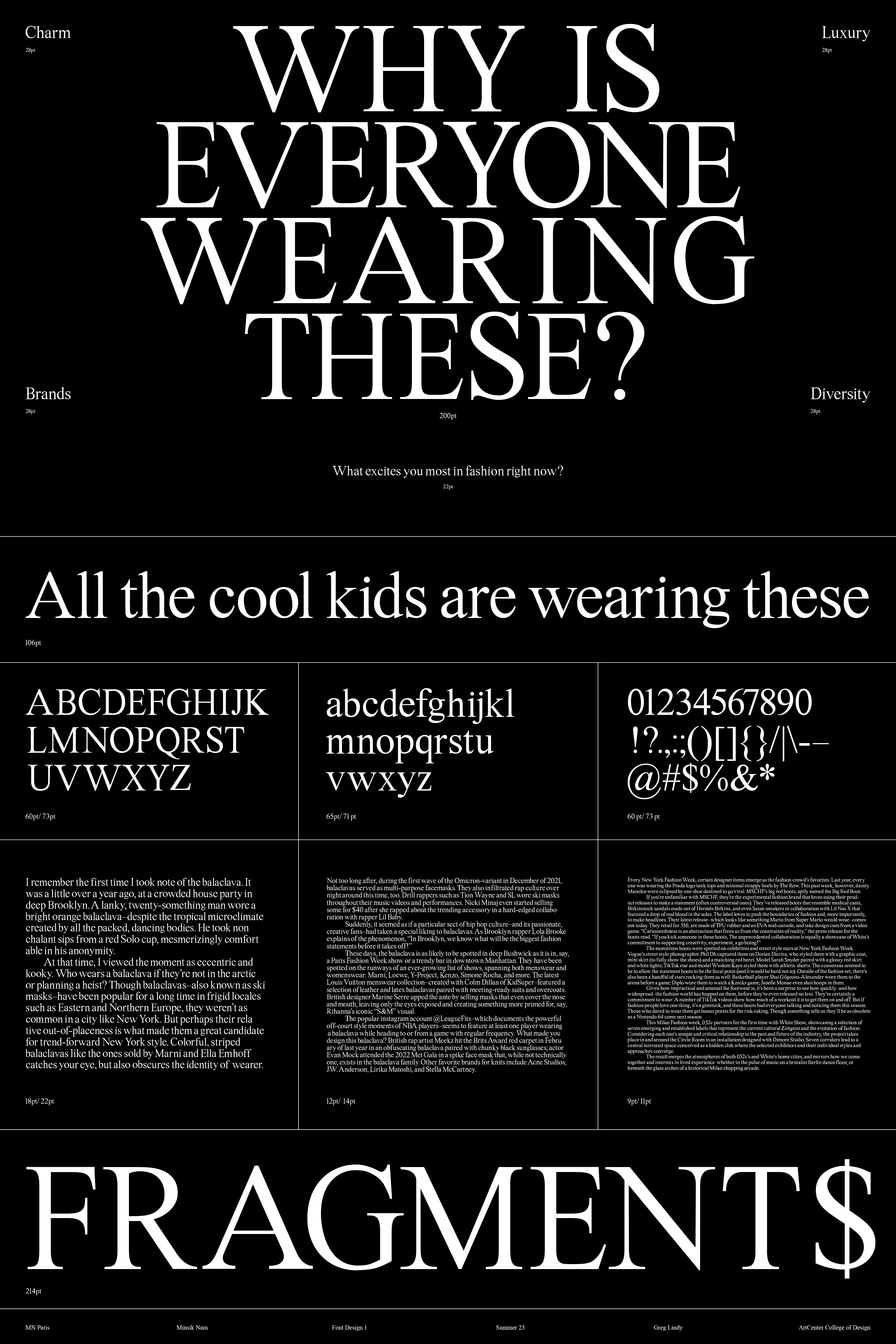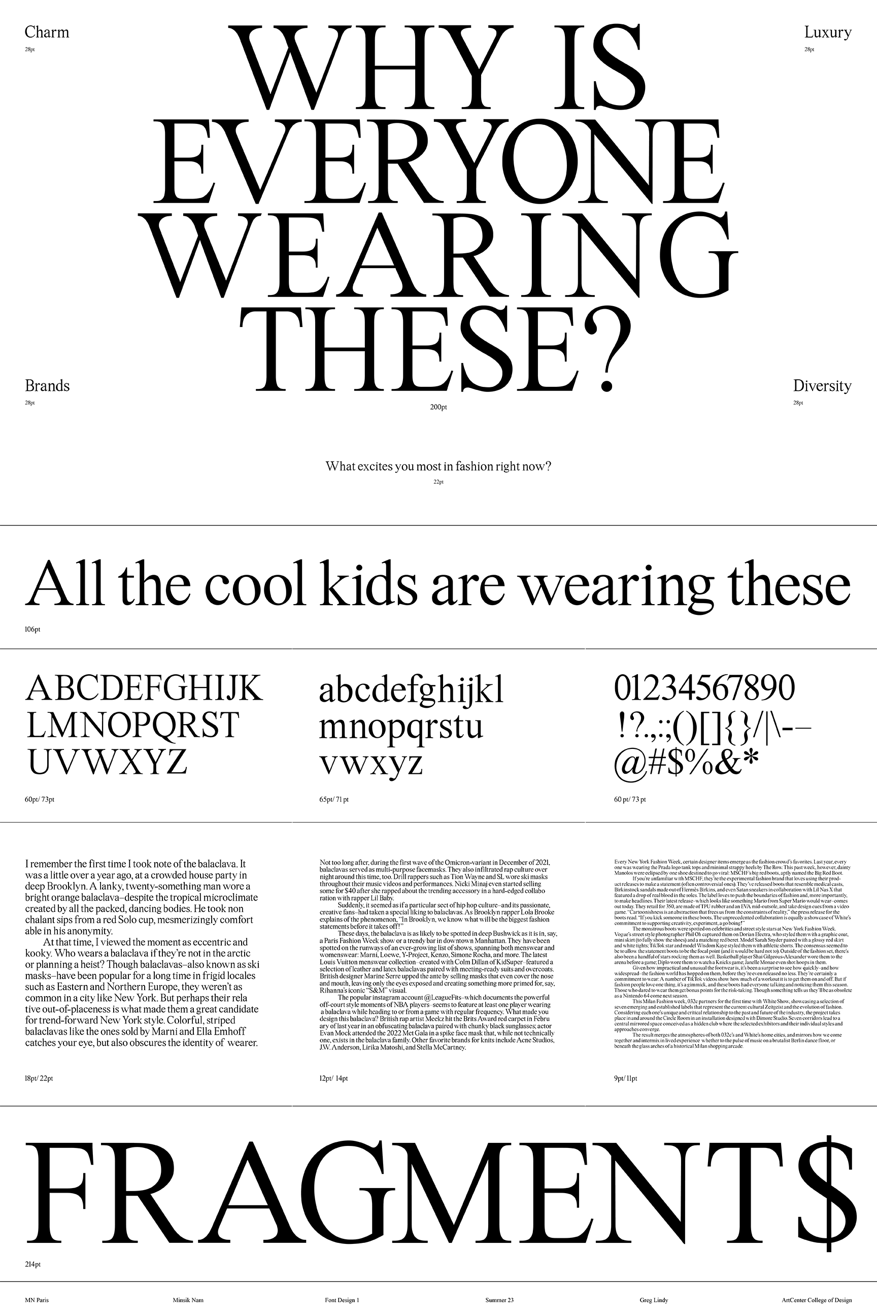 MN Paris is a serif typeface that blends classic elegance with modern proportions. Featuring an increased x-height for improved readability, it maintains a refined balance between tradition and contemporary design. Optimized for editorial and branding, it is well-suited for fashion publications and luxury branding, offering both sophistication and functionality.