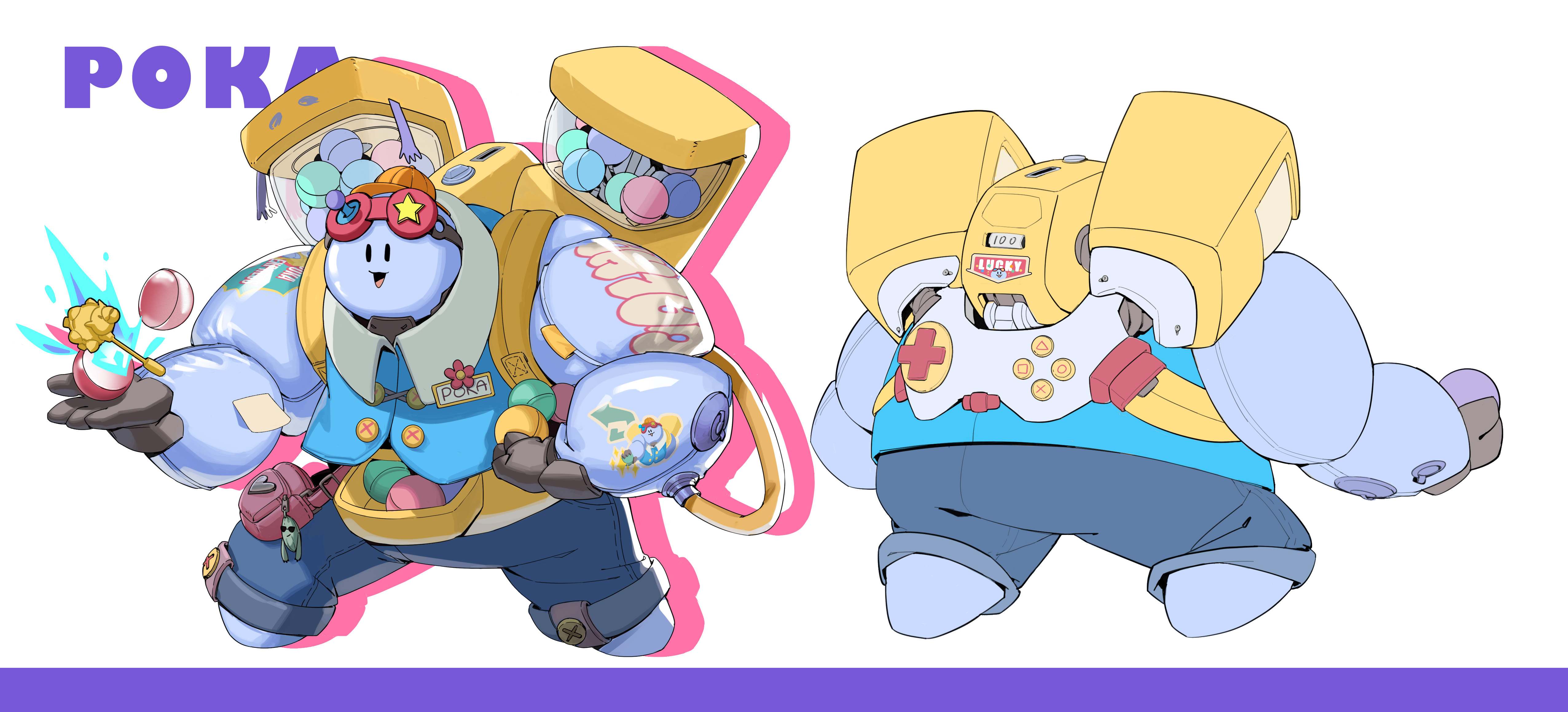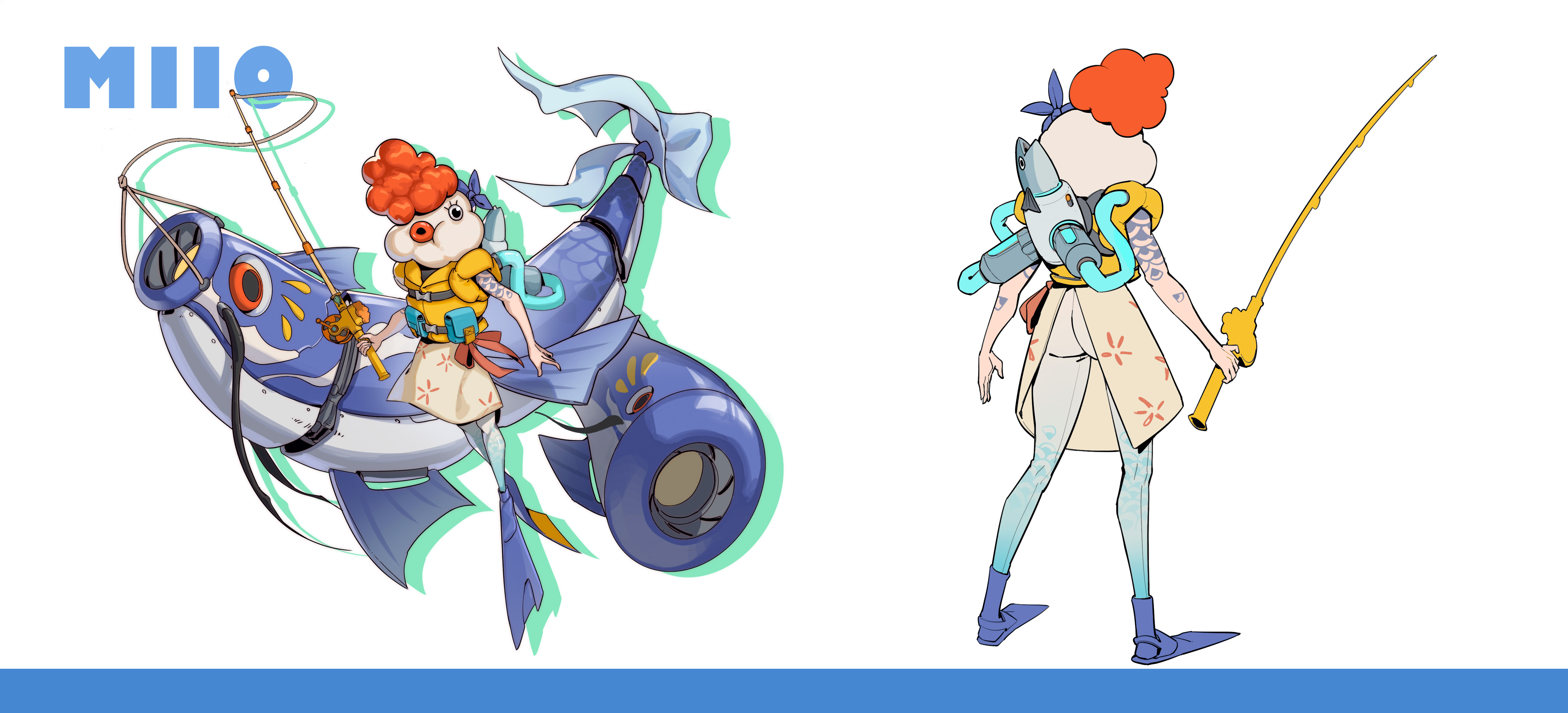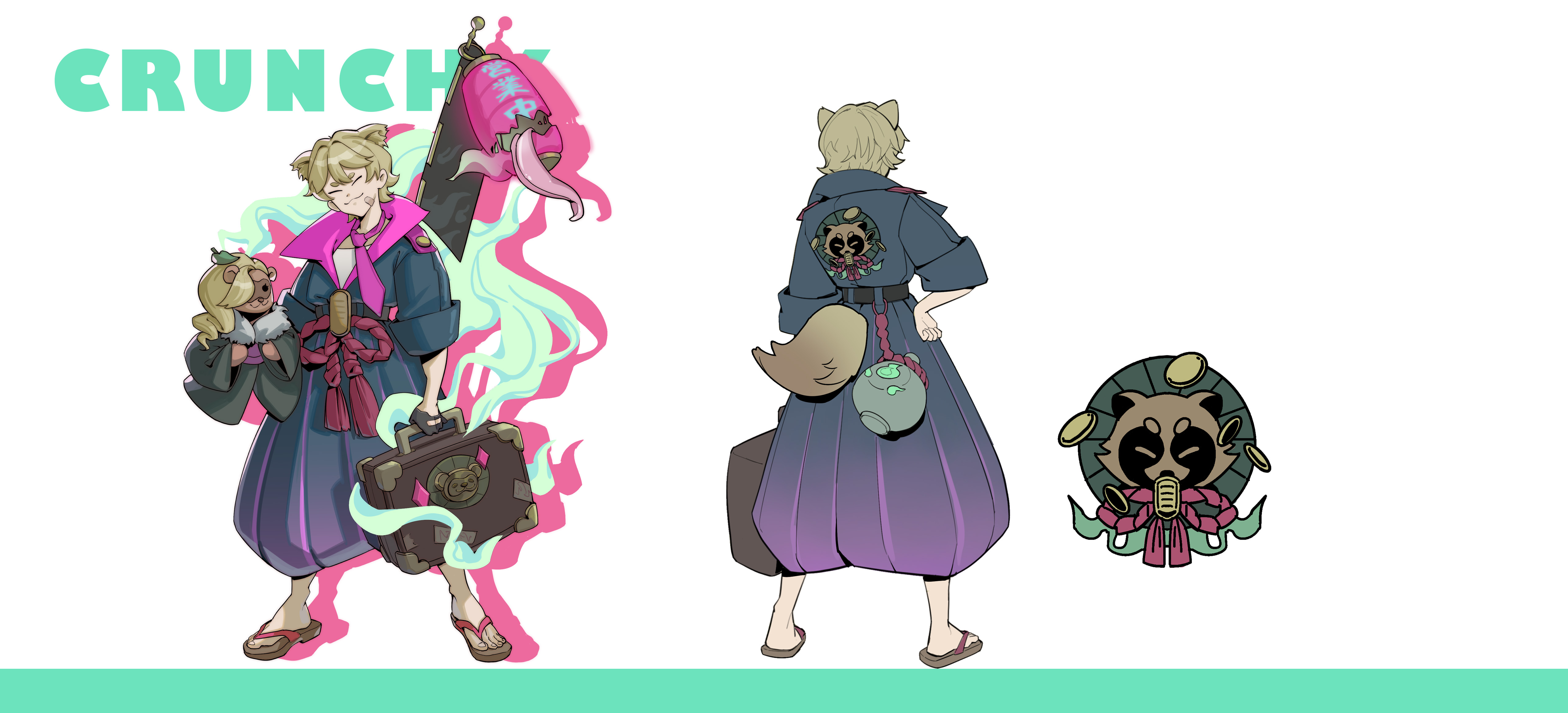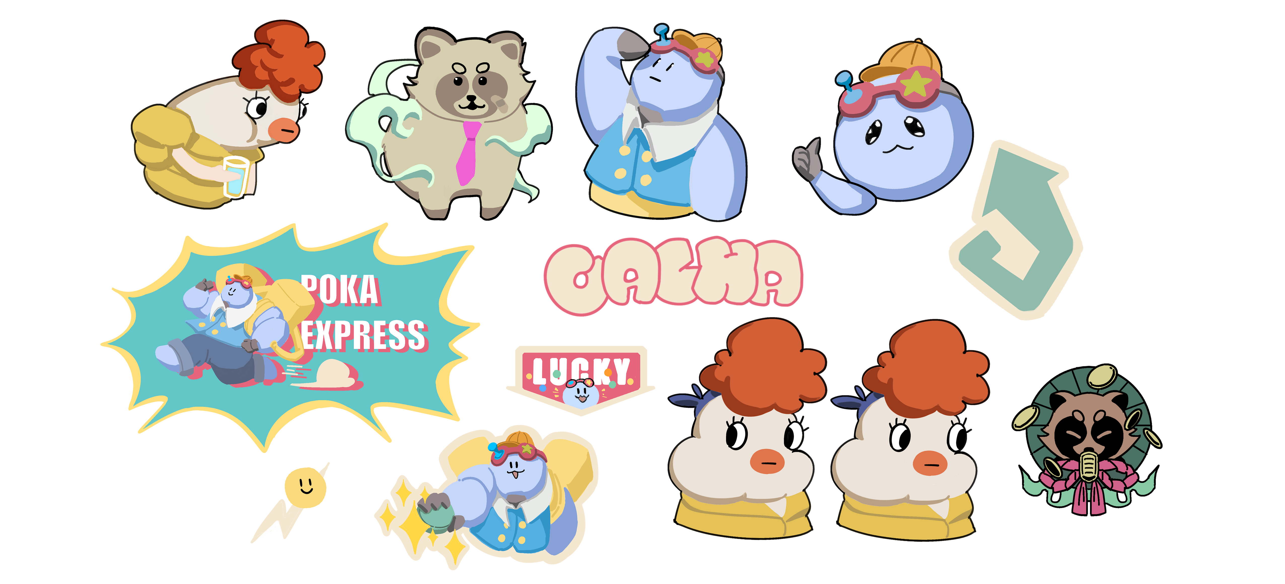 Poka, Aka, Miio, and Crunchy live in a fictional world inspired by 2000s Japanese neighborhoods, blending colorful, stylized, Y2K, and street aesthetics. Poka, a cute robot with an emoji-like head and inflatable body, dispenses items for teammates via a gashapon machine. Miio, an eccentric sushi chef with a goldfish helmet, loves fish and water, riding a giant mechanical koi. Crunchy, a sly tanuki-turned-merchant, carries a traditional Japanese doll puppet.