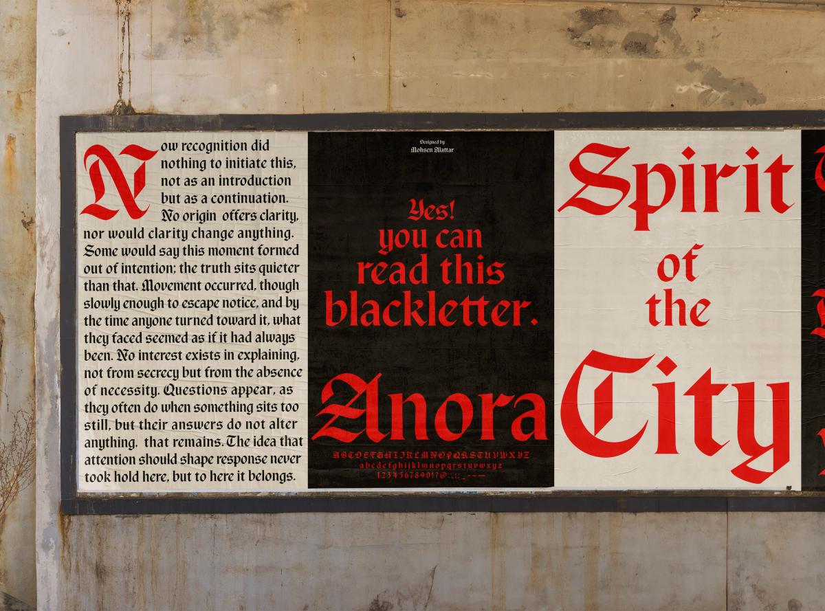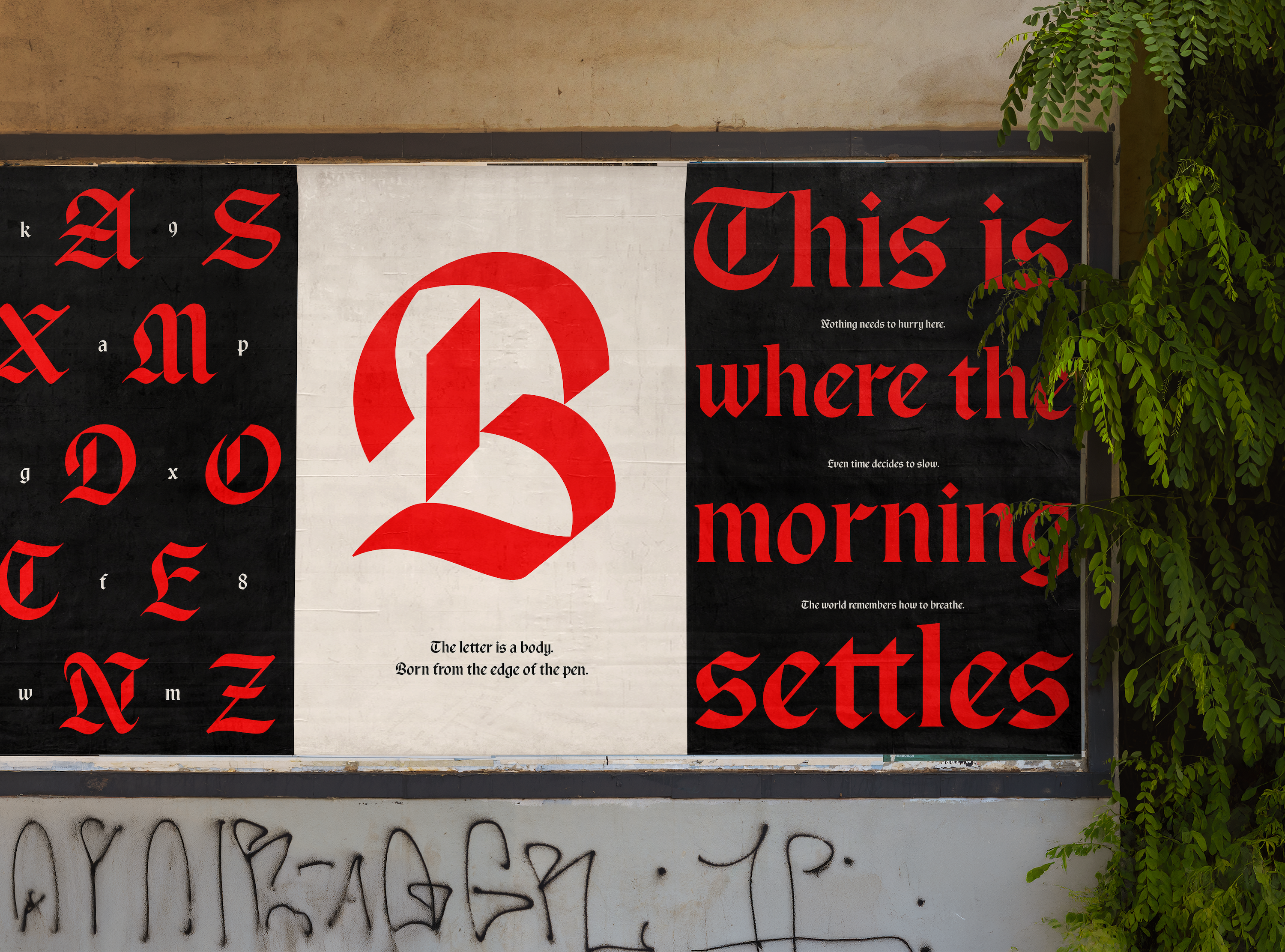 The process began with research into Rotunda manuscripts and early blackletter specimens to understand their structural logic rather than their ornament. Instead of tracing or directly reviving historical forms, the focus was on analyzing stroke construction, rhythm, proportions, and counter shapes.