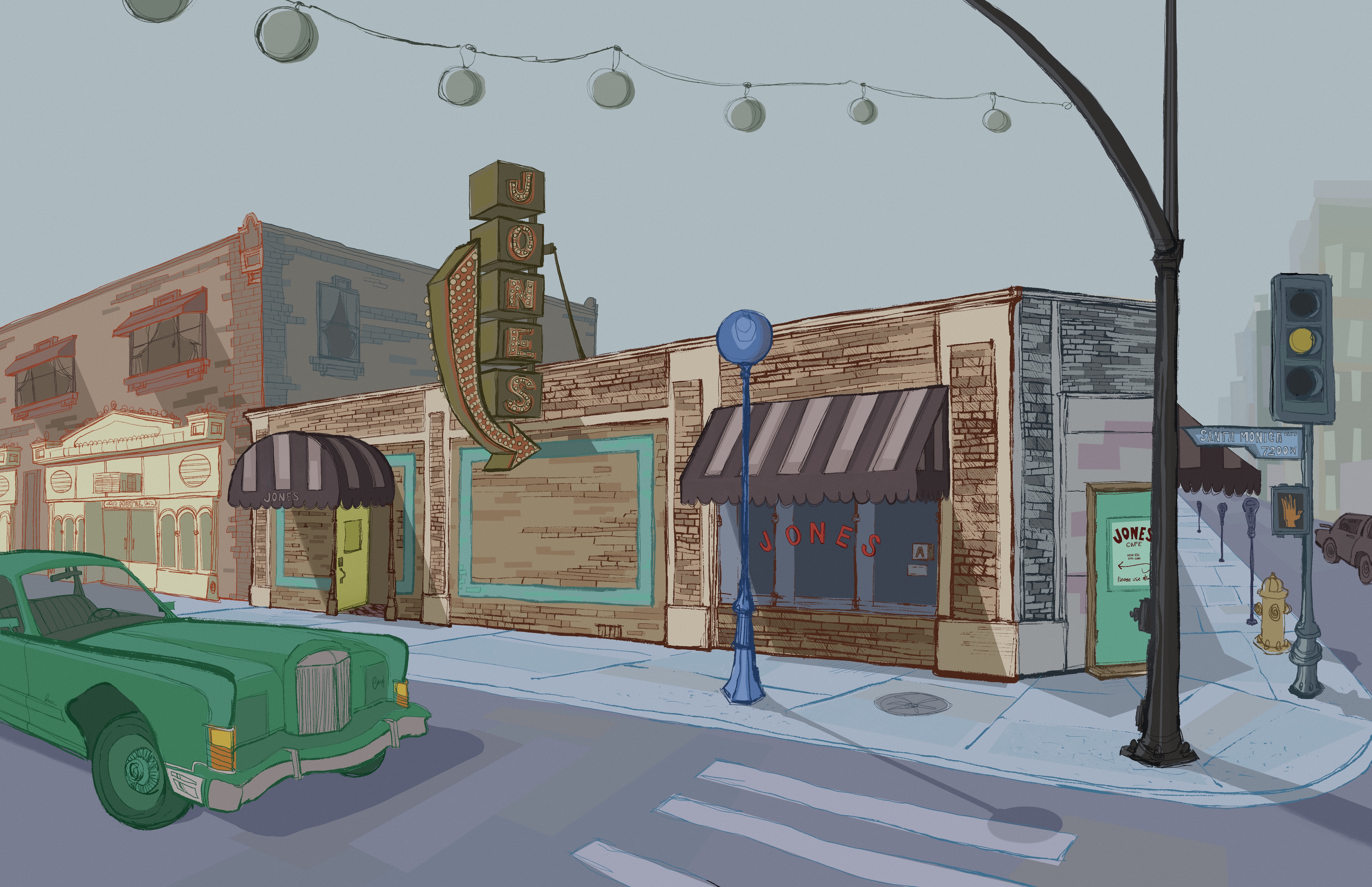 Graduates Select DepartmentBrand Design & StrategyCreative DirectionEntertainment DesignFilmFine ArtFurniture, Lighting and FixturesGraduate ArtGraduate FilmGraduate Graphic DesignGraduate Interaction DesignGraduate Spatial Experience DesignGraphic DesignIllustrationIndustrial DesignInteraction DesignMedia Design PracticesPhotography and ImagingProduct DesignSpatial Experience DesignTransportation DesignTransportation Systems and Design Back to Projects Morgan Schmitz BFA in Illustration - Entertainment Arts — Illustration Course: 339 Graphic Design for Entertainments Arts Jones Hollywood Storefront Storefront daytime illustration of Jones Hollywood, honoring one of my favorite restaurants in all of Los Angeles. Image Image