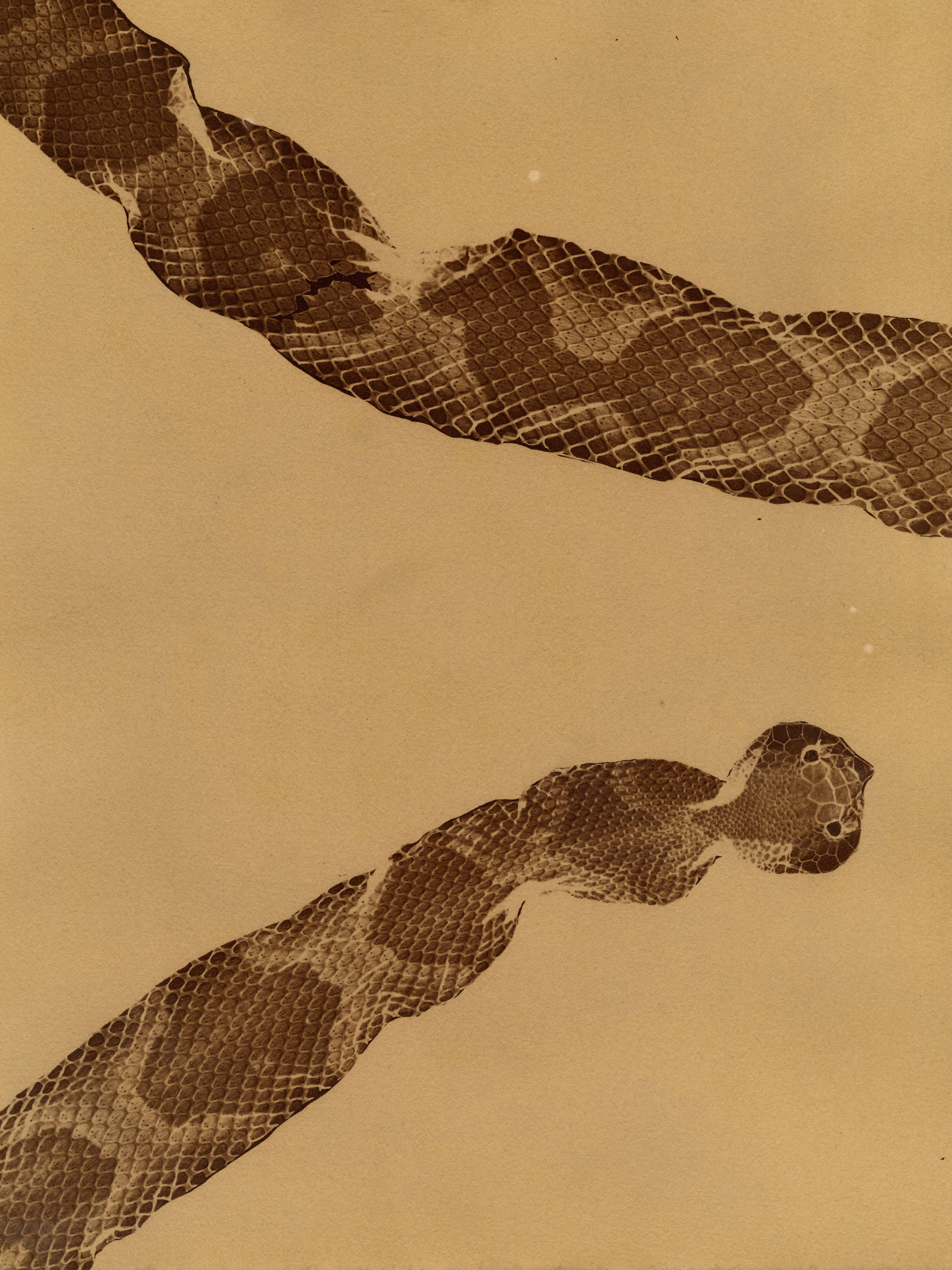 A cyanotype created from directly exposing the shed skin of an Eastern Copperhead, a highly misunderstood and hated venomous snake from the southeast.