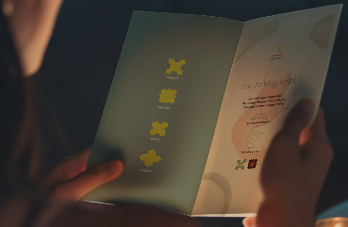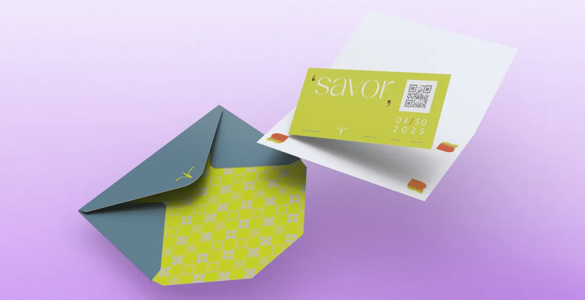 An invitation to Rupa Rasa’s debut tasting event 'Savor'. Opening the envelope becomes an act of discovery: the brand’s batik-inspired pattern reveals itself inside, reflecting the restaurant’s layered approach to flavor, form, and cultural narrative.