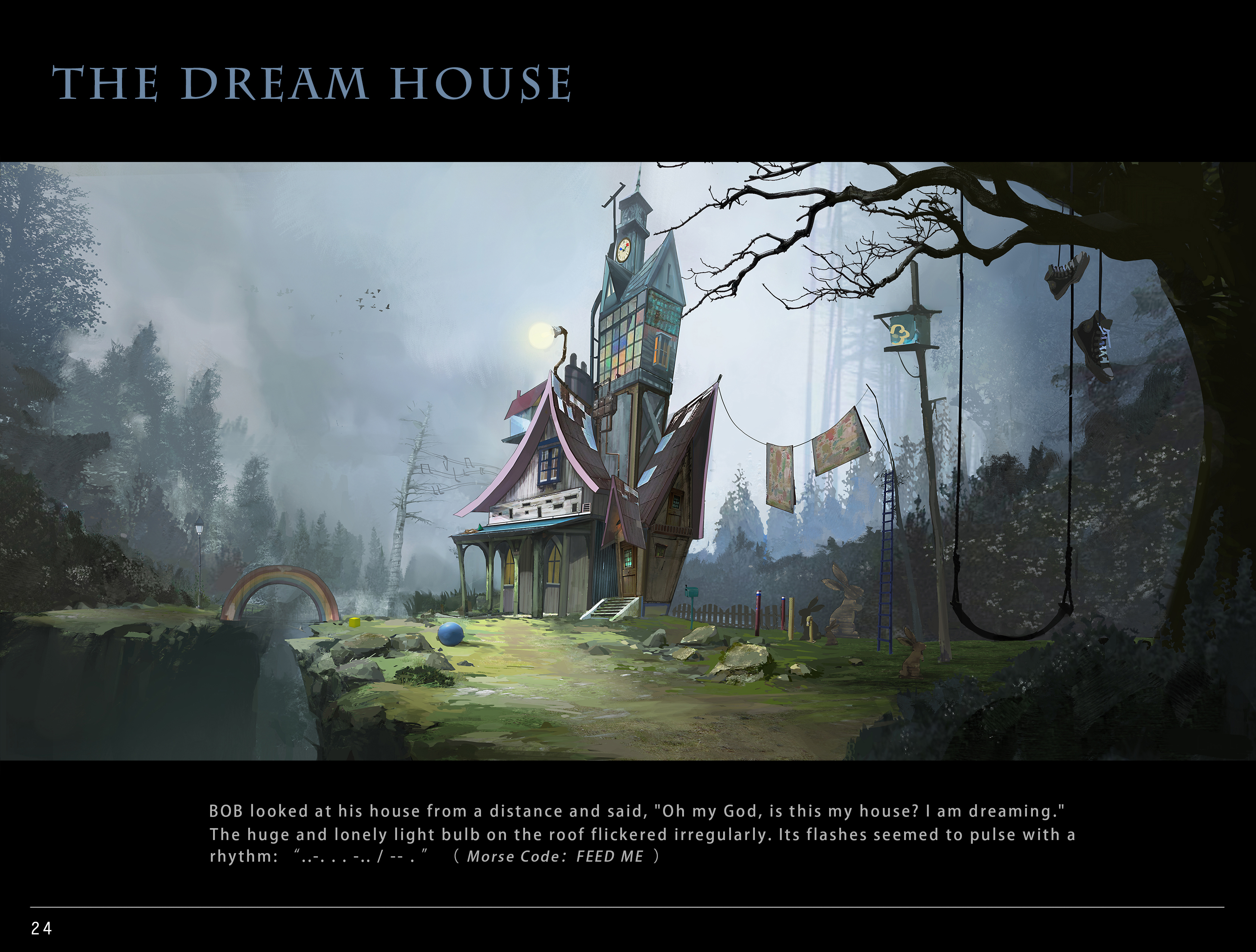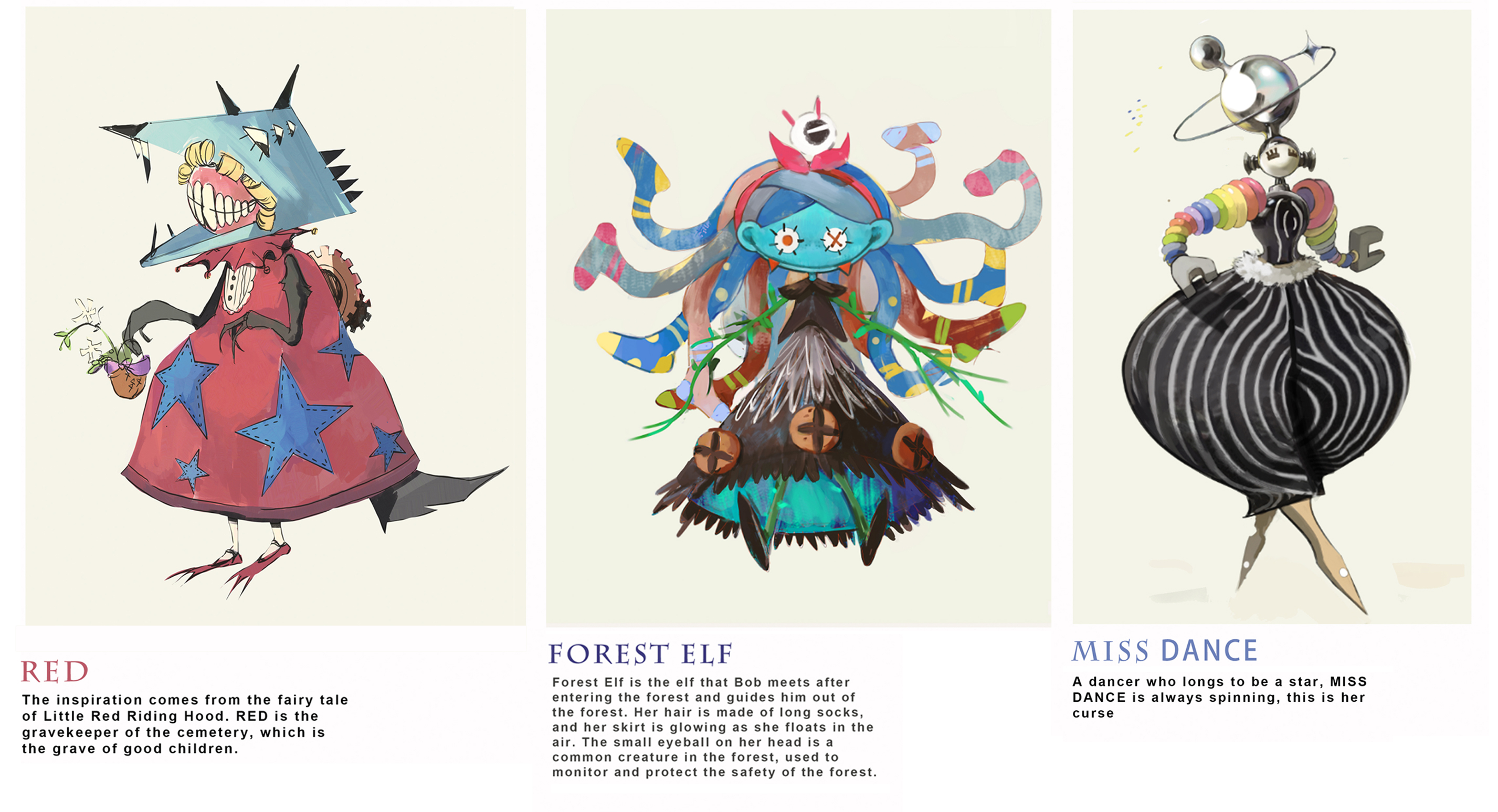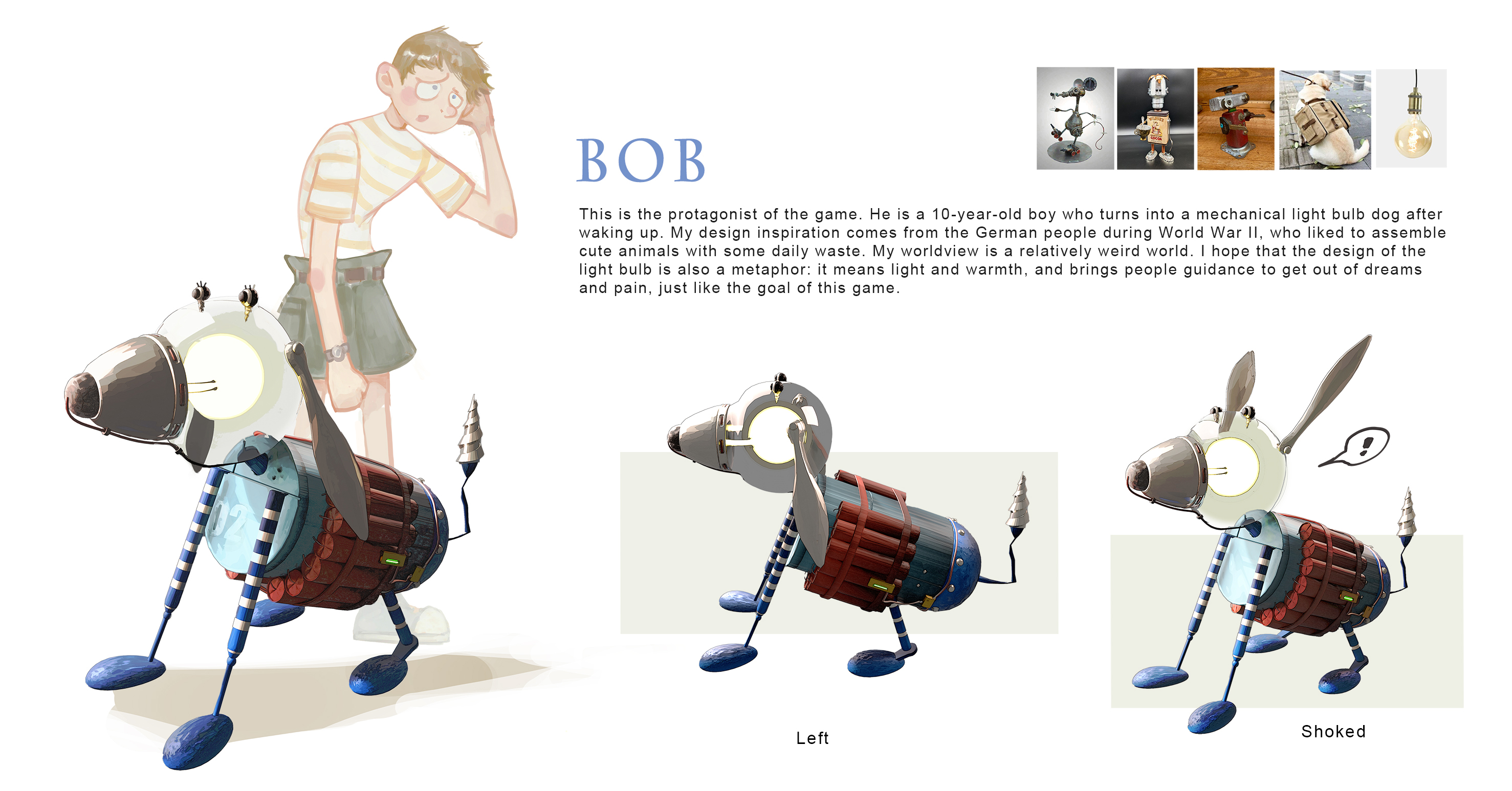My project tells a fantasy story about a boy who wakes up as a light-bulb dog. He searches for a way back in this strange and crazy world. The art style is more like a gloomy and surreal fairy tale.
