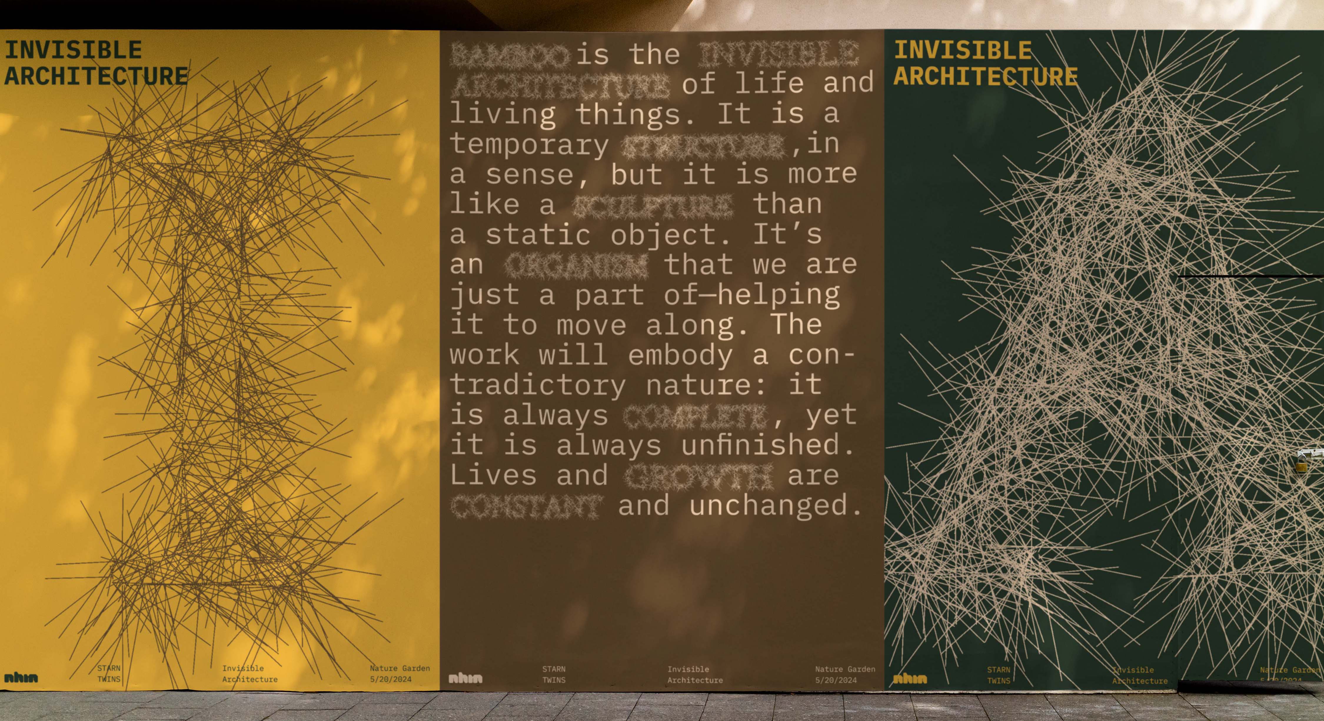 Invisible Architecture is a site-specific bamboo art installation by the artists the Starn twins, which will be exhibited at the NHM (Natural History Museum). Bamboo is the fastest-growing plant. Inspired by that, I created a generative functional website. People can build their own typographic bamboo sculptures when they browse this website.