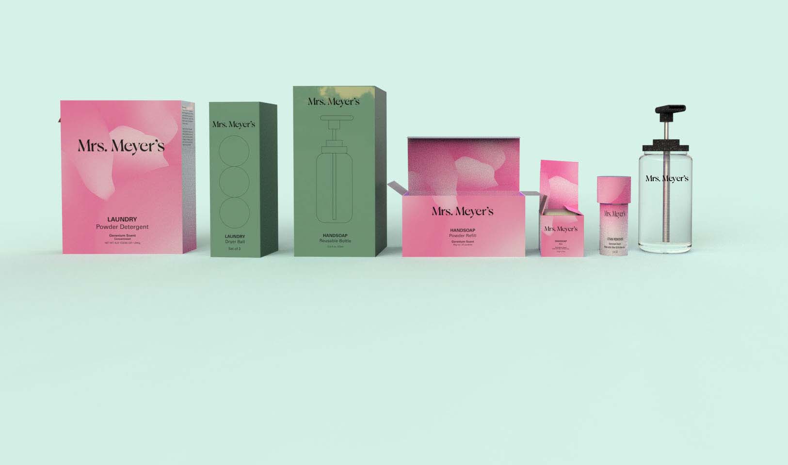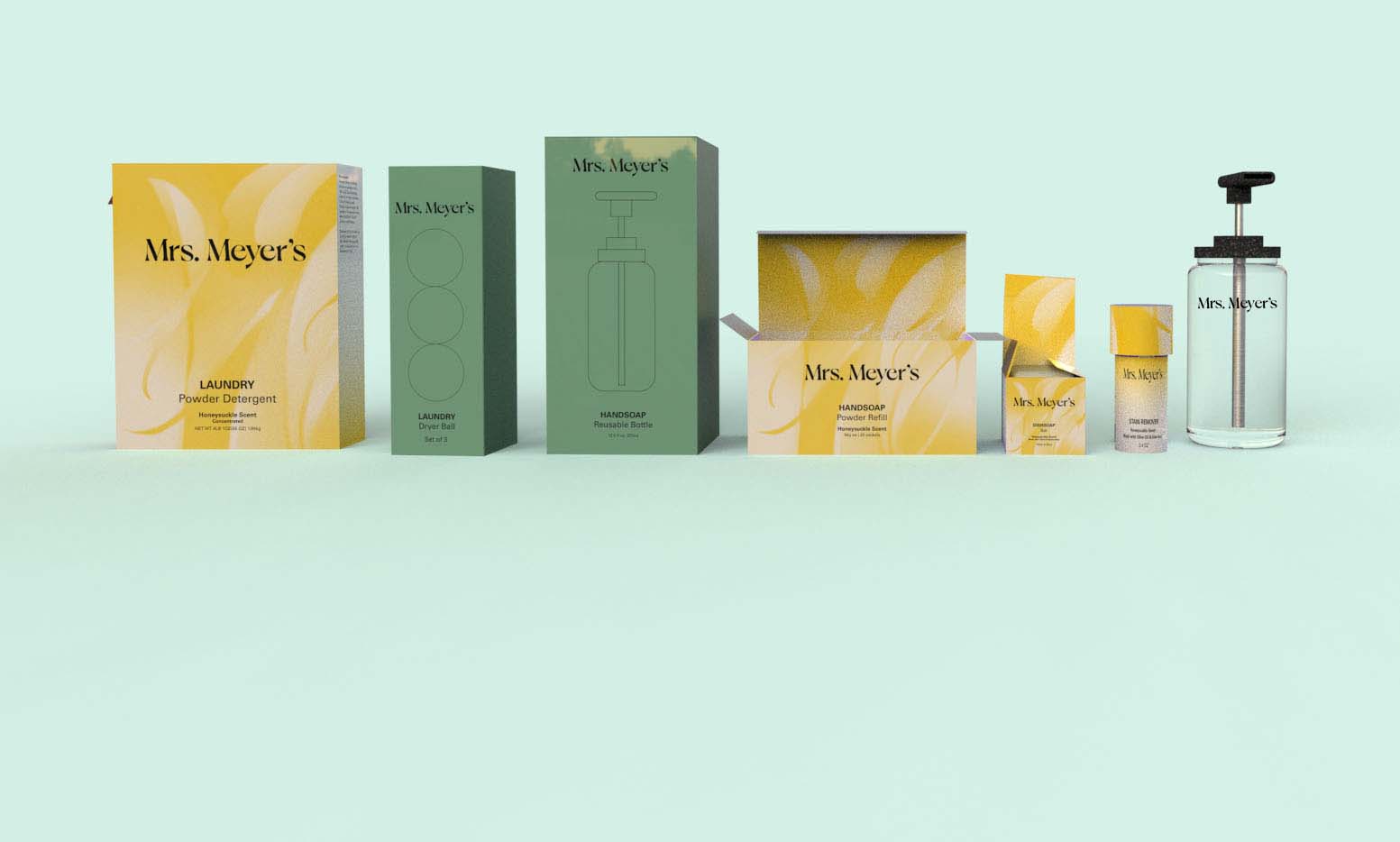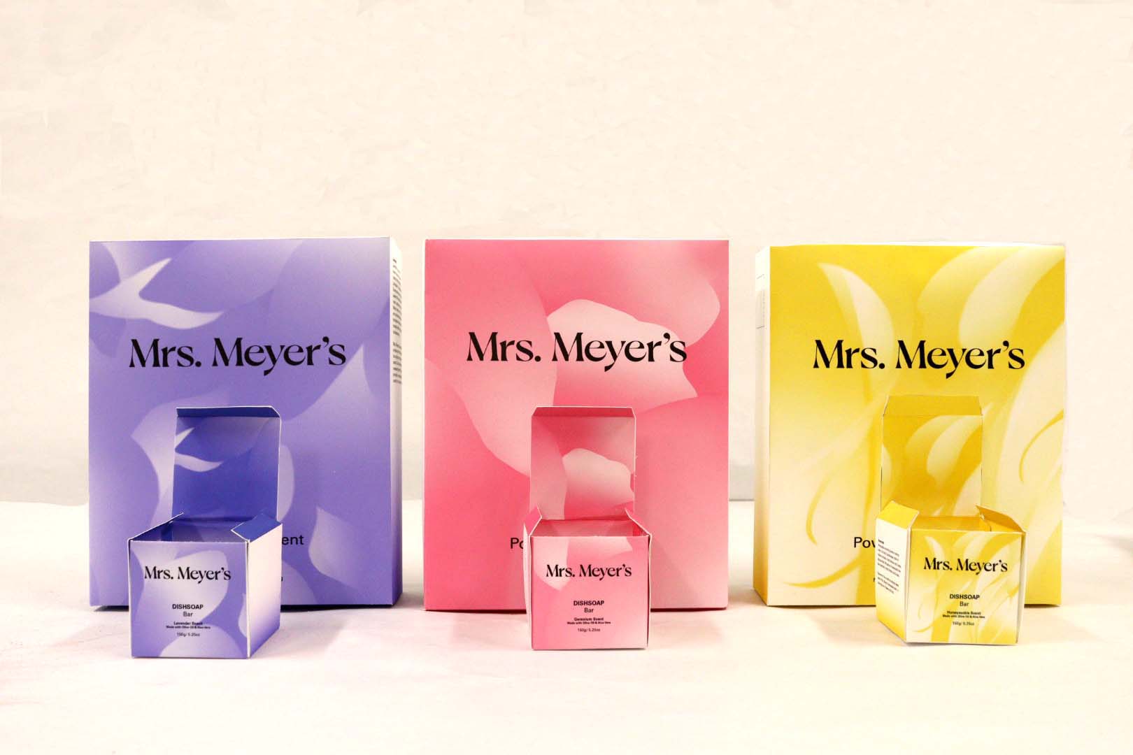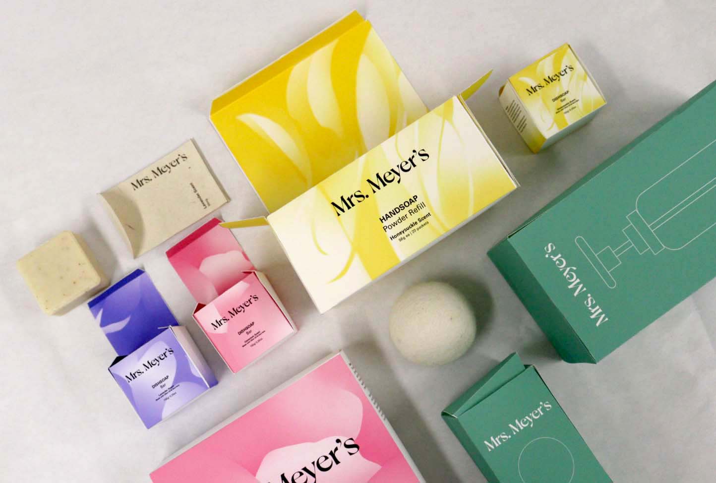 Rebrand Mrs. Meyer's cleaning product line. My 5 products are Dishsoap Bar, Laundry Detergent powder, Handsoap powder refill and laundry dryer ball.