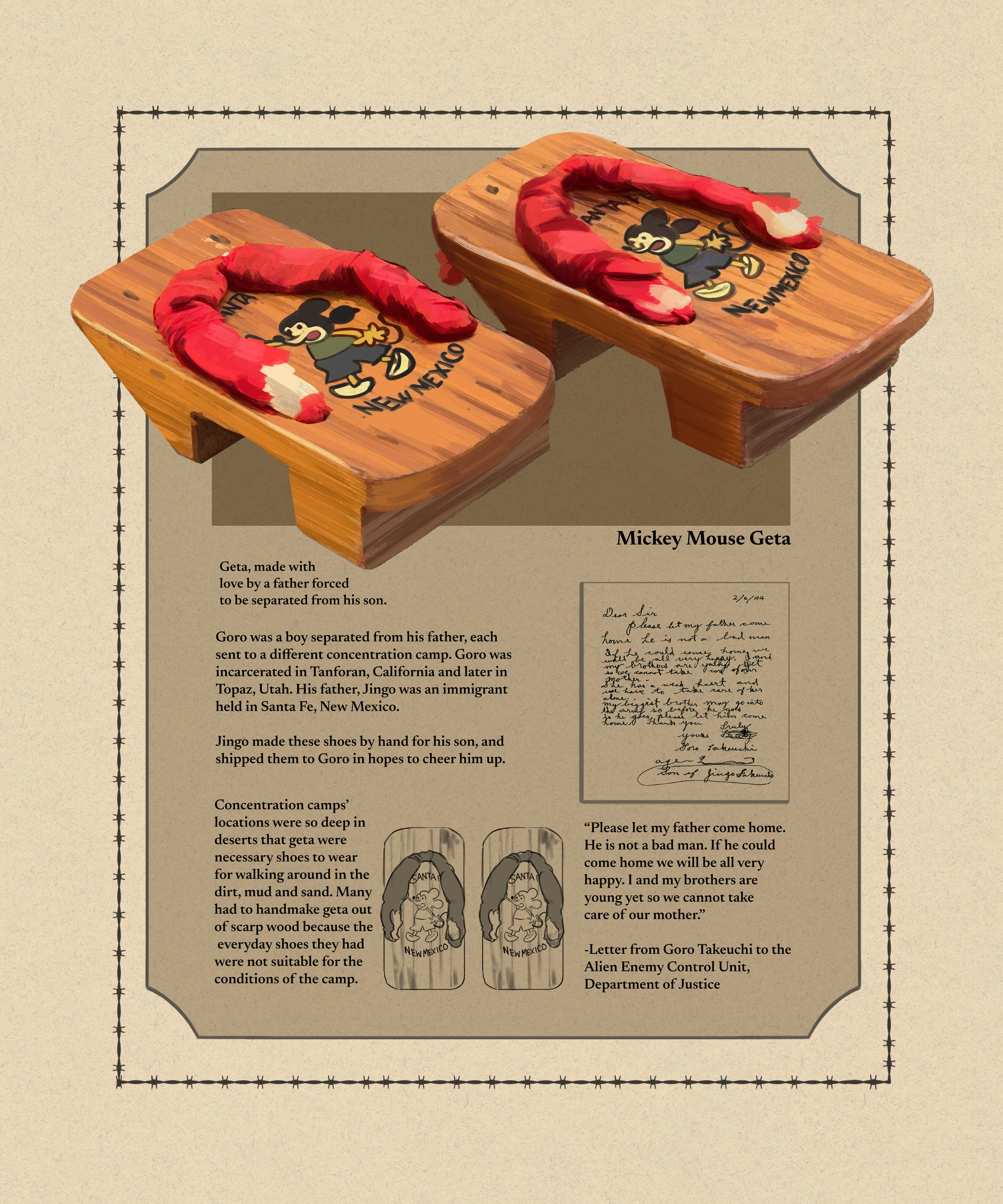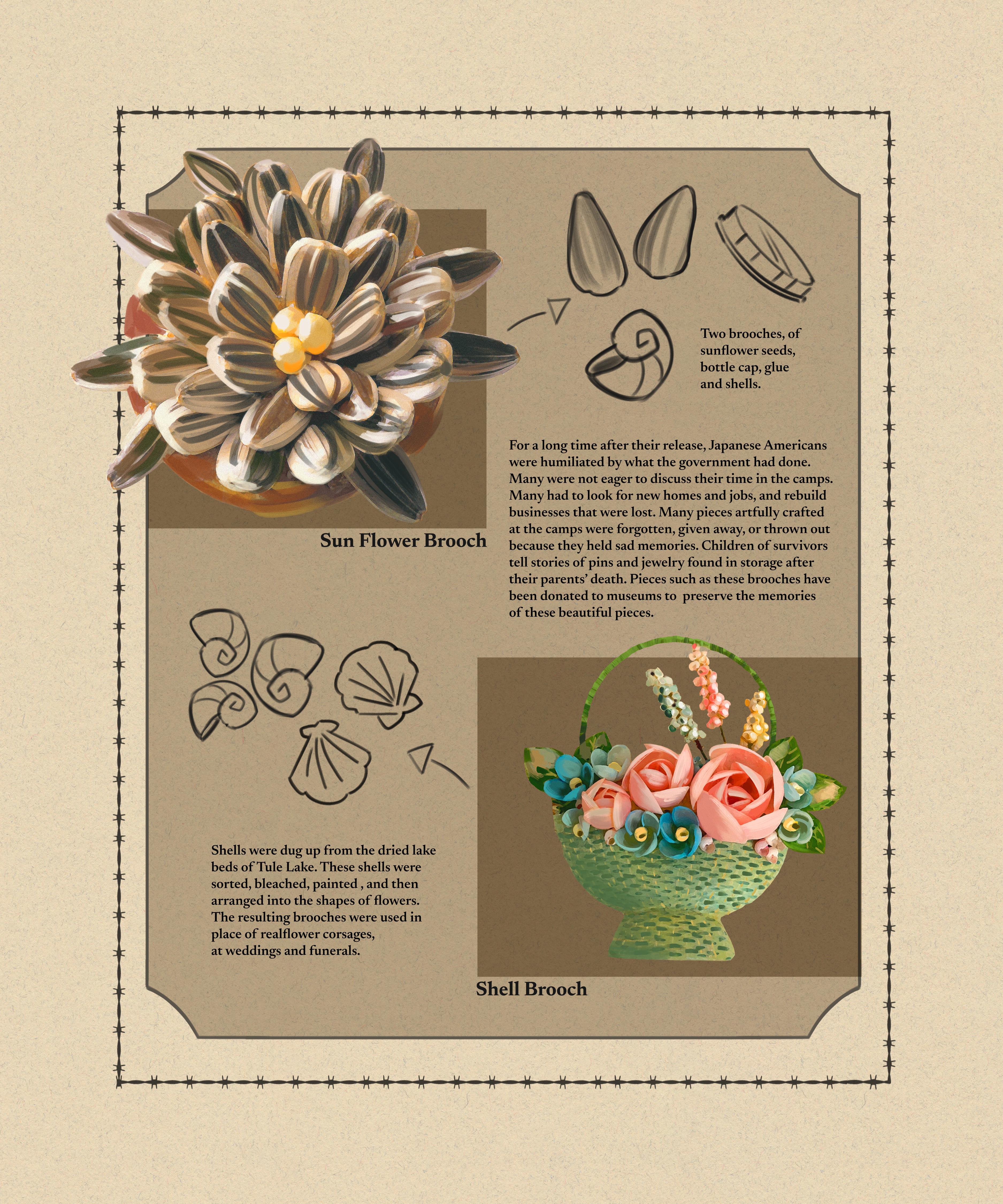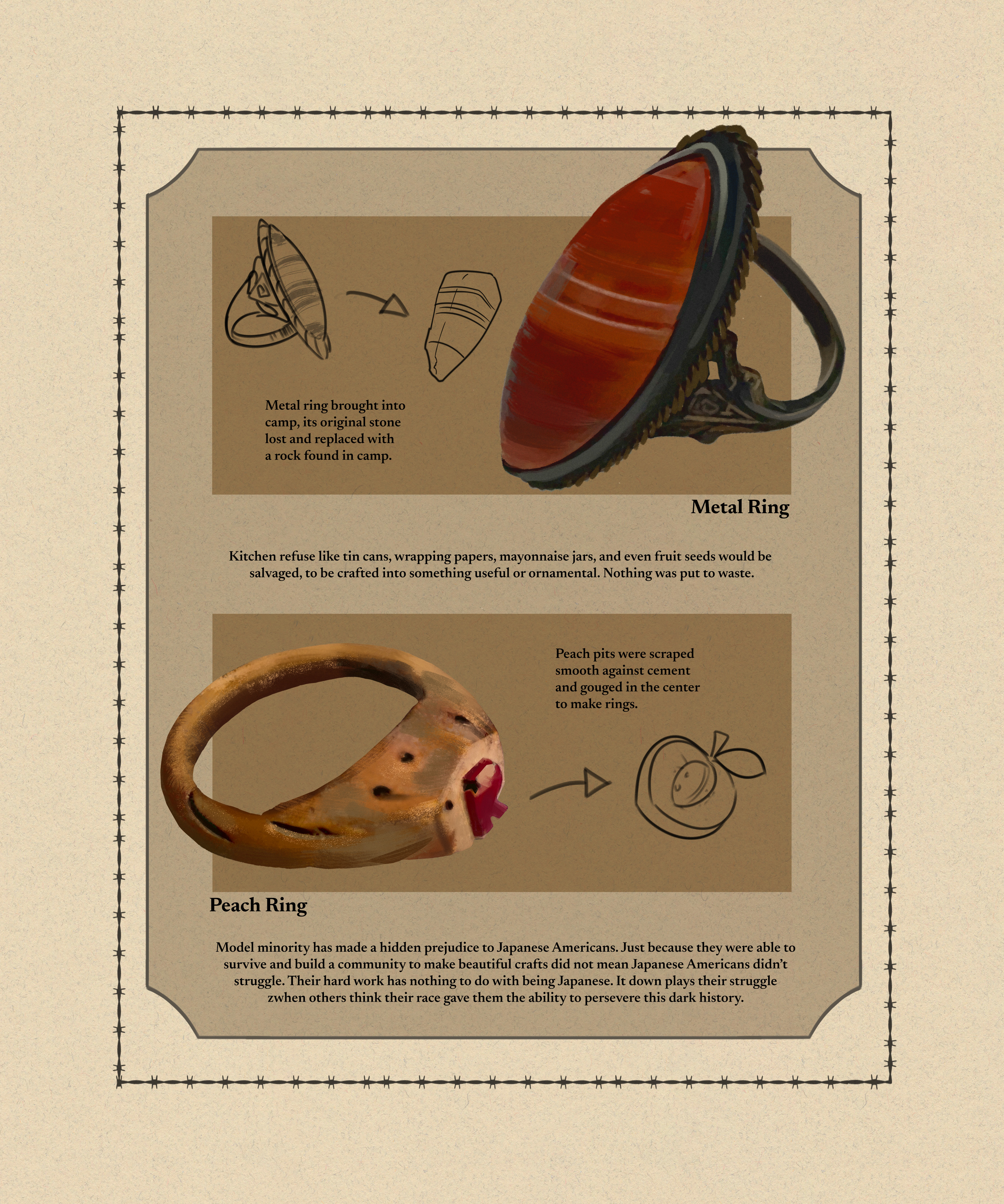 These four posters illustrate handmade objects of real pieces made in concentration camps.The goal was to create public displays and educational materials that authentically convey the experience of Japanese Americans who were unconstitutionally detained in World War II-era concentration camps. This was displayed in the Armory Center for the Arts Mezzanine.