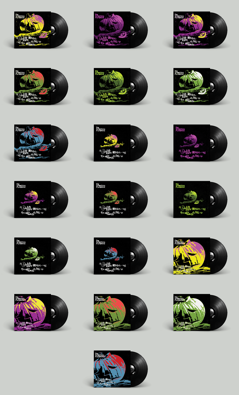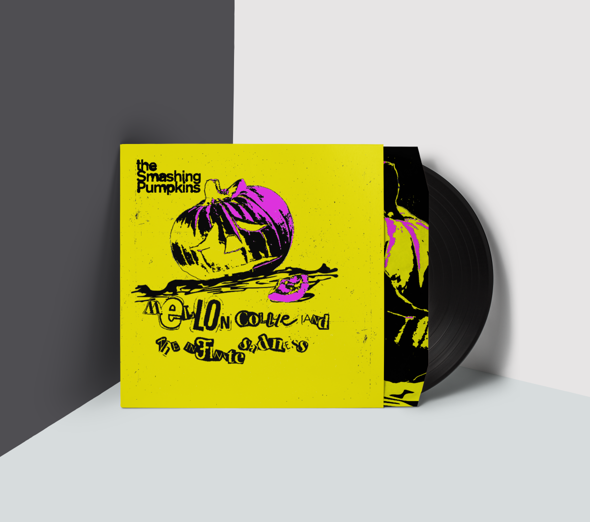 A mockup portraying the final reimagining of the popular Smashing Pumpkins album 'Mellon Collie And The Infinite Sadness' in the style of 1970s punk (inspired by Jamie Reid). After revisiting and finalizing the colorway, the cropping of the cover's elements found many variations until the final mid-way cropping was created.